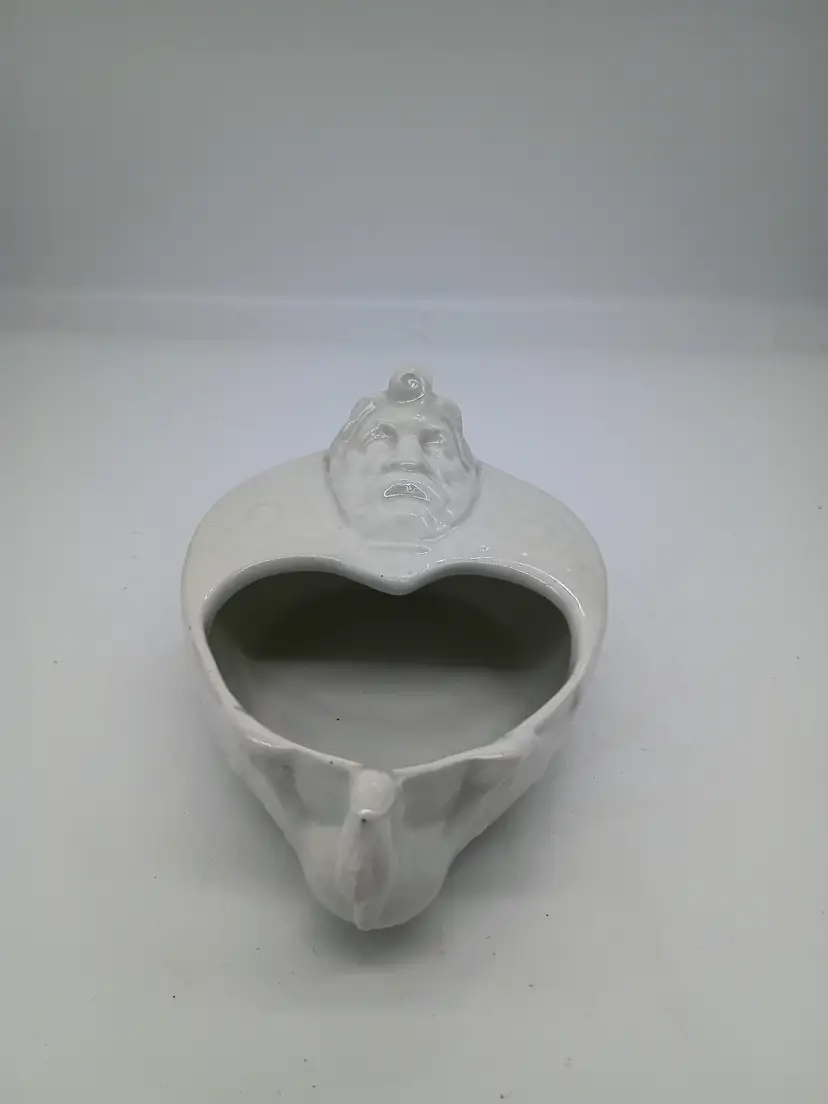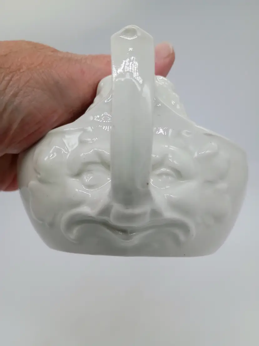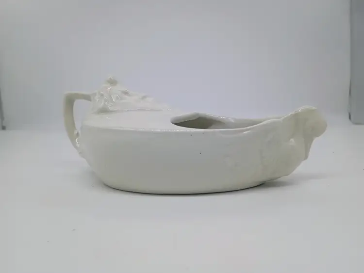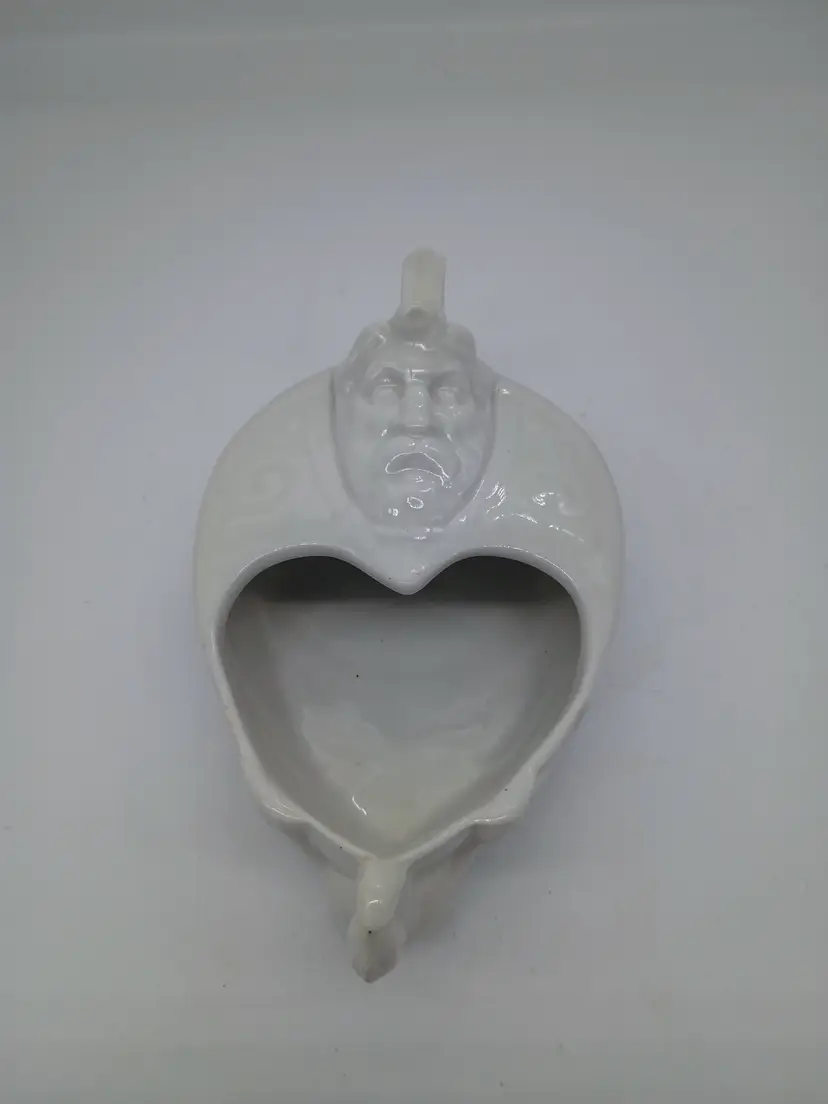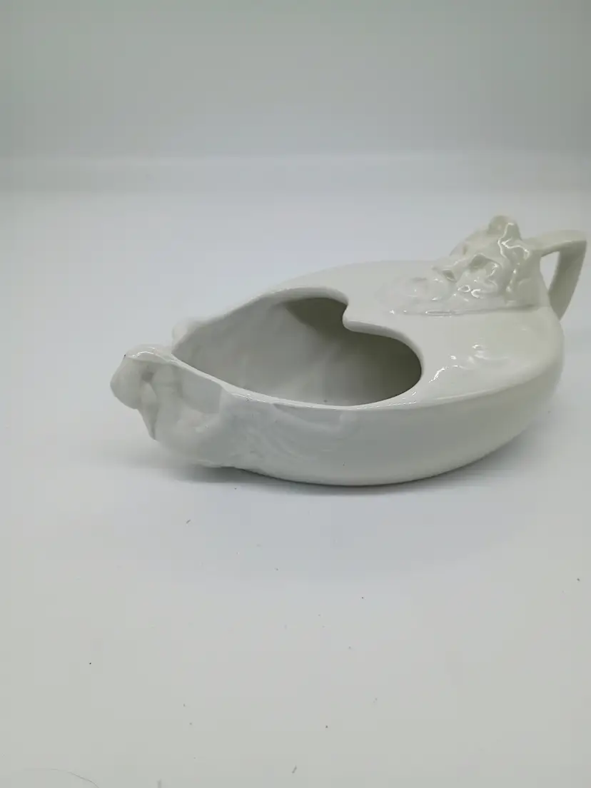 Rare Unique Antique Cauldon Pottery Figural Sauce Boat Gravy Boat Alter Bowl. Swan Spout and Mans Face on Handle and body of dish. This is 3 inches tall, about 2.5 inches deep, 8 inches long and 5 inches at widest point. This is Art Deco /Greek Revival/ Celtic in design depending on how you read the symbolism, It could be Zeus in his forms of Swan or The Greenman and Swan ( Celtic). There are no chips cracks or flea bites, slight crazing no discoloration. Excellent condition. I can't find the name of this pattern but it is very old and really unique I can't find another one anywhere exactly like it. I did find a single tea cup that was dated from same time period and year but they didn't have a pattern listed circa early 1900's. Ships USPS domestically and UPS worldwide