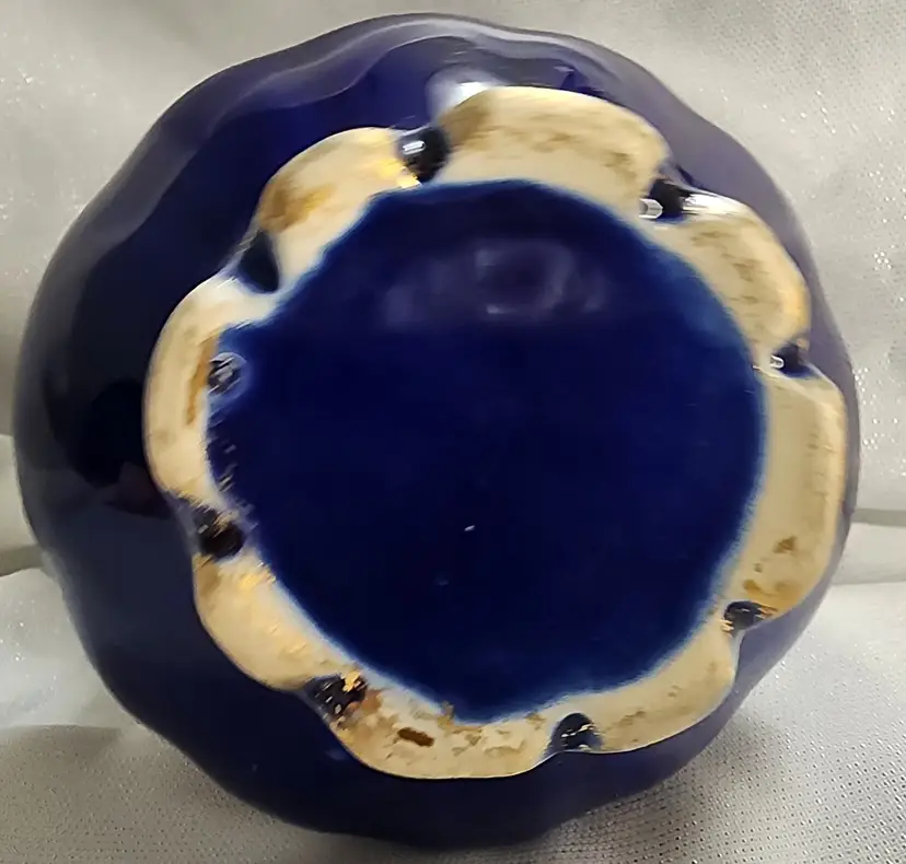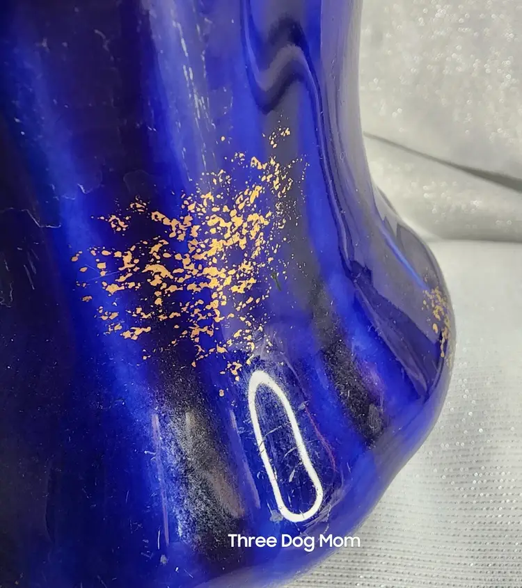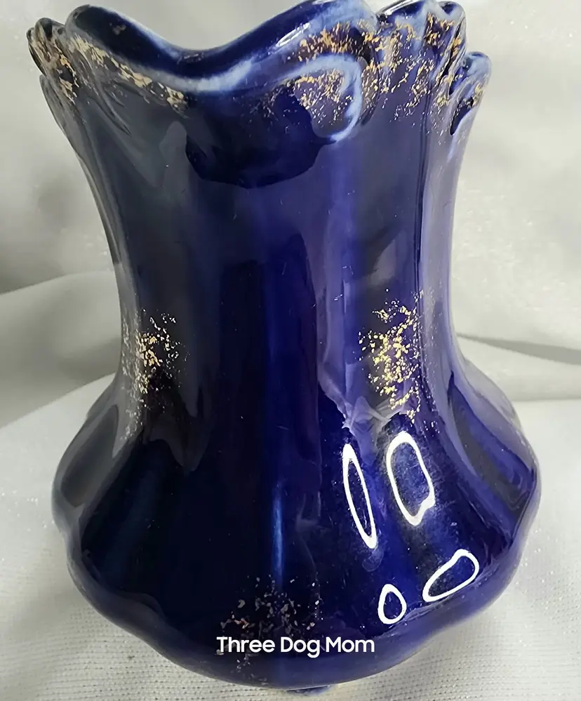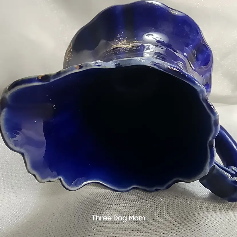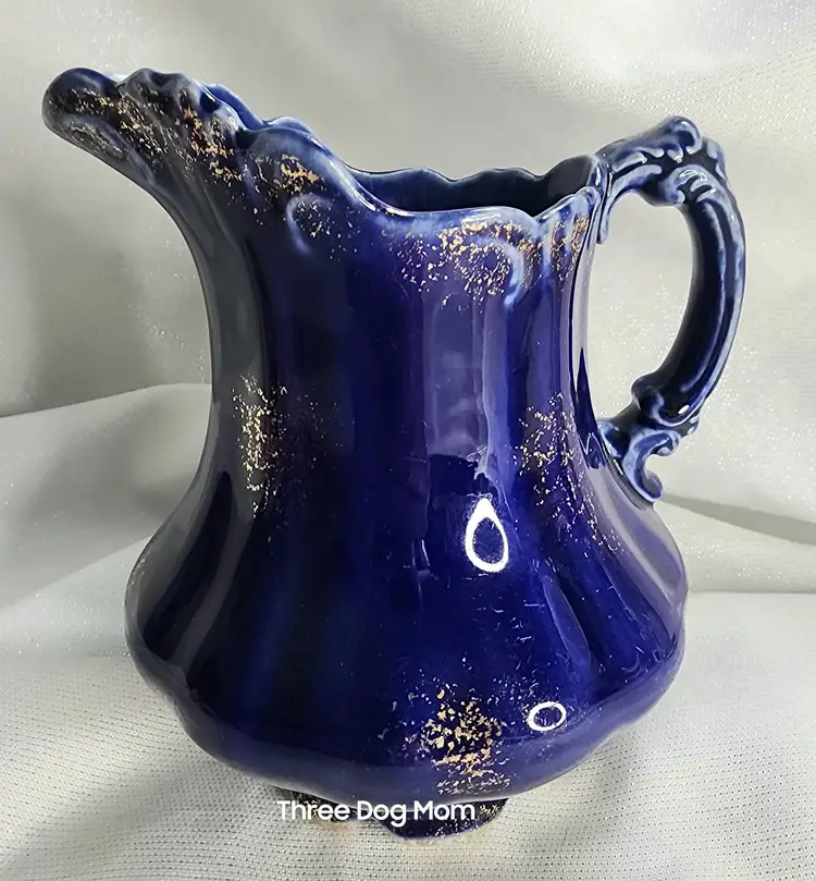 Antique pottery jug / pitcher, cobalt blue with sprayed gold accents. No maker mark, but probably made in Ohio River area around 1900. Very nice condition, some light marks on body, no chips, cracks or repairs
