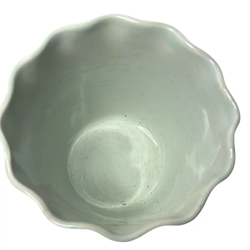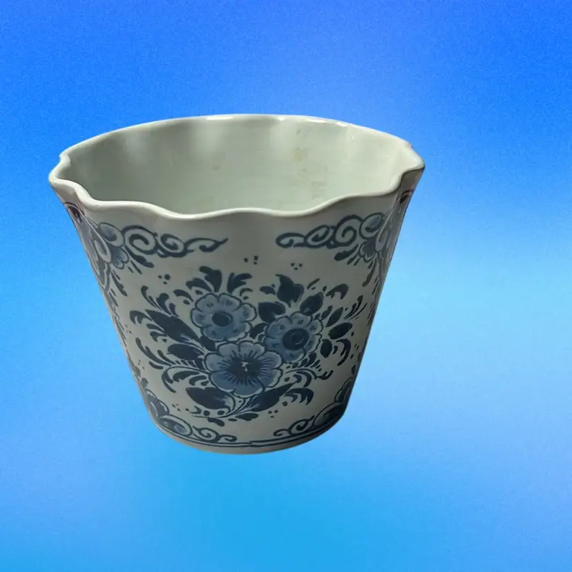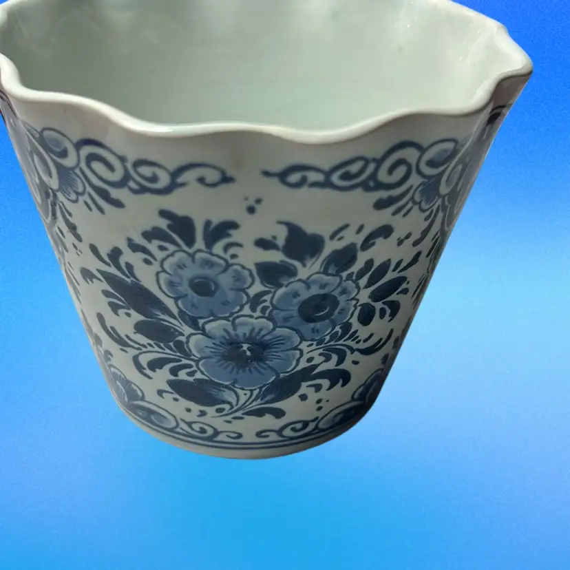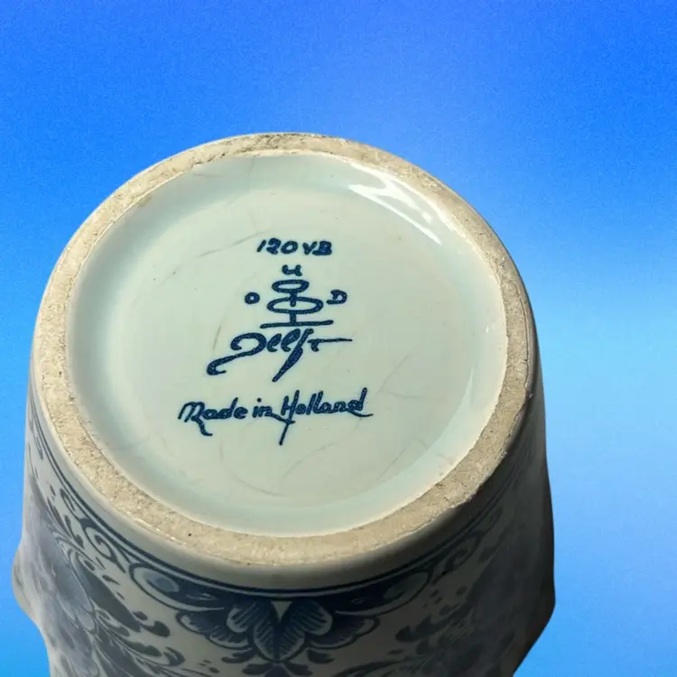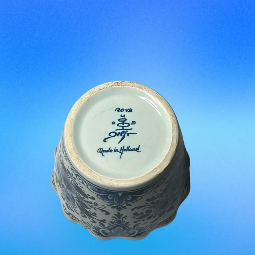 Tin glazed with blue florals and intricate designs. The markings on the bottom date this piece to the 1925. Increasing its value. No damage and measures 5” wide & 4.5” high