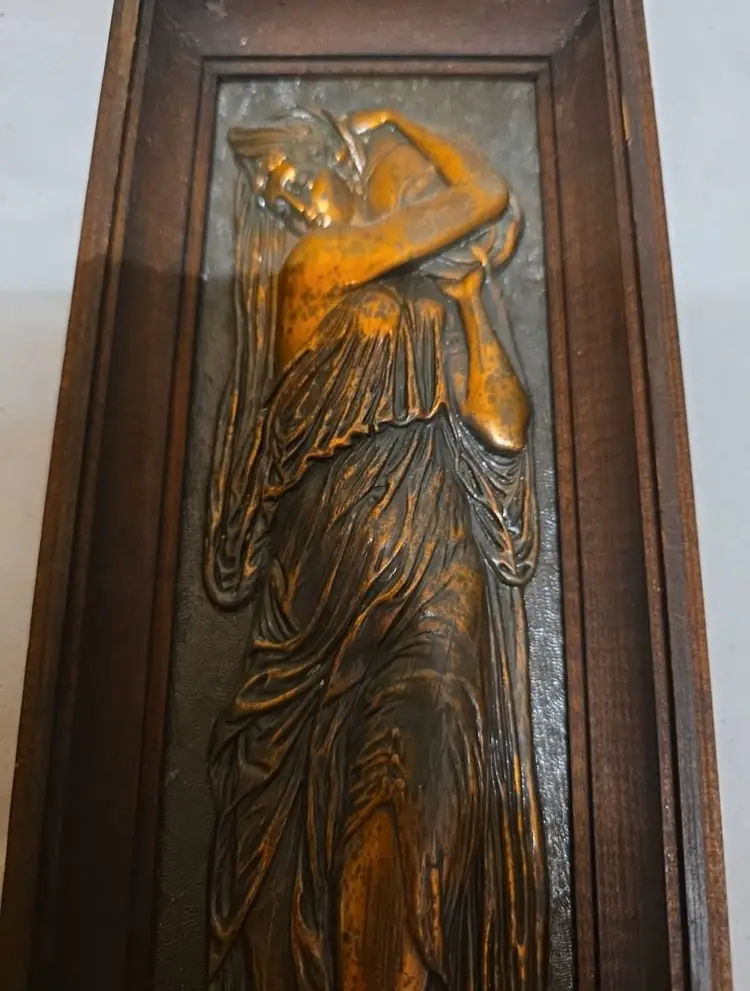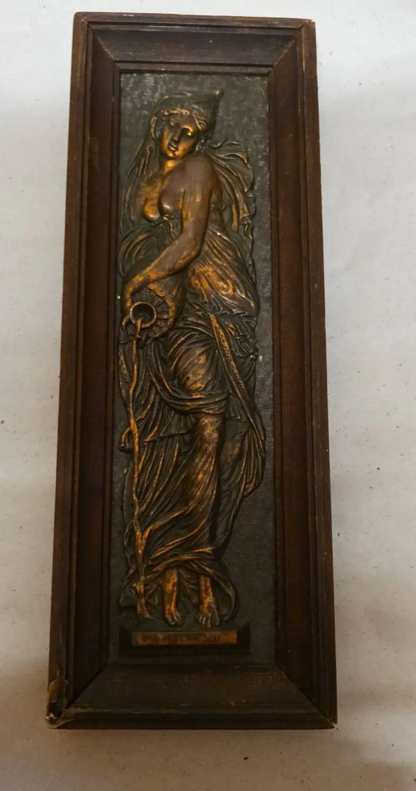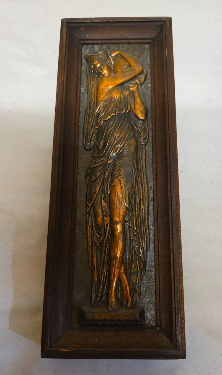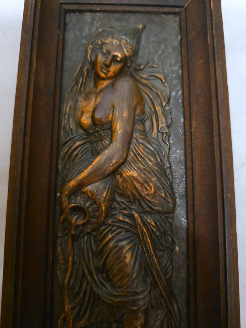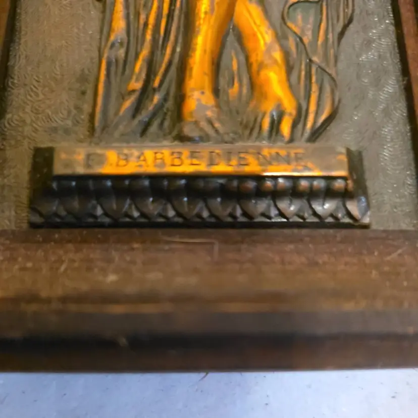 The Antique F. Barbedienne Pair of French Bronze Resin Plaques featuring Greek Maidens framed in an Art Deco style is a handmade licensed reprint from France. The relief prints are portrait-oriented and signed by F. Barbedienne, measuring 12.5 inches in height and 4.5 inches in width. Made from bronze resin using a cast production technique, these unique plaques showcase elegant women as the subject, adding a touch of sophistication to any space.