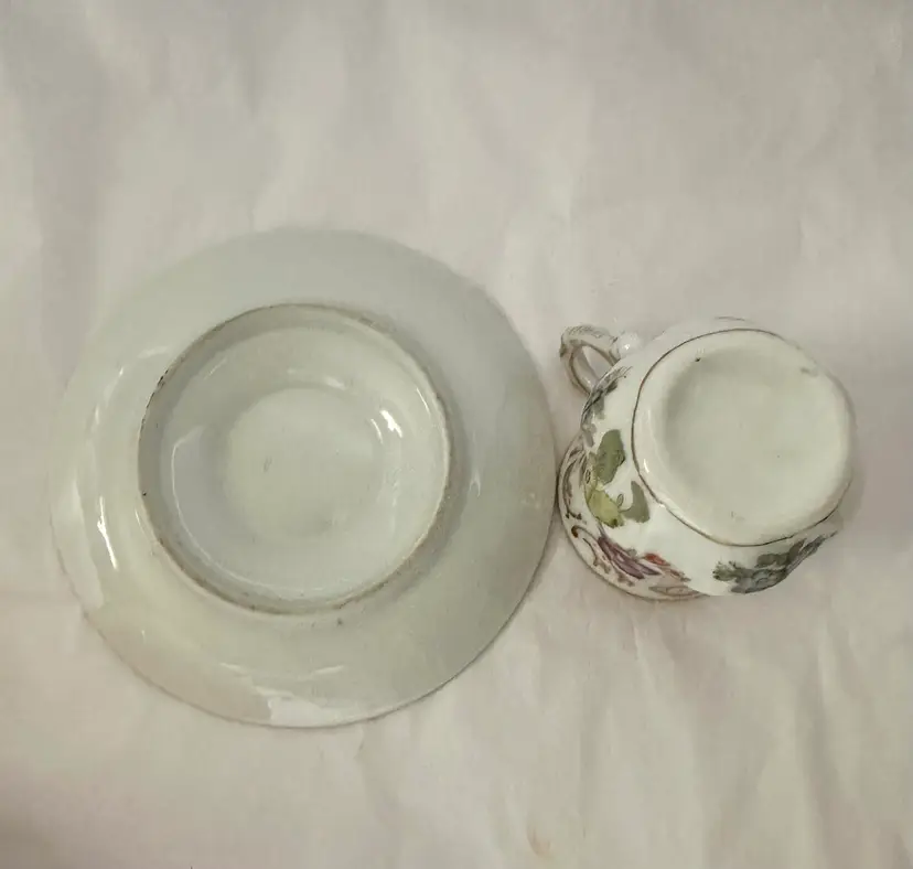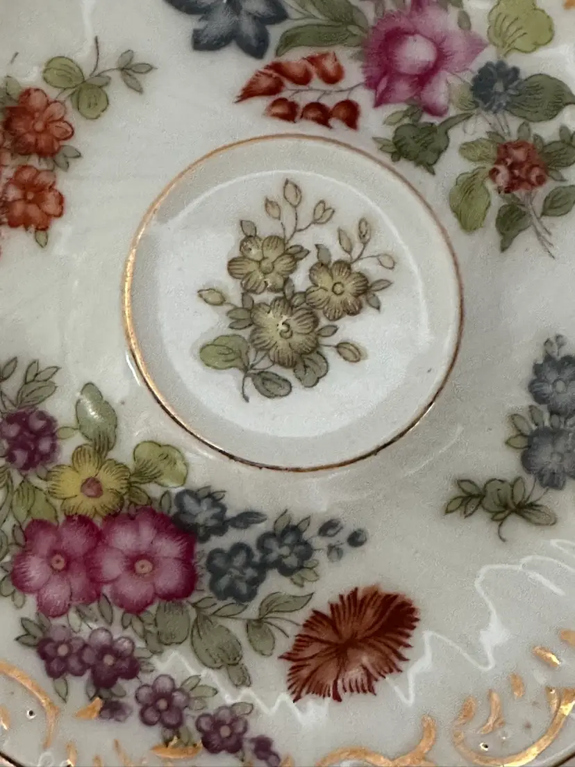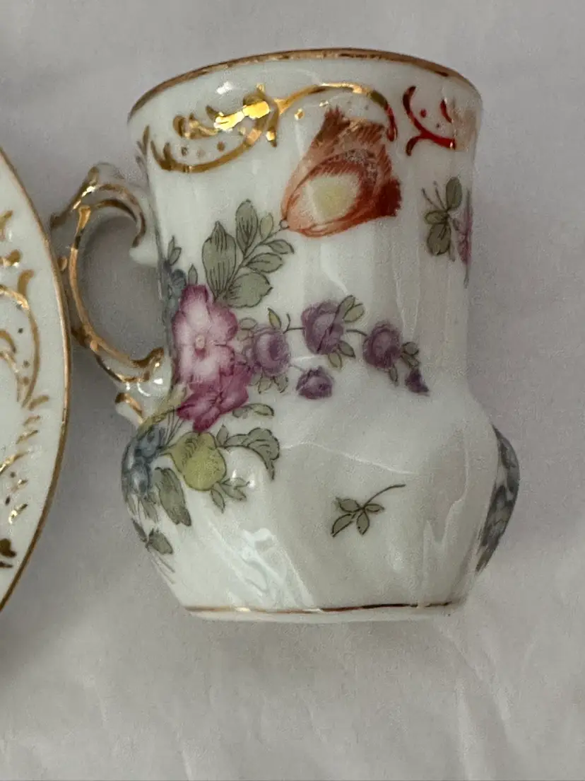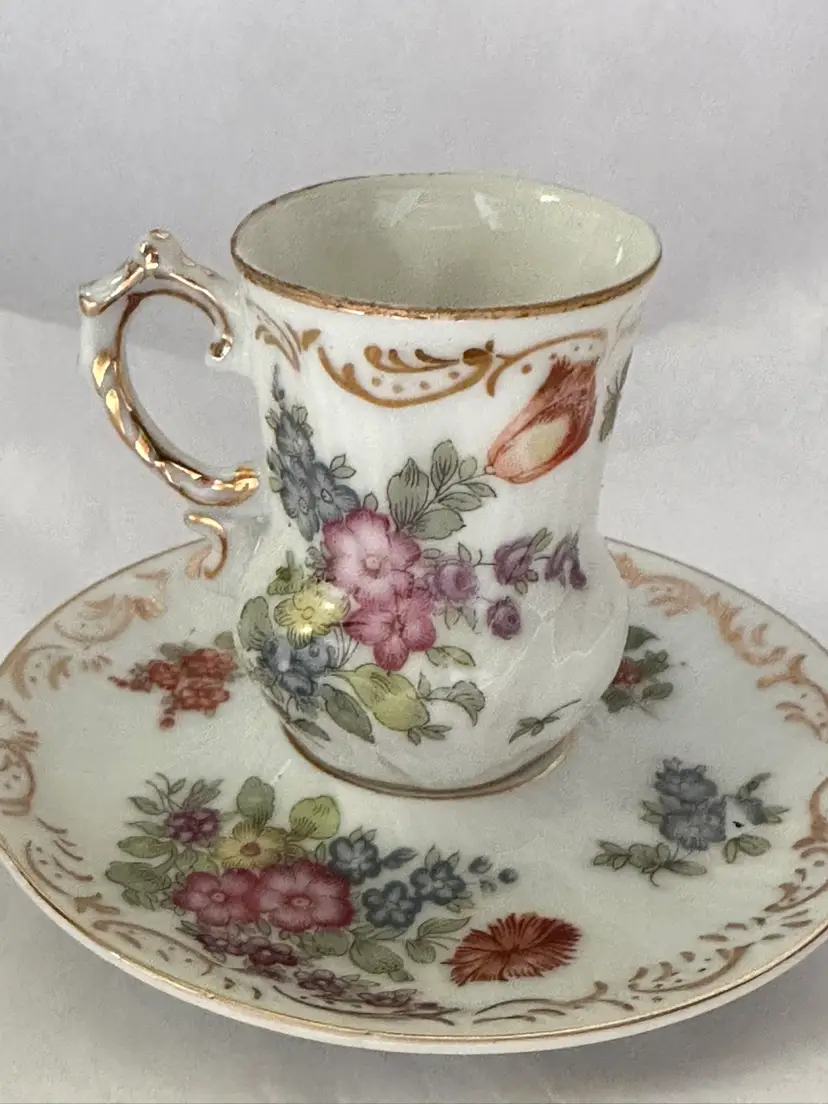 Beautiful antique demitasse cup and saucer. It is French porcelain with gold trim accent and colorful floral design. The cup is 2.5”, the saucer is 4.25”. Excellent condition.
