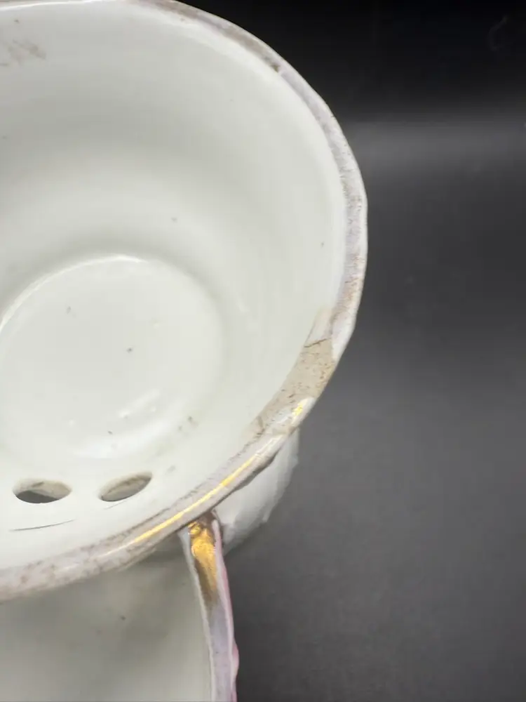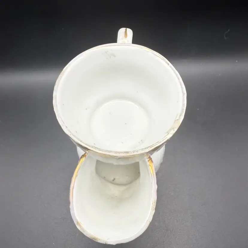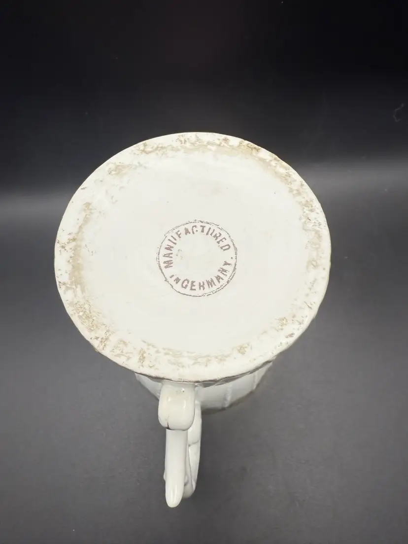 This particular scuttle, with its ribbed detailing, gold accents, and a distinctive pink shell-shaped spout, suggests a decorative style popular in the early to mid-20th century. Such items were often manufactured in Germany, known for its ceramic production, and were common household items for gentlemen who valued traditional grooming practices.