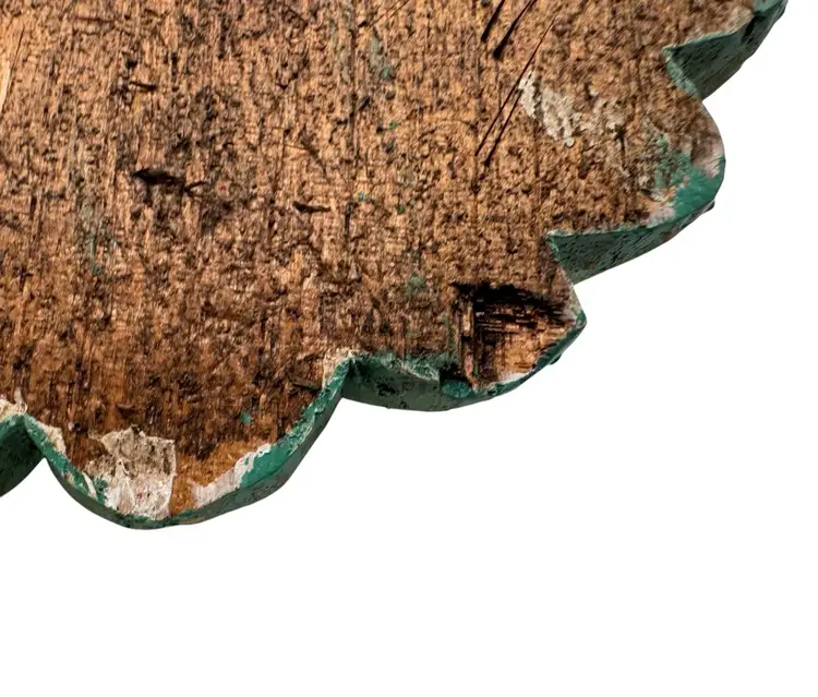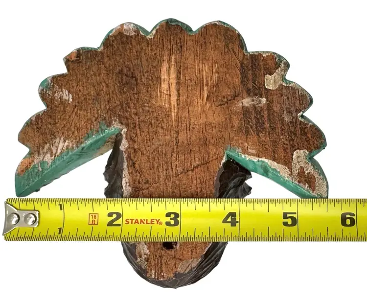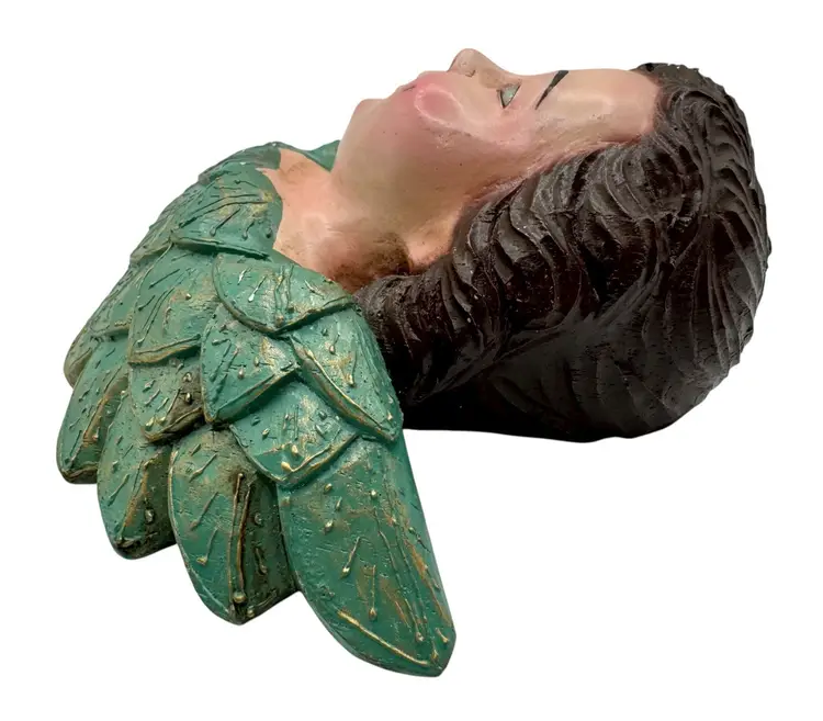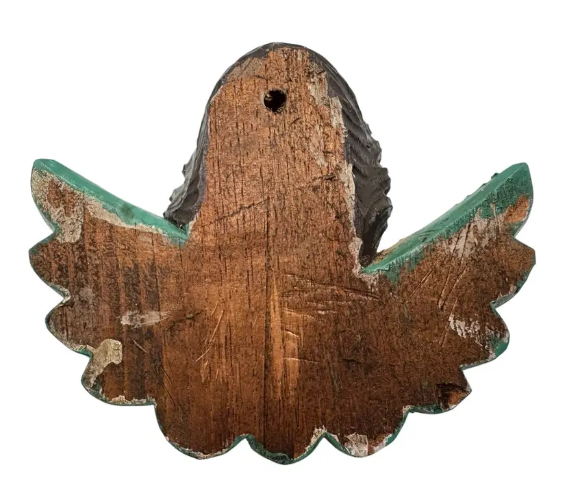 Beautifully painted wood cherub with blue wings and realistic eyes.