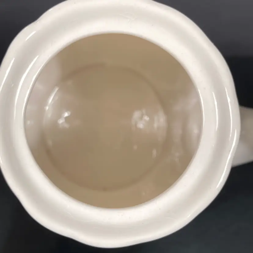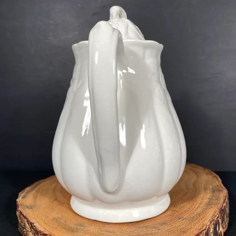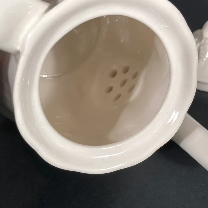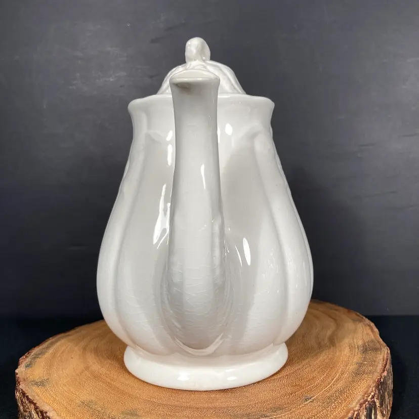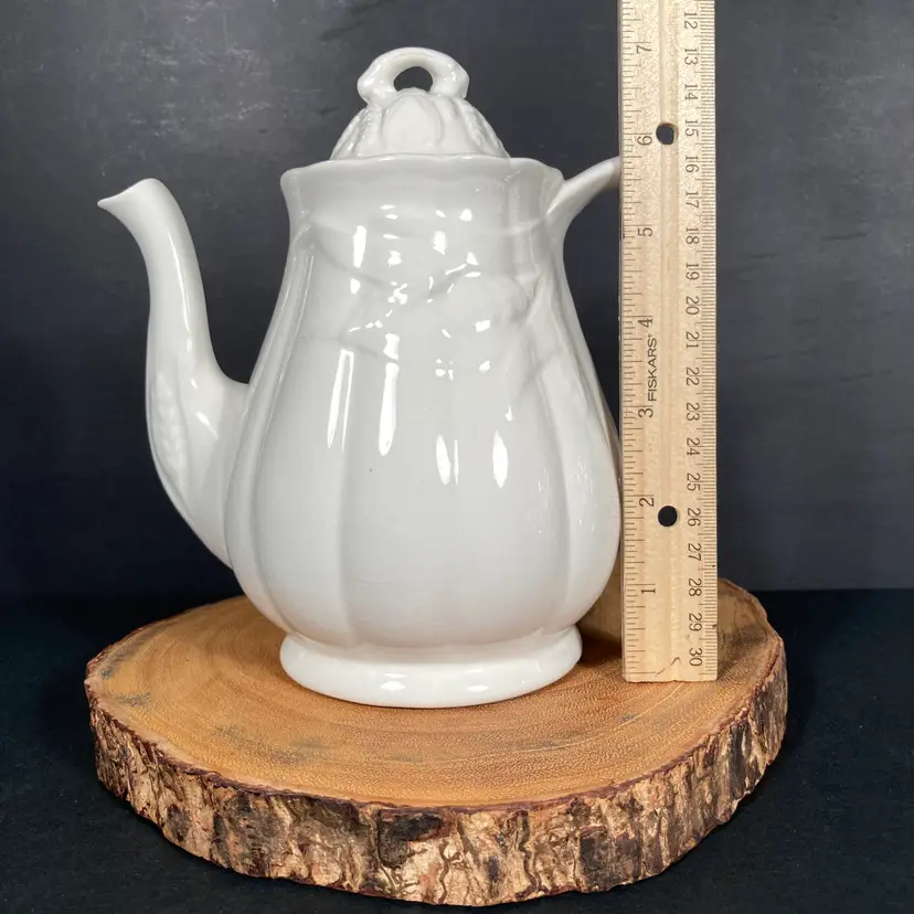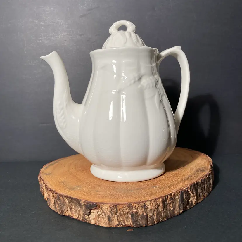 The graceful Wheat pattern decorates both the teapot body, spout, and lid. The vessel has an internal strainer at the base of the spout (inside). No apparent staining indicating little use, if any, for table service.