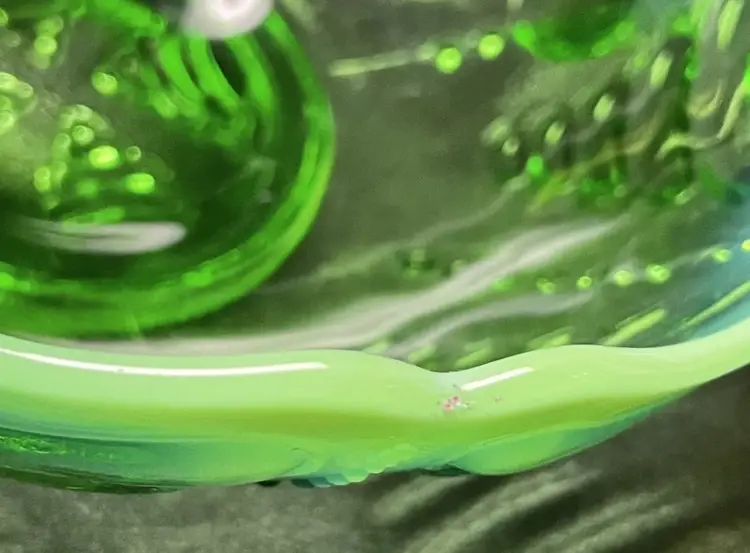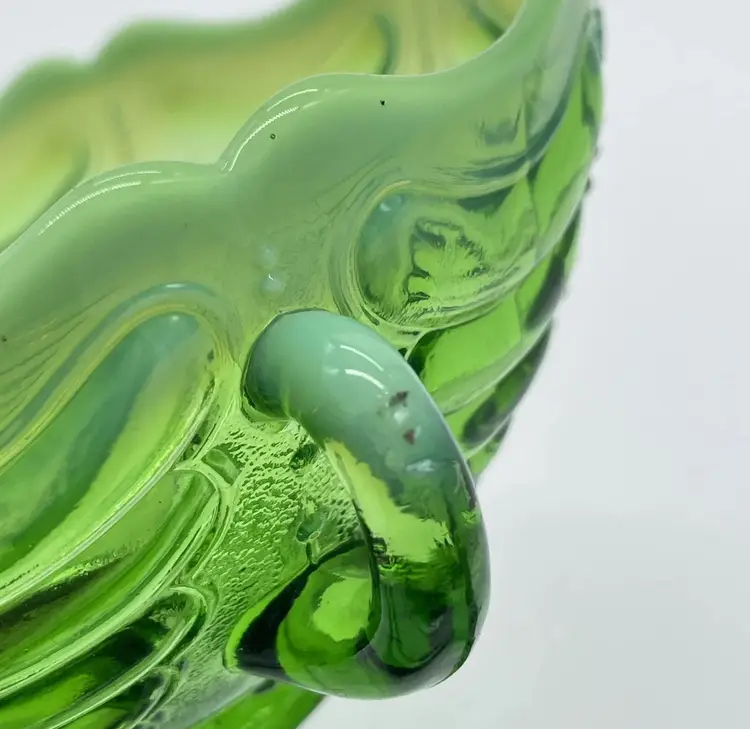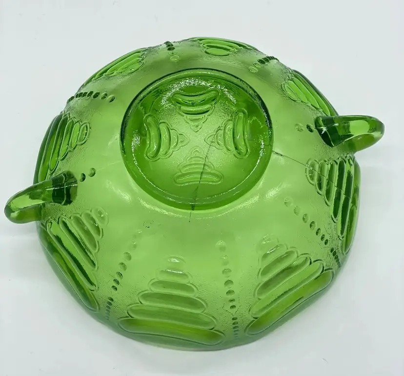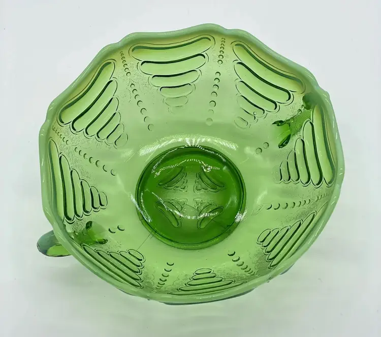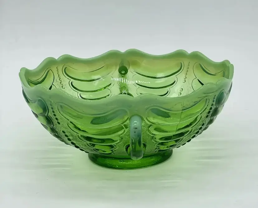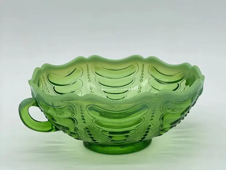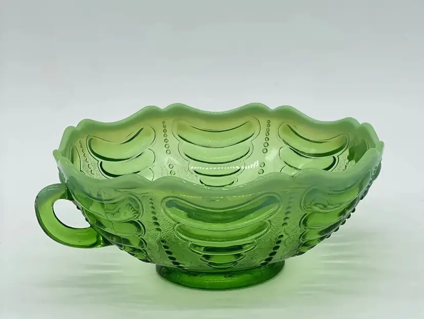 Antique Jefferson Abalone Green Opalescent Glass Double Handled Bowl. Condition is used but in good condition. Does not have any cracks but there is a small minor chip on one of the handles. There is a minor scuff on the rim of bowl. Dates to the early 1900s. See photos for further description. Measures approximately 2 3/4 inches tall and 7 inches wide from handle to handle.