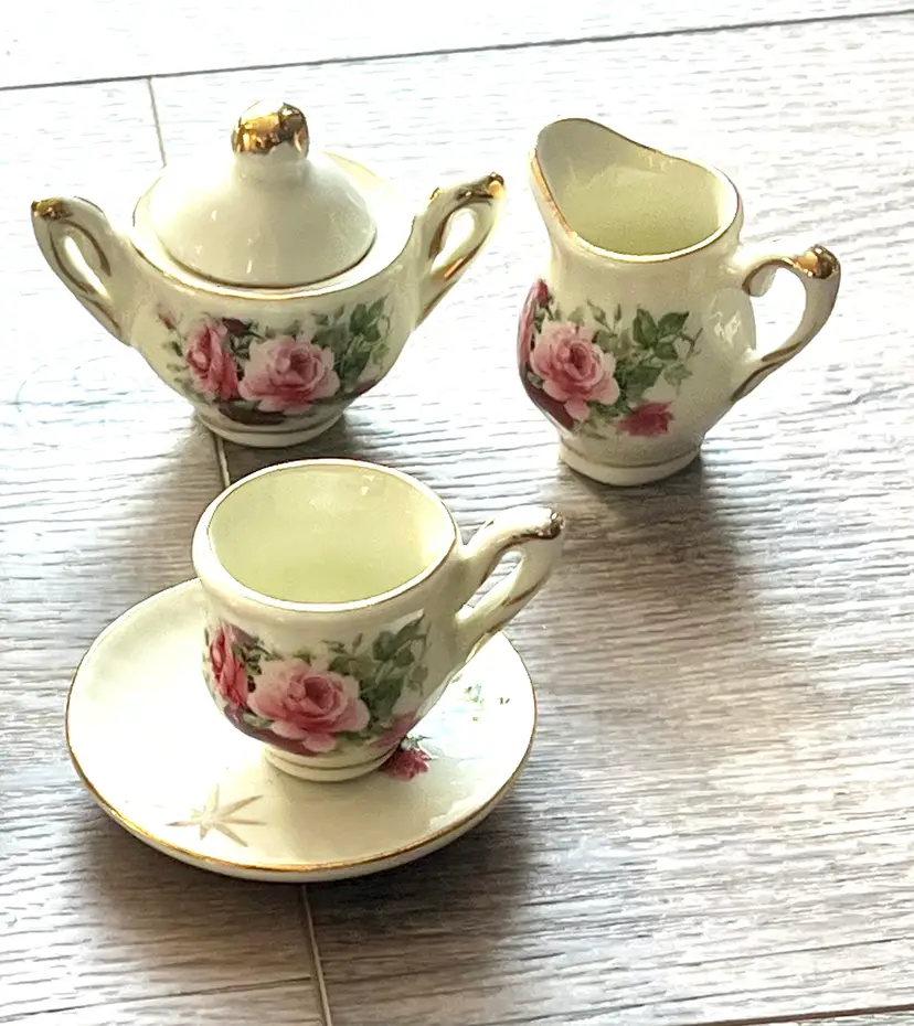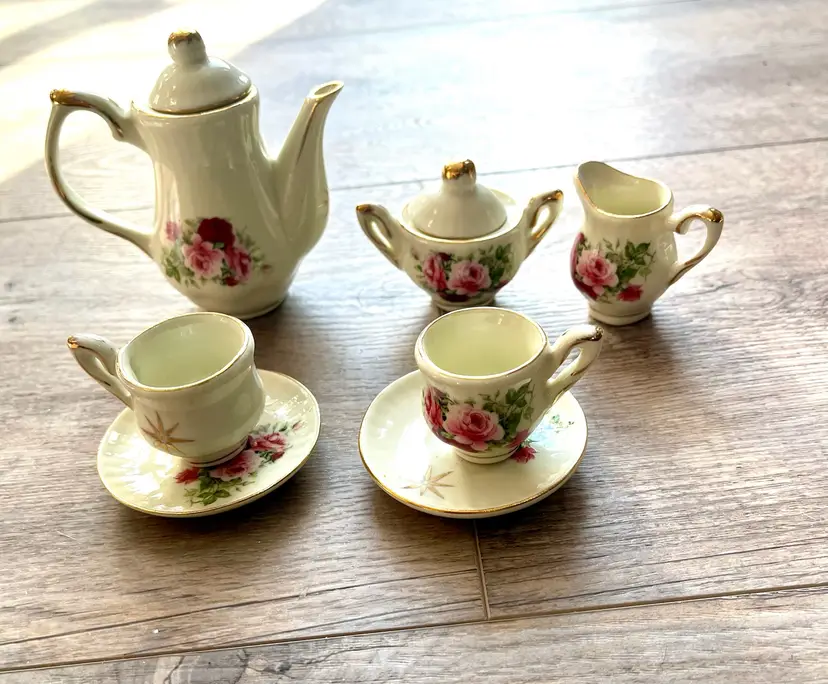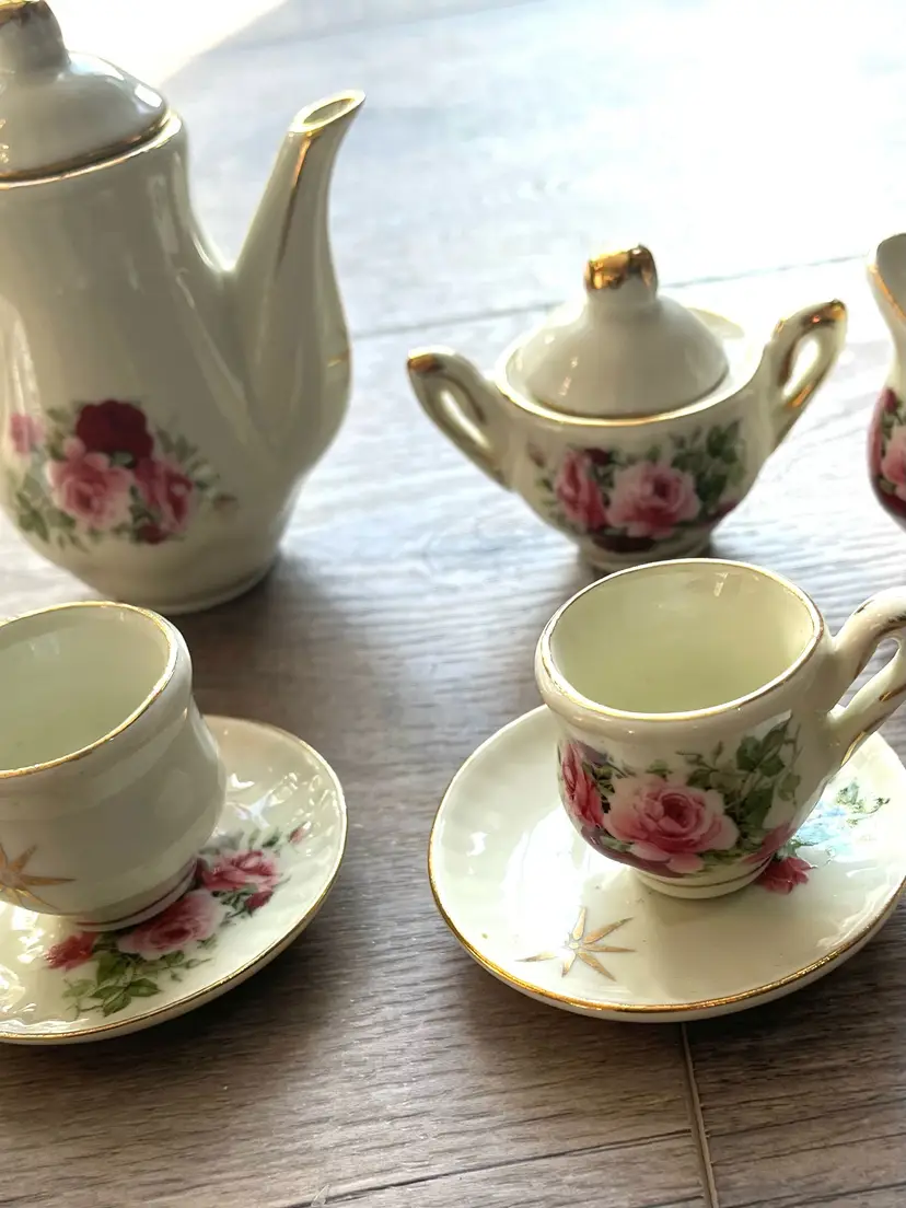 A nine piece set of mini porcelain tea set. Decorated with roses. Included are Teapot, cream & sugar and two cups and saucers. The set appears to have only been displayed and not used by a child. Free of any nics and such. Gold trim in excellent condition.