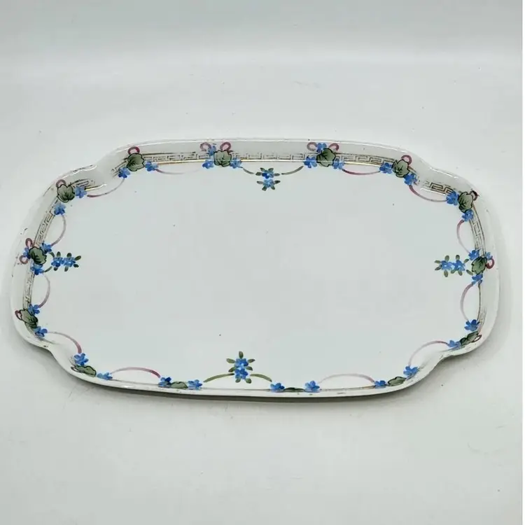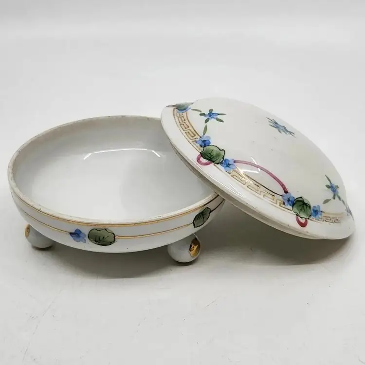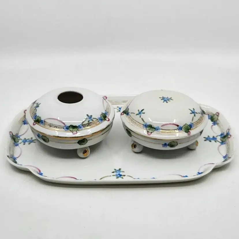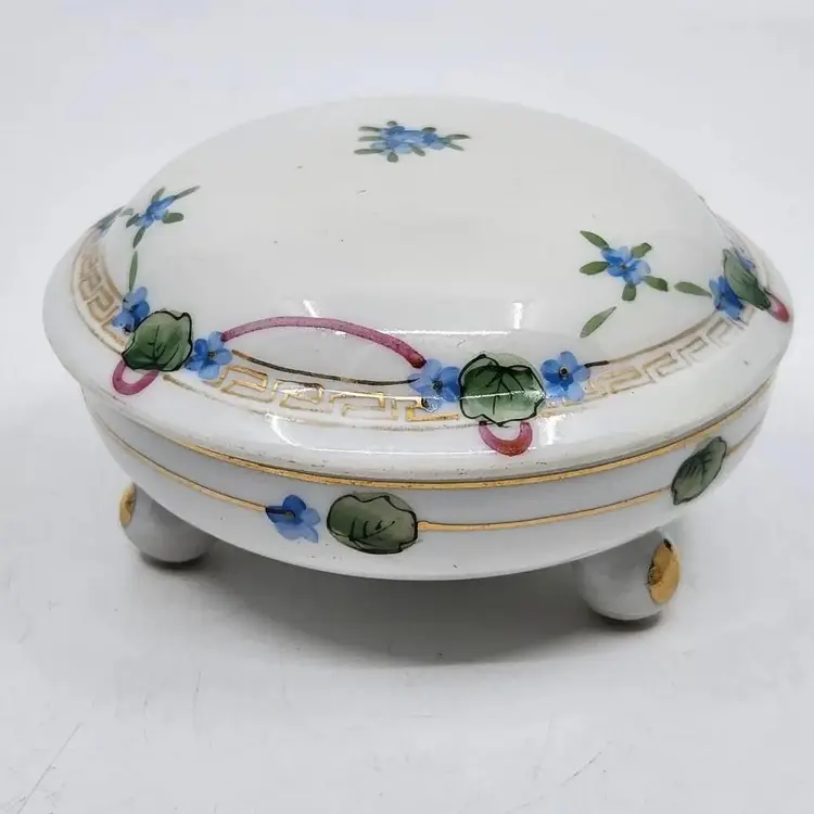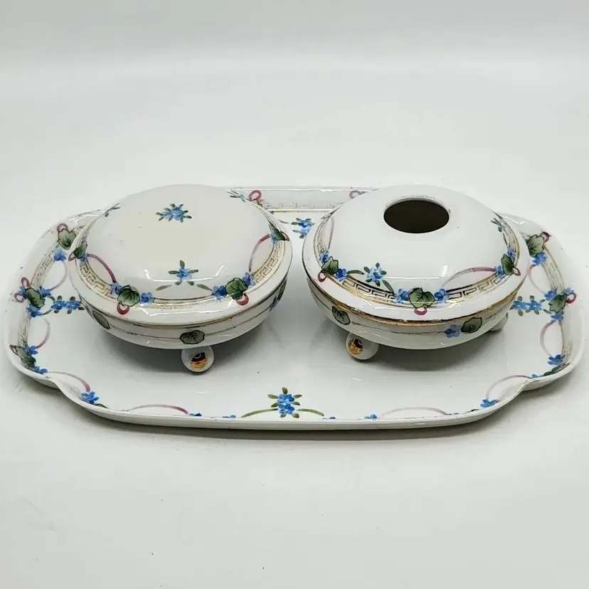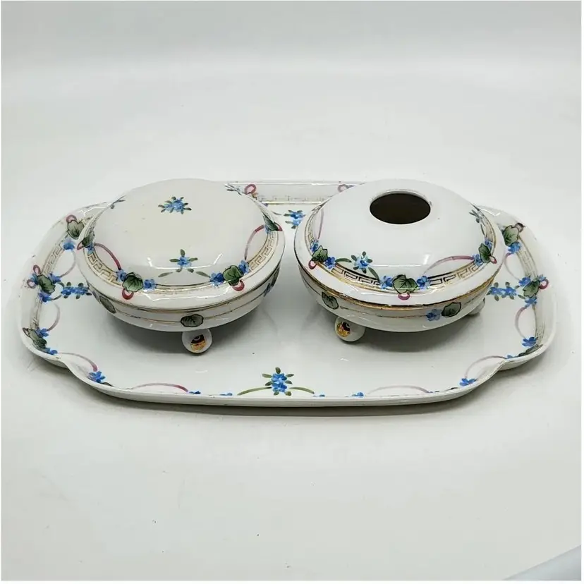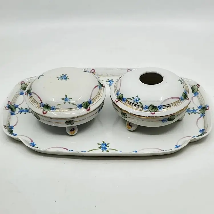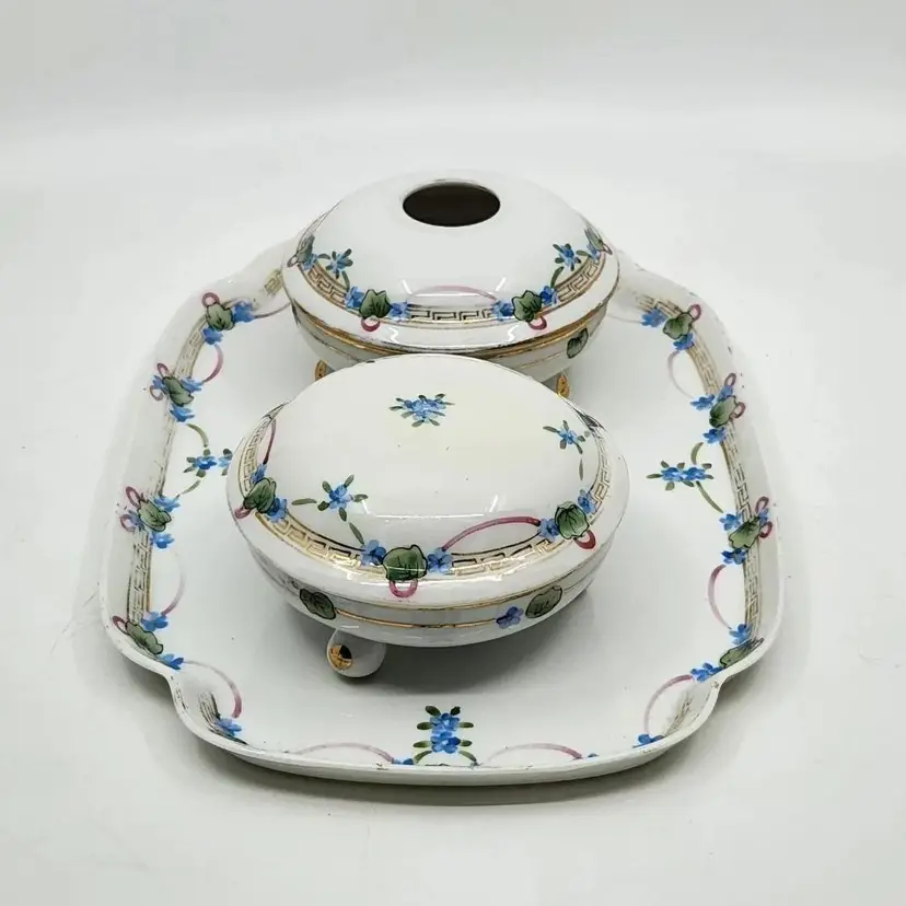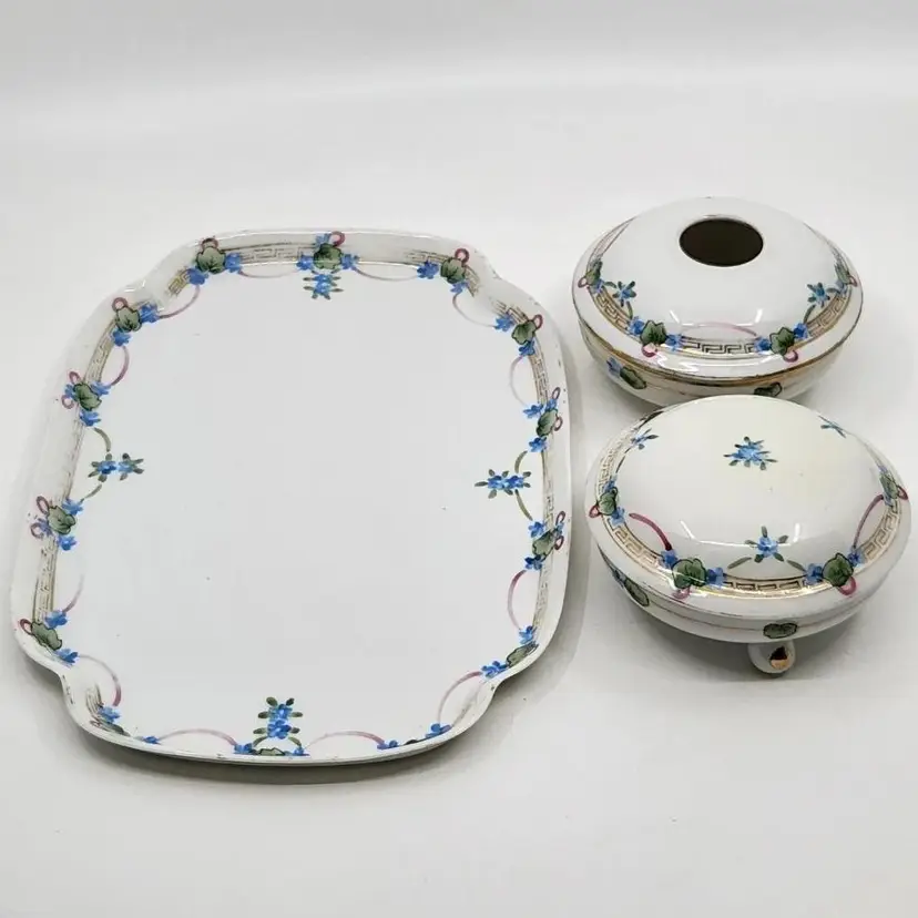 The set features hand-painted blue flowers and gold designs that add a charming touch to your vanity or dresser.