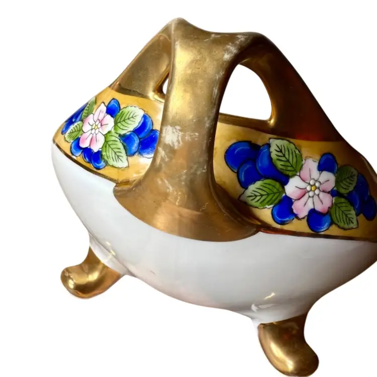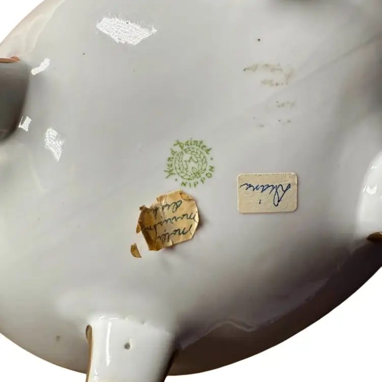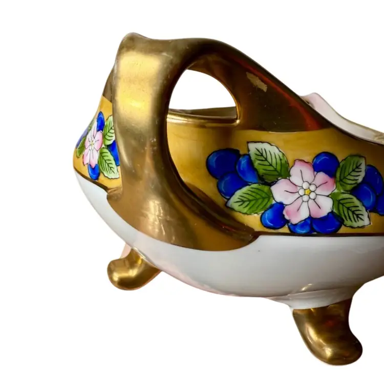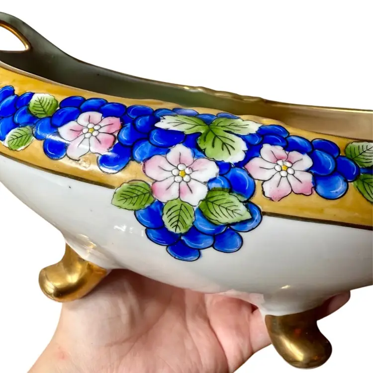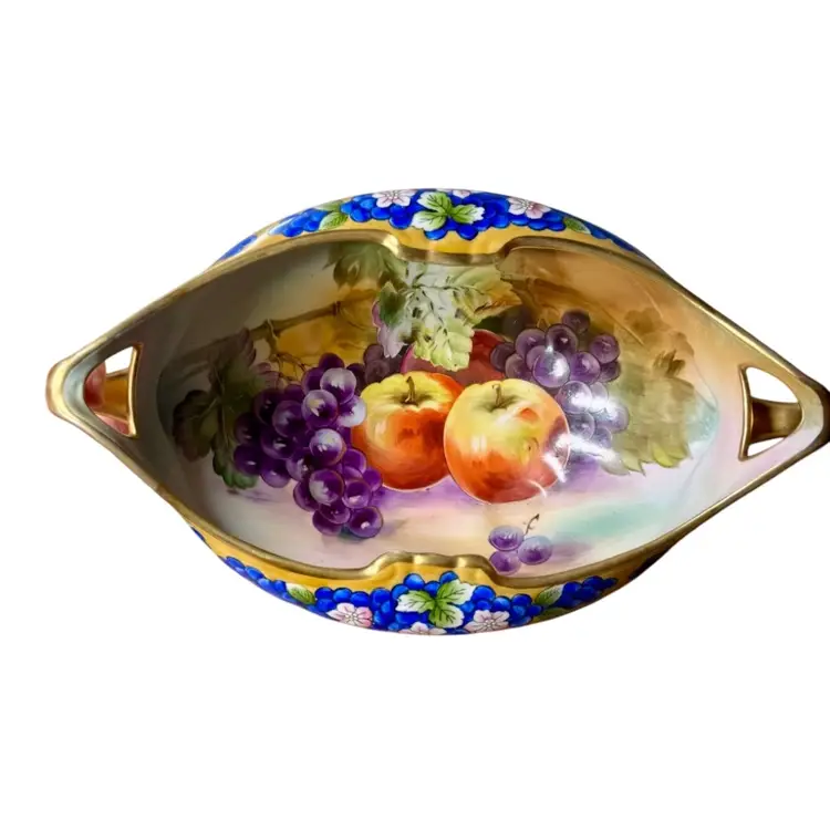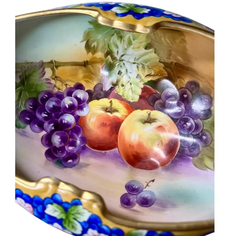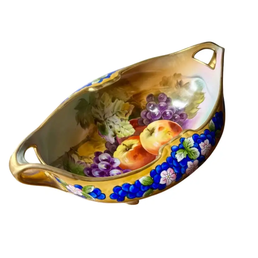 12.5”x8”x5.25”. Beautiful hand painted, footed, handled serving/fruit bowl, with a vibrant fruit scene on the inside, and moriage enamel flowers on the edges. Has gold paint on the handles, rim and feet. Gold paint is a little worn on the handles from use, see pictures. Mark on the bottom is authentic pre-1921 Morimura wreath mark, pre-world war 1 to early 1920’s export era.