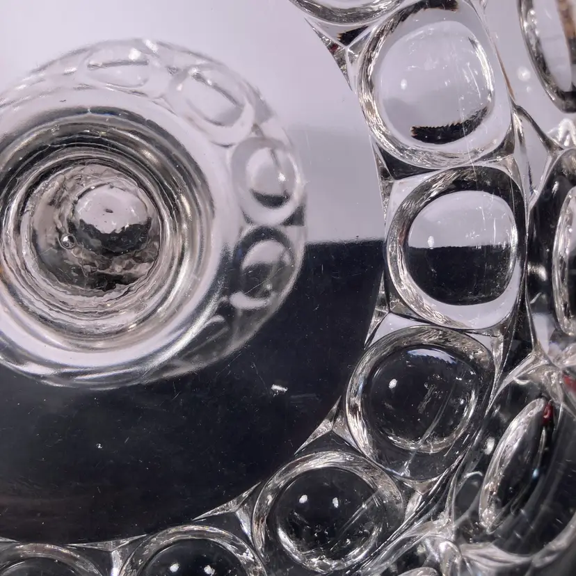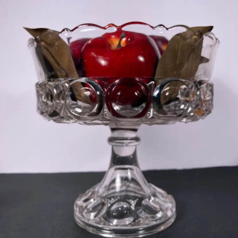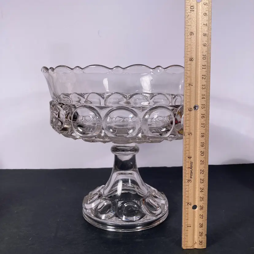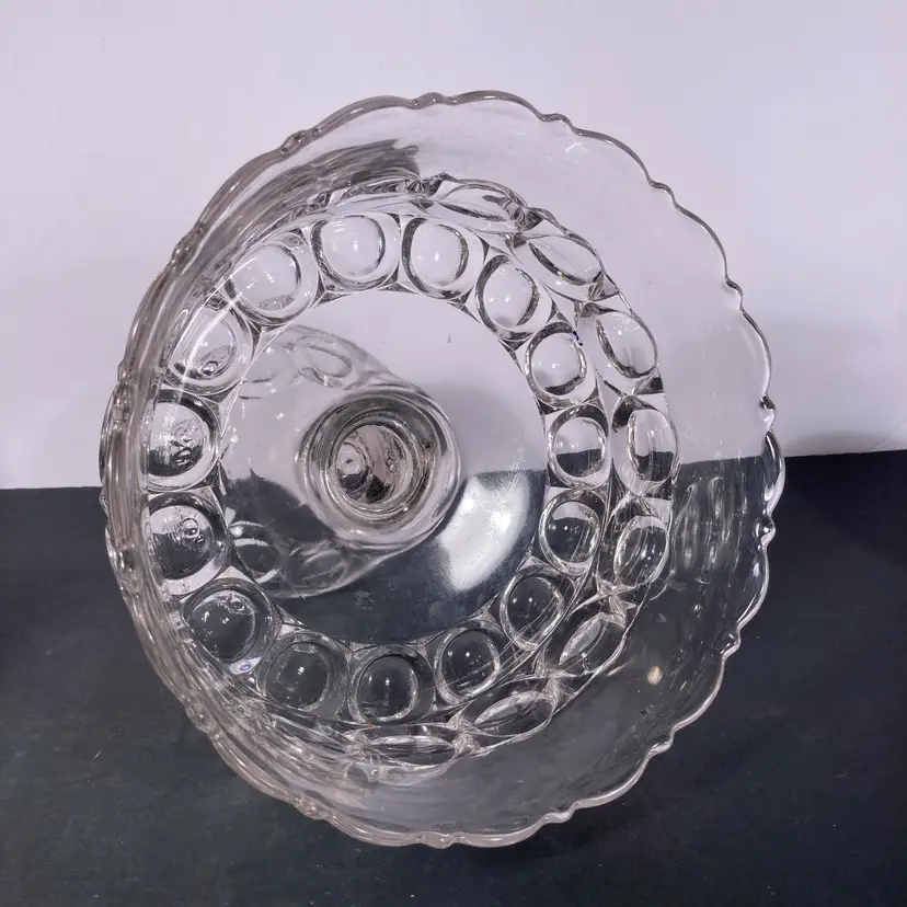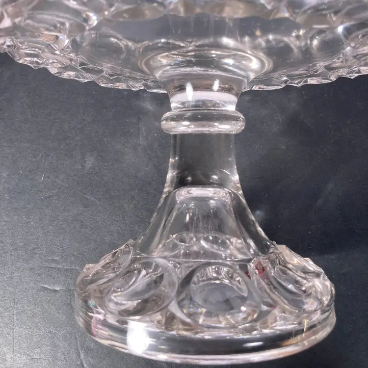 Classic Early American Pattern Glass (EAPG) pressed glass Pedestal Compote with repeating large concave bullseye pattern on the bowl and foot. Gorgeous pattern, 19th century production. The patterned pedestal base was hand applied to the matching pattern bowl by the artisan with a molten round glass wafer as shown.