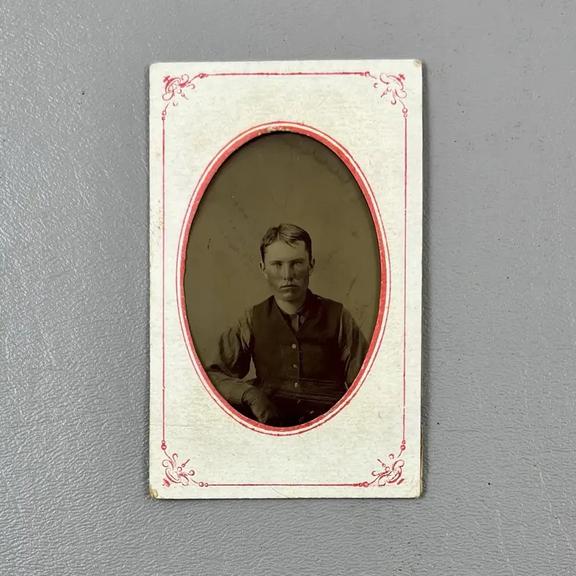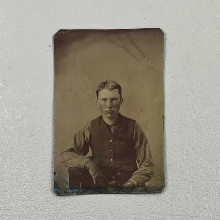Antique Photo Portrait Tin Type Tintype Young Man Blue Eyes Vest Leather Gloves
