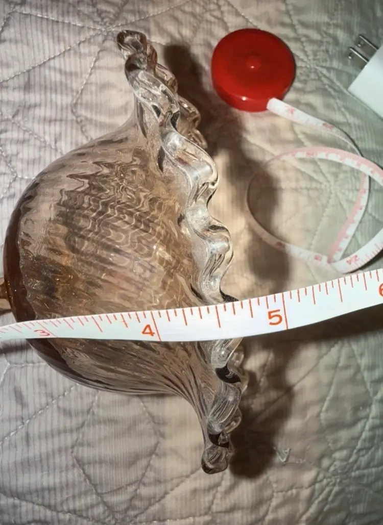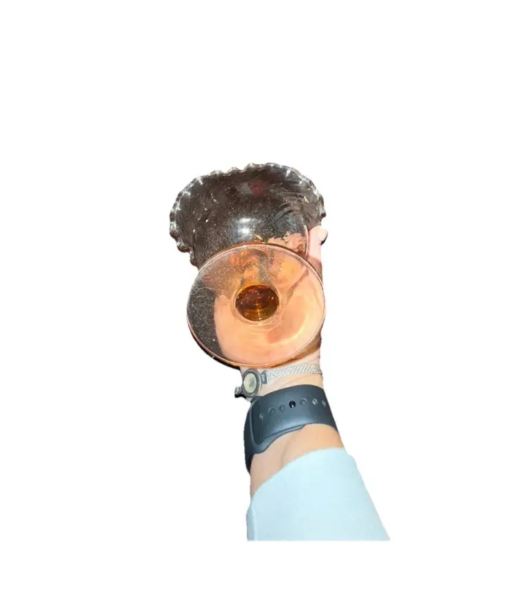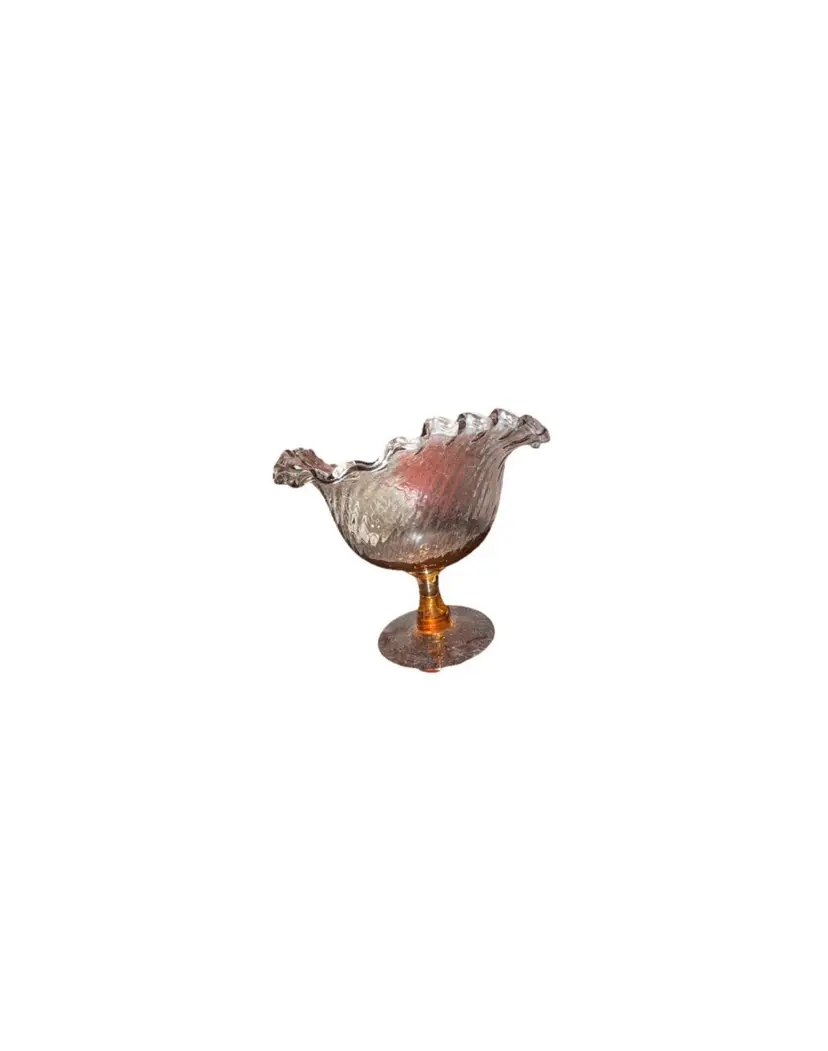 This Antique Pink Glass Open Compote Candy Dish is a Victorian-style, hand-blown art glass piece with an optic swirl pattern and ruffled edge. It has a capacity of 6-8 oz and is made of glossy pink glass. This decorative candy dish stands at 4.5 inches tall with a diameter of 5 inches, and it is designed with a single compartment. The unique design and vintage charm make it a delightful addition to any collection or as a functional piece for serving candies or treats.