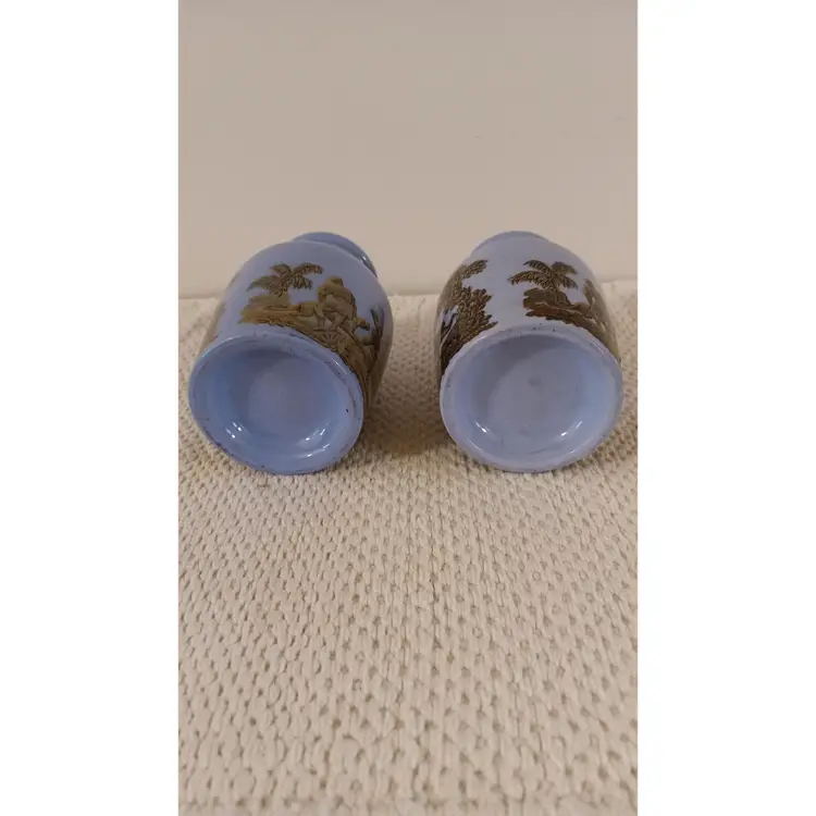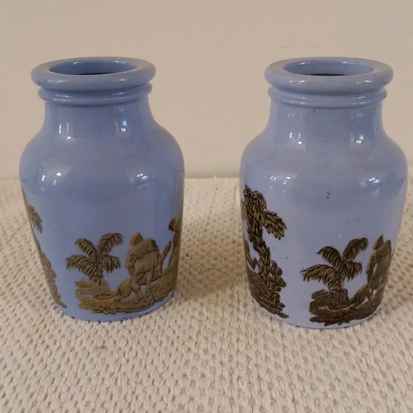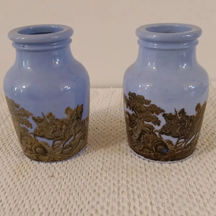 Antique Pair of Blue Pratt Ware Tobacco/mustard/meat jars; boar hunting scene; bottom marked with letter B; very nice overall condition; 4" tall x 2.5 " wide
