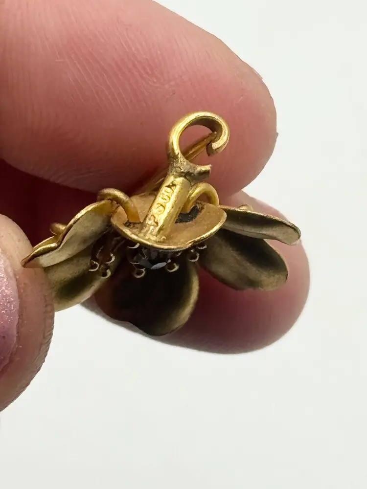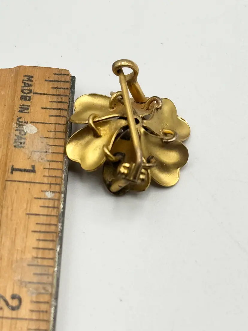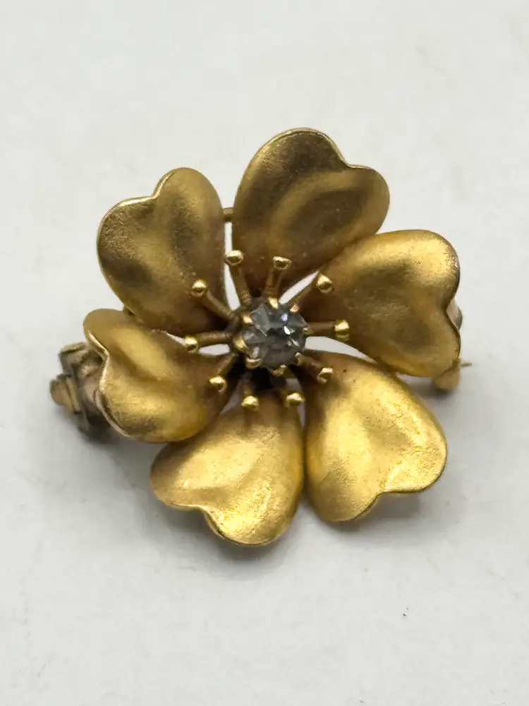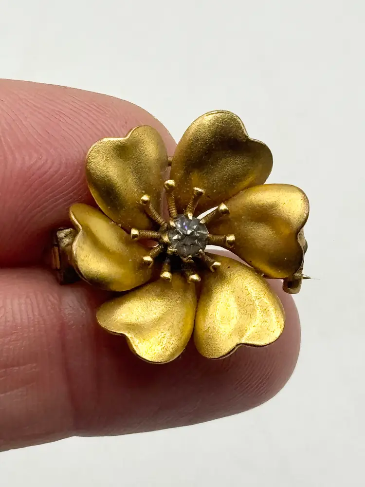 Antique PS Co Gold Filled rhinestone flower estate pin. Signed PS co. Gold flower with rhinestone center. C clasp, early piece. Vintage estate brooch pin. MN54GH.