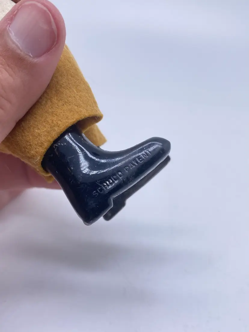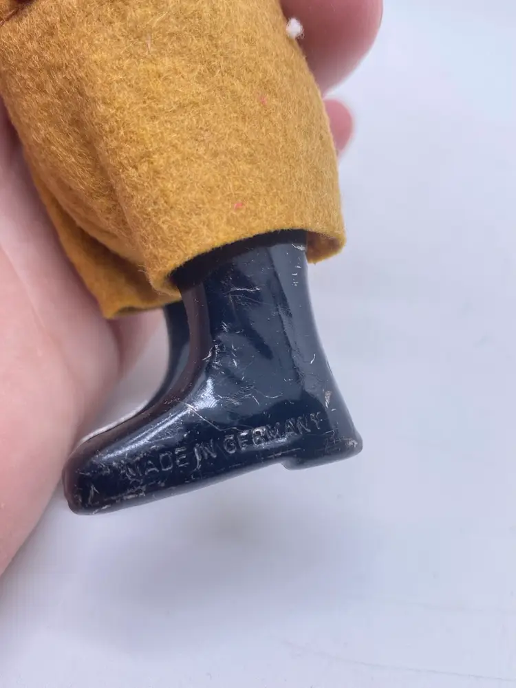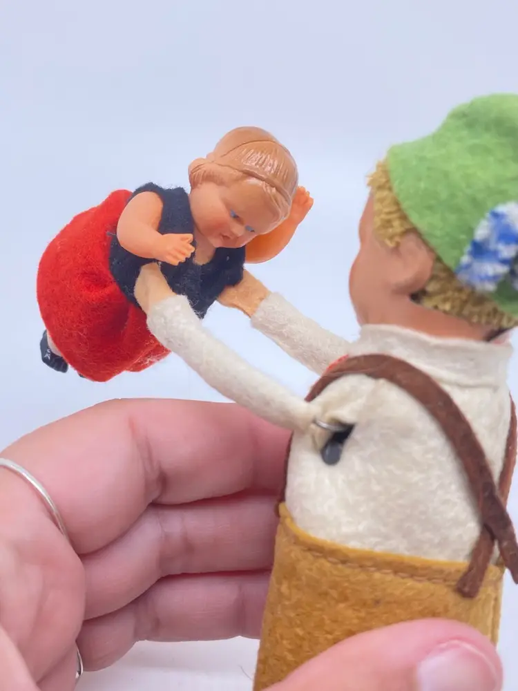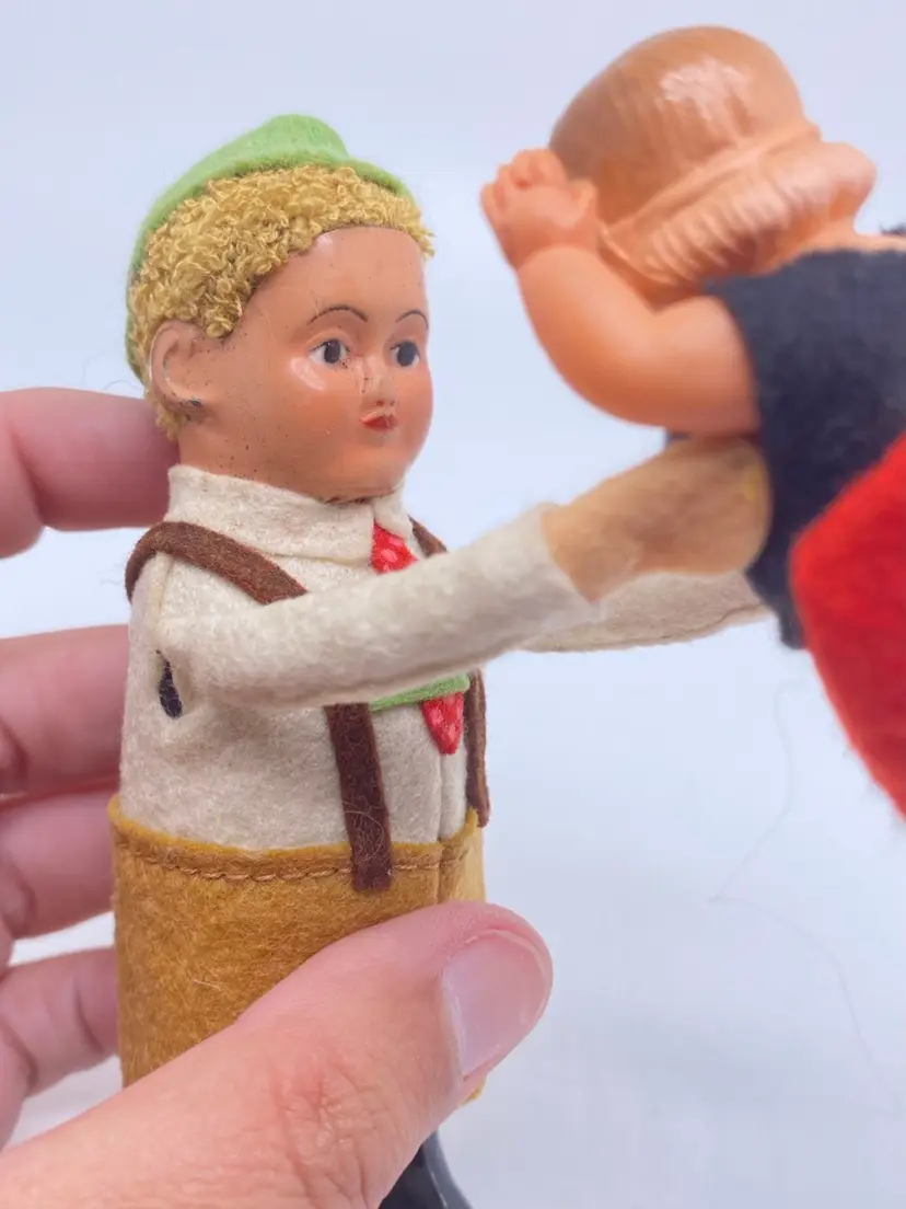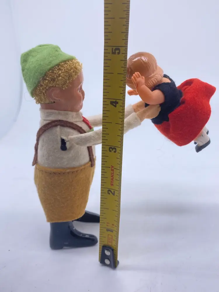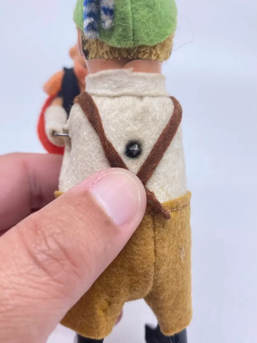 Made in Germany by Schuco. 1937 fabric covered tin windup 973 Bavarian boy dancing w/fabric covered, celluloid girl. 5" high.not sure if it works. I did not have a key to try. Little girl is missing her hat. Marked made in Germany on foot.