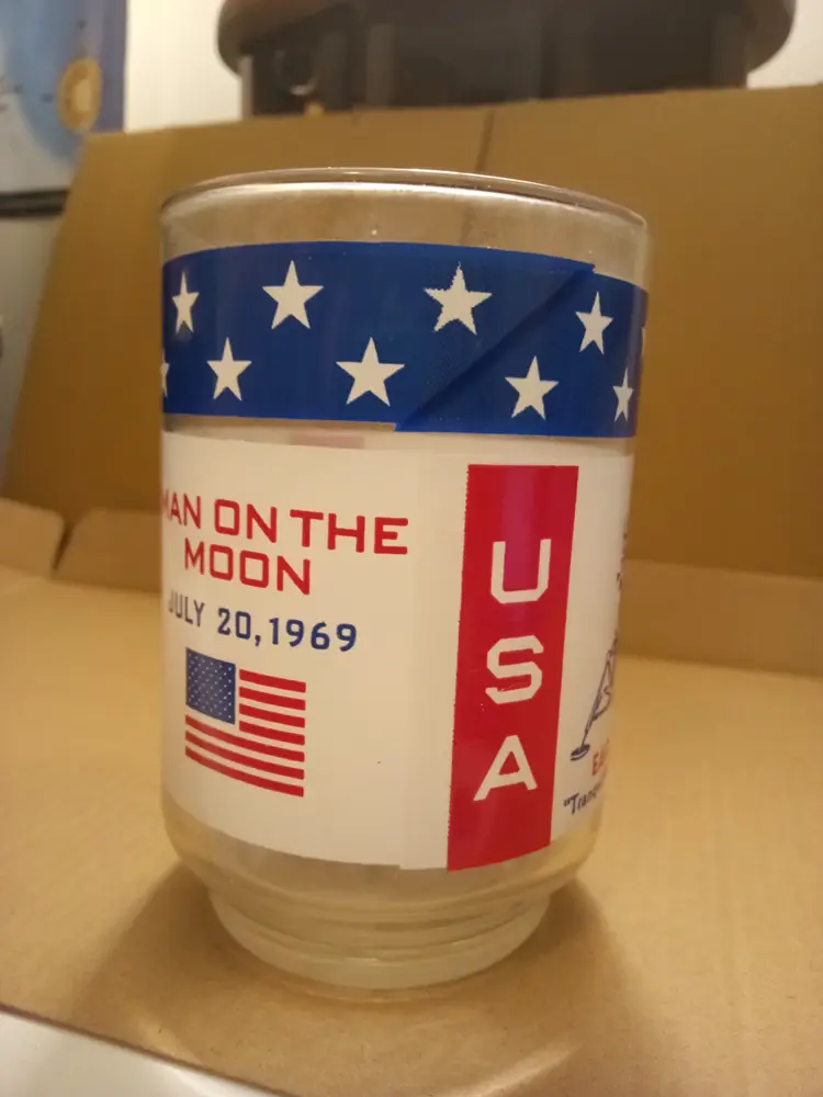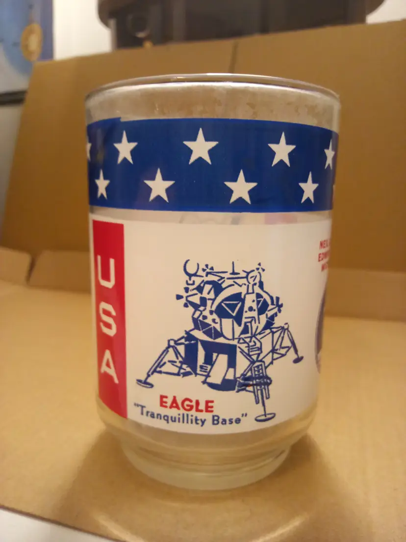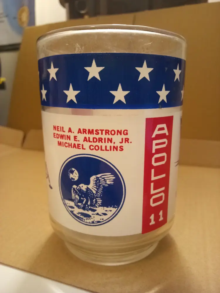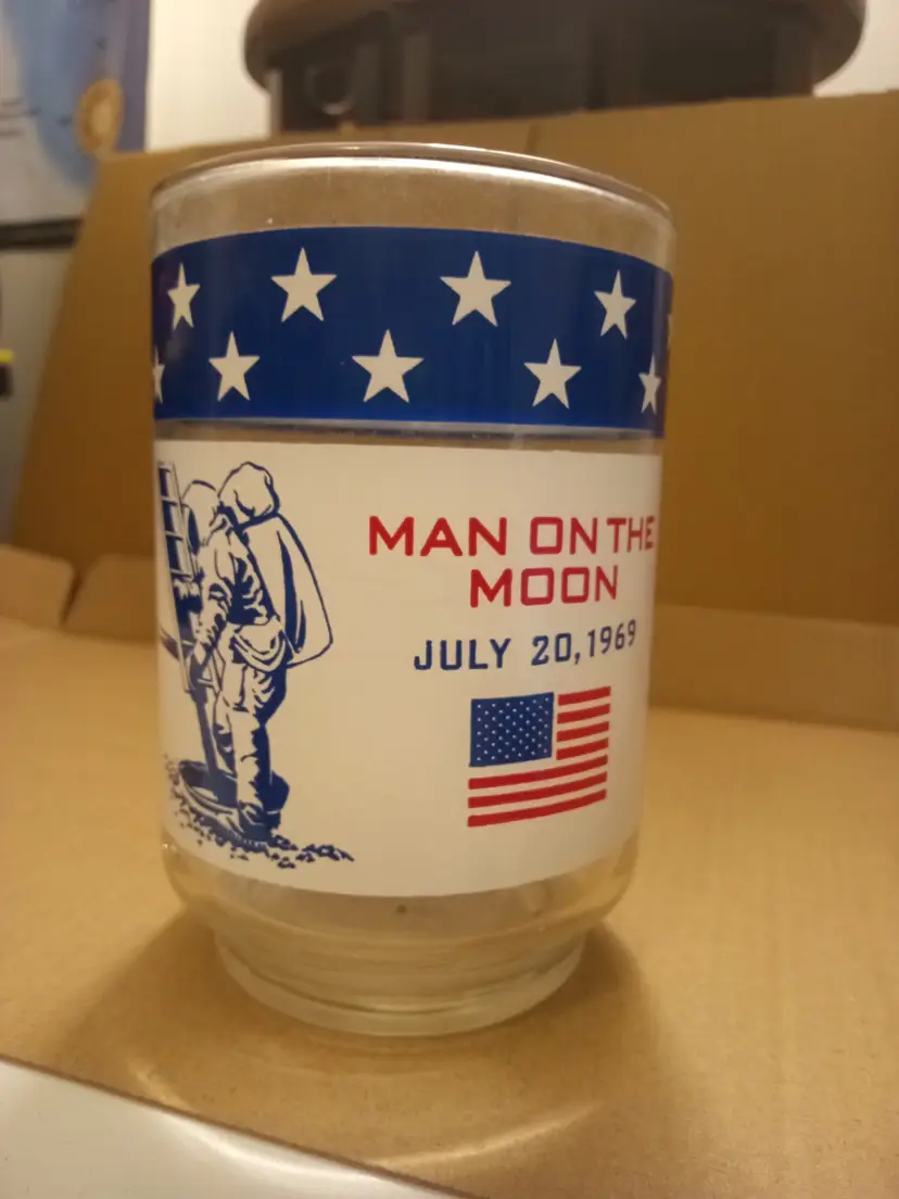 vintage commemorative drinking glass for the Apollo 11 mission, which landed the first humans on the moon on July 20, 1969.