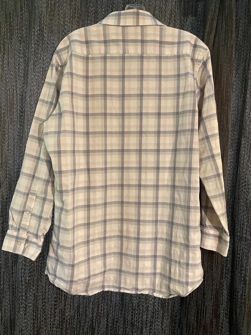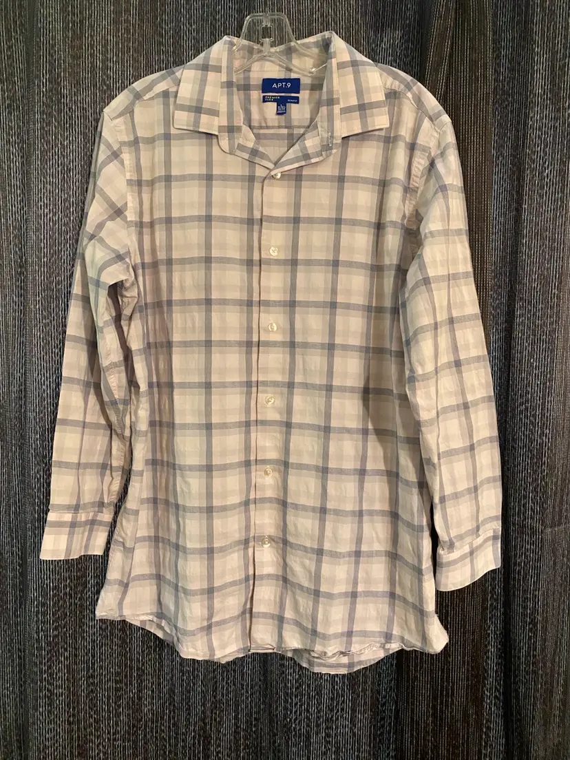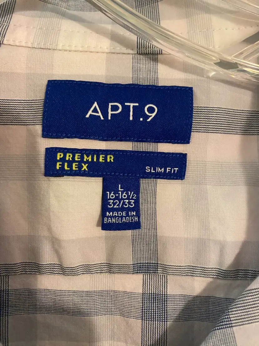 You are purchasing one Men's Size Large Slim Fit (16-16.5 Neck/32-33 Sleeves) White & Blue Plaid Pattern Long Sleeve Dress Shirt by Apt. 9 and their Premier Flex collection. This Shirt is in excellent condition with no rips, holes or stains.