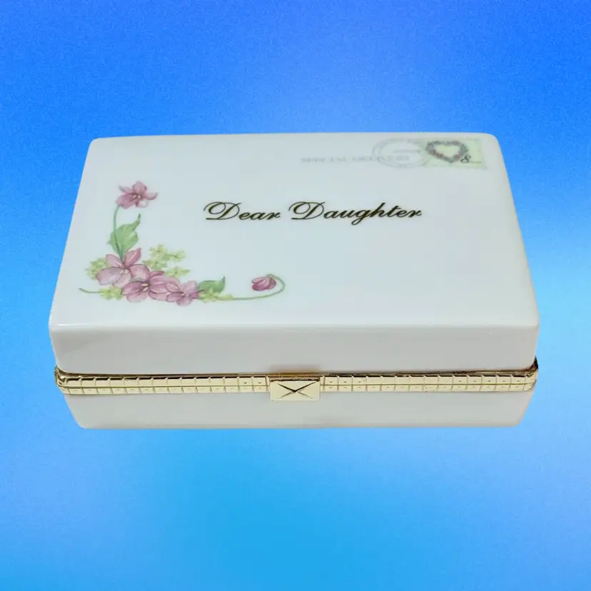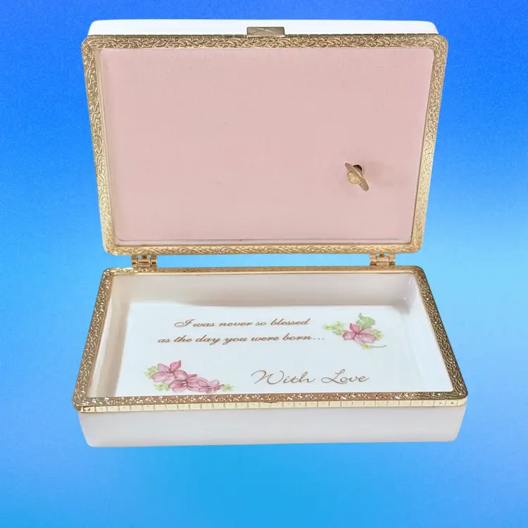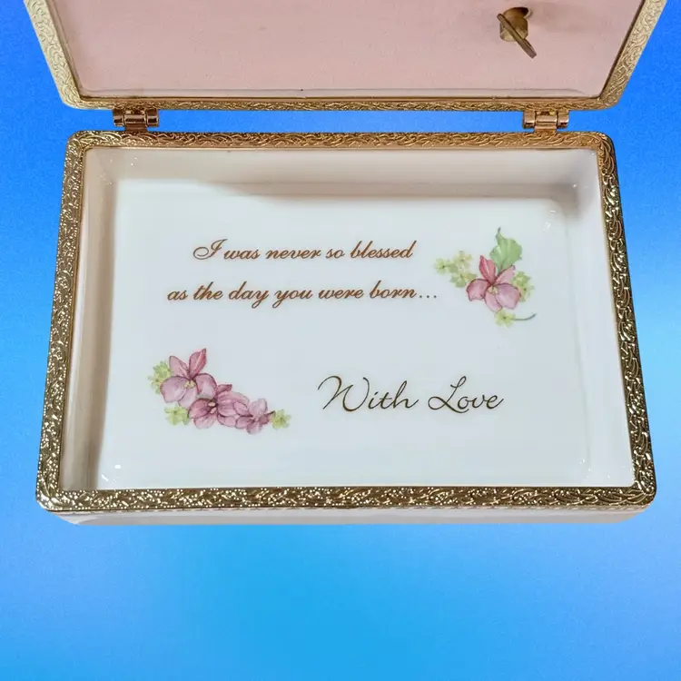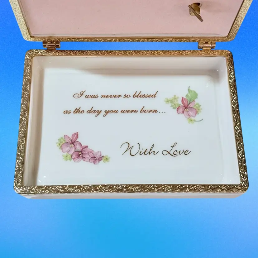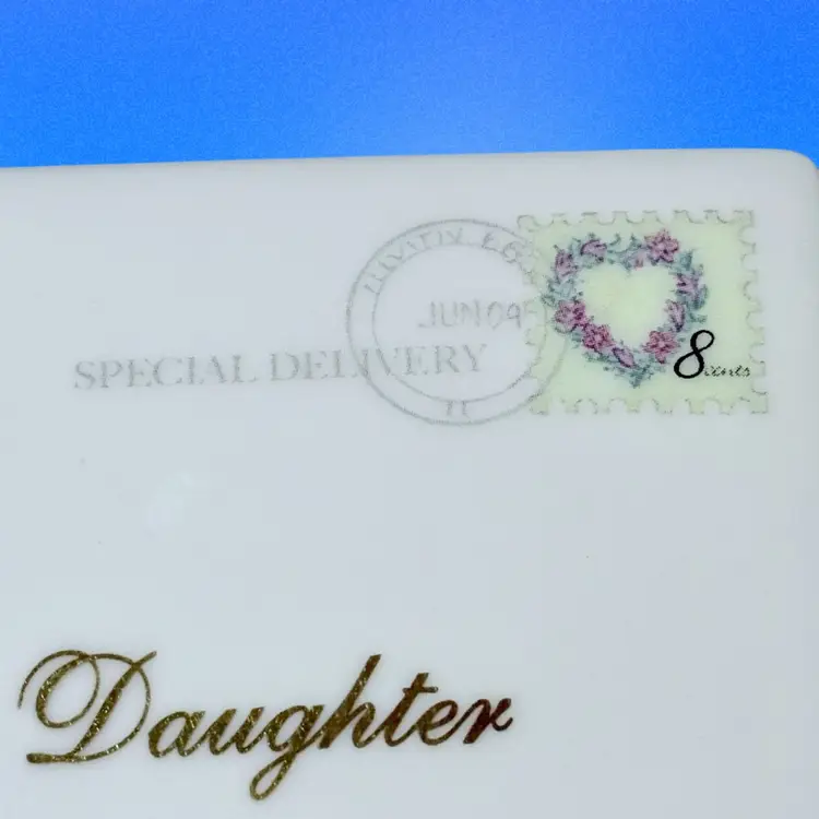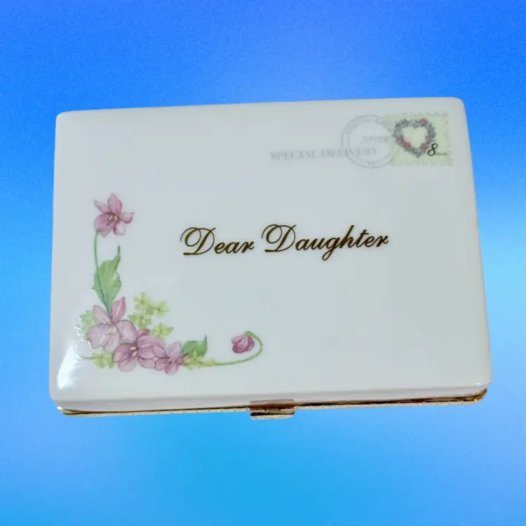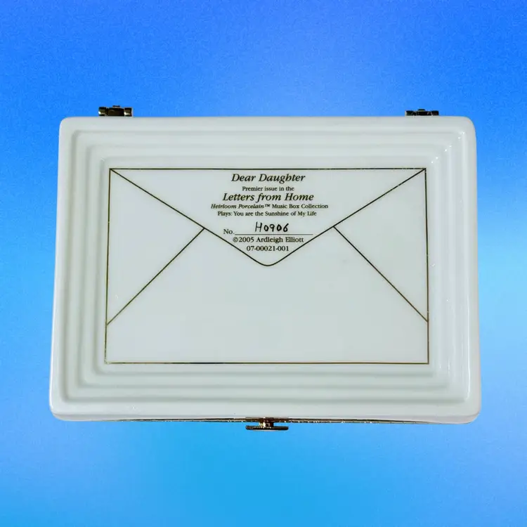 The Ardleigh Elliott "Dear Daughter" Porcelain Music Box 2005 is a limited edition Letters From Home Heirloom Porcelain Music Box Collection piece from Bradford Exchange. This music box features a delicate porcelain design that plays “You Are The Sunshine of My Life.” Bottom also bears Ardleigh Elliott’s number 08-00021-001.