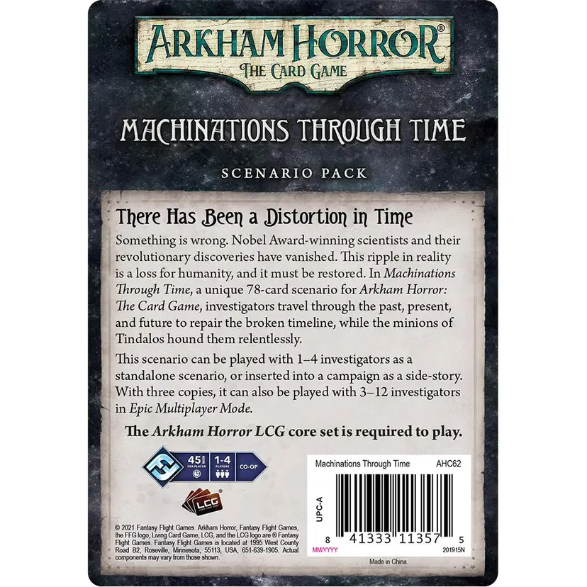 Something is wrong. Nobel Award-winning scientists and their revolutionary discoveries have vanished. This ripple in reality is a loss for humanity, and it must be restored. In Machinations through Time, a unique 78-card scenario for Arkham Horror: The Card Game, investigators travel through the past, present, and future to repair the broken timeline, while the minions of Tindalos hound them relentlessly.