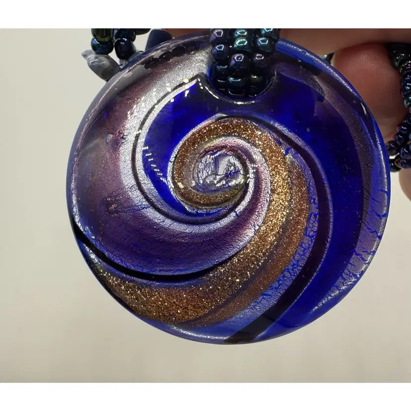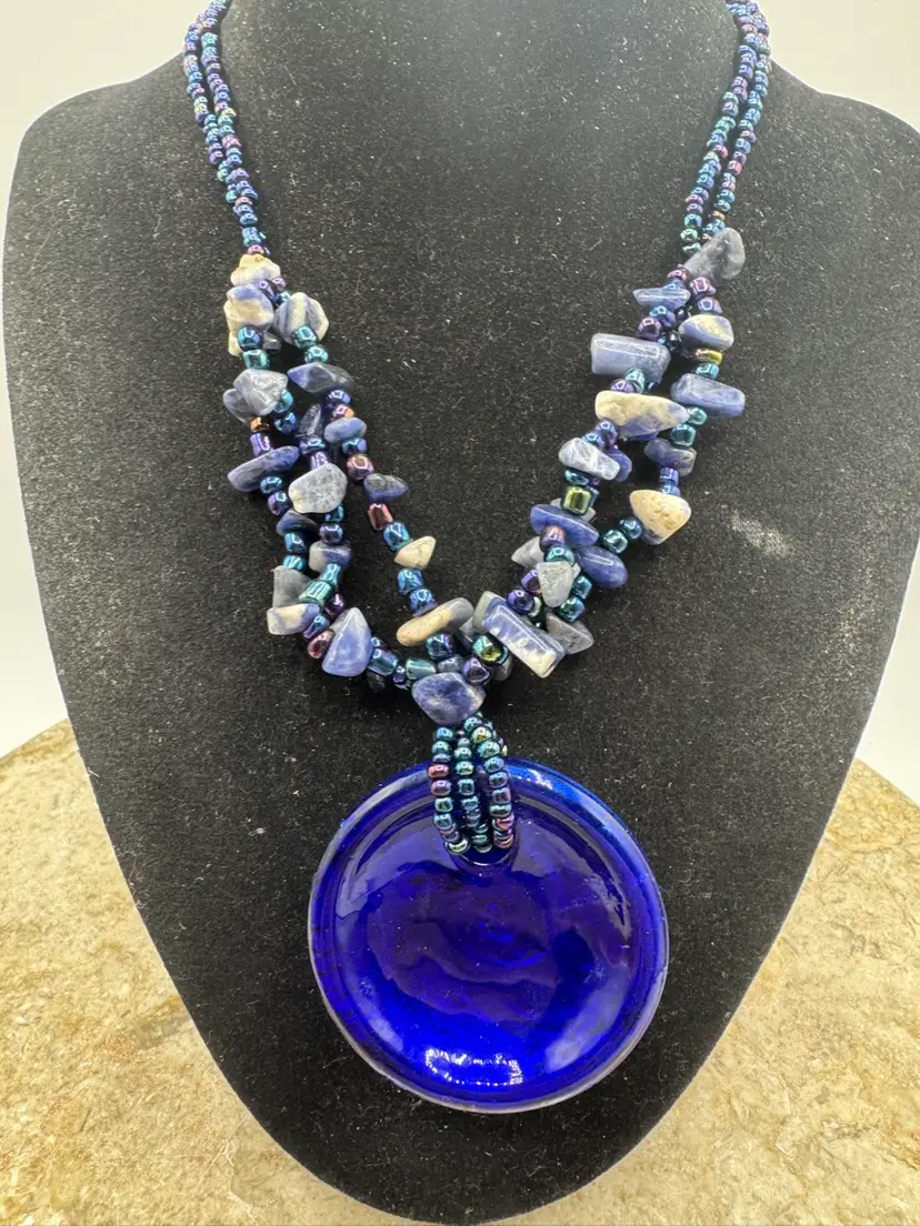 Beautiful art, glass, pendant style necklace with stone and glass beads. Excellent condition. No chips or cracks. Measures 14” with 2” extender.