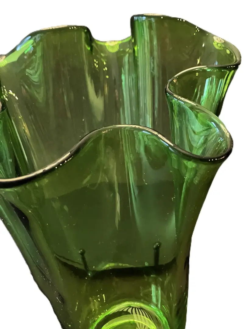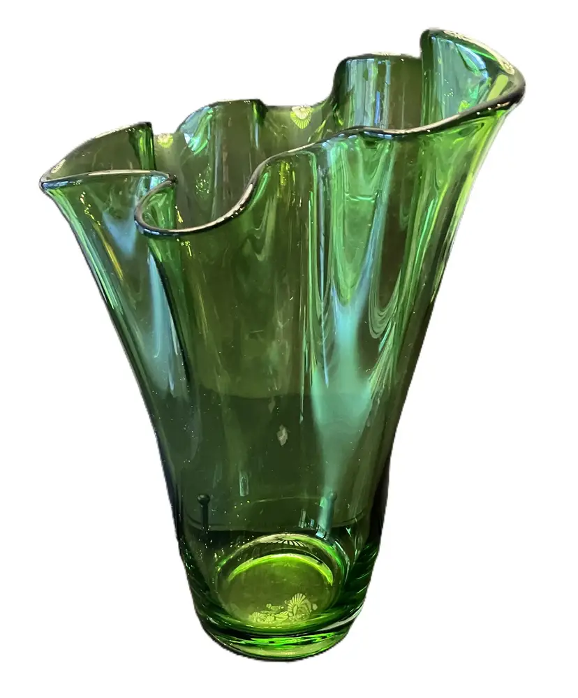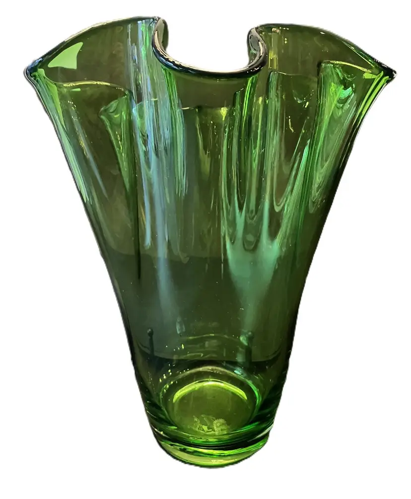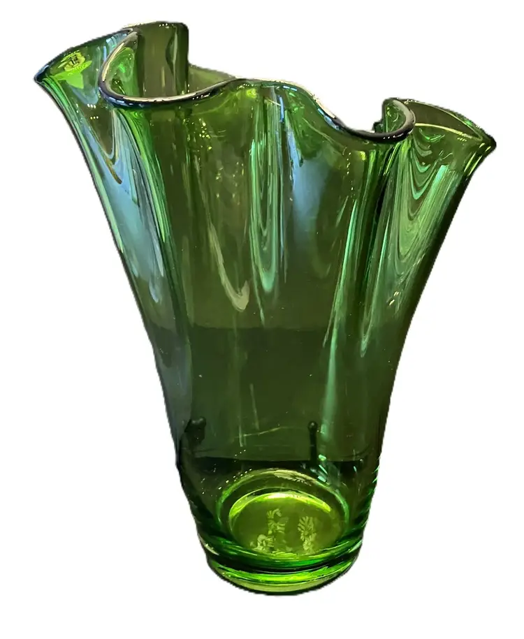 Gorgeous clear vase. It is 10" tall at its shortest to 11" tall at the tallest. 3 3/4" wide at the base and 8 1/2" at the opening. It is 3 1/2 lbs before packaging. There are scratches and a chip on the bottom. It is not marked and I don't know who made this.