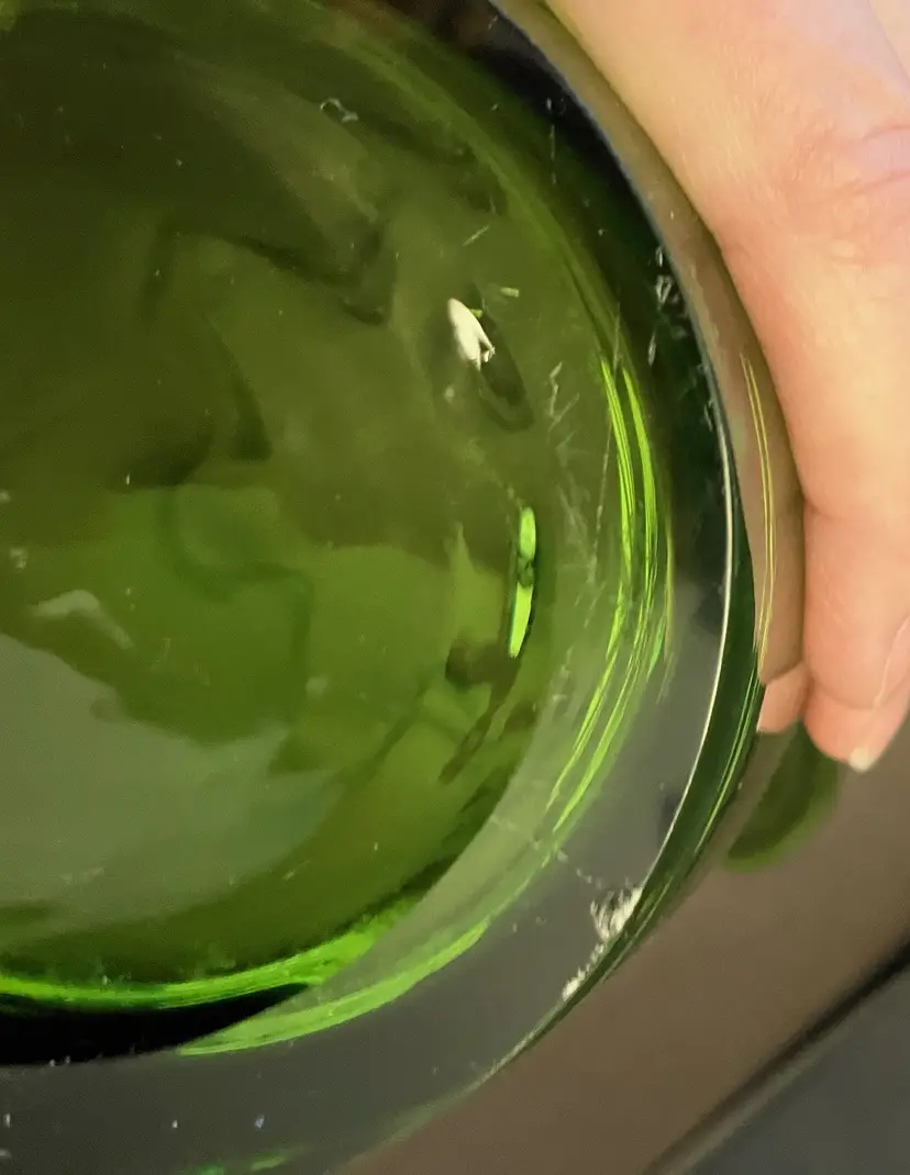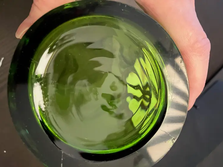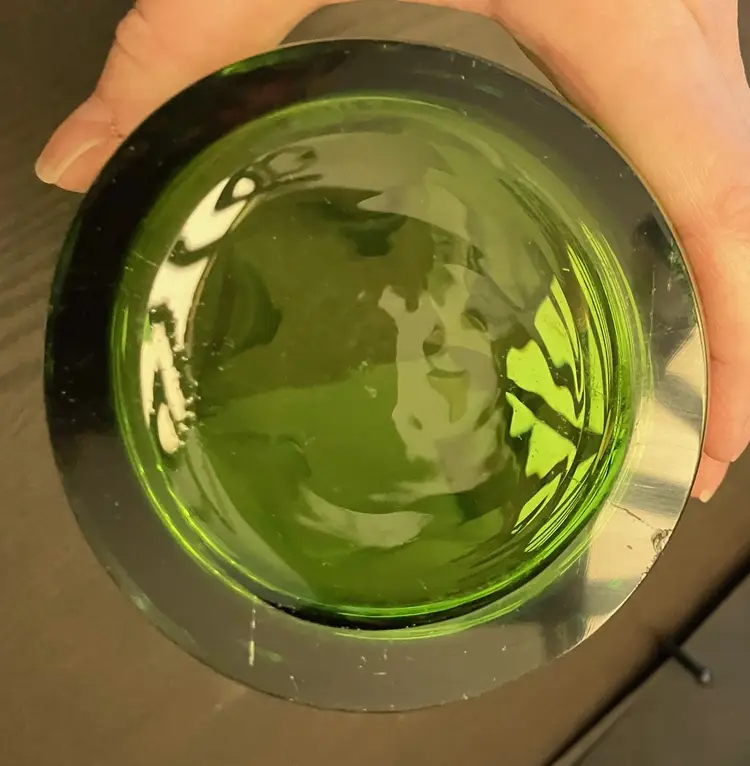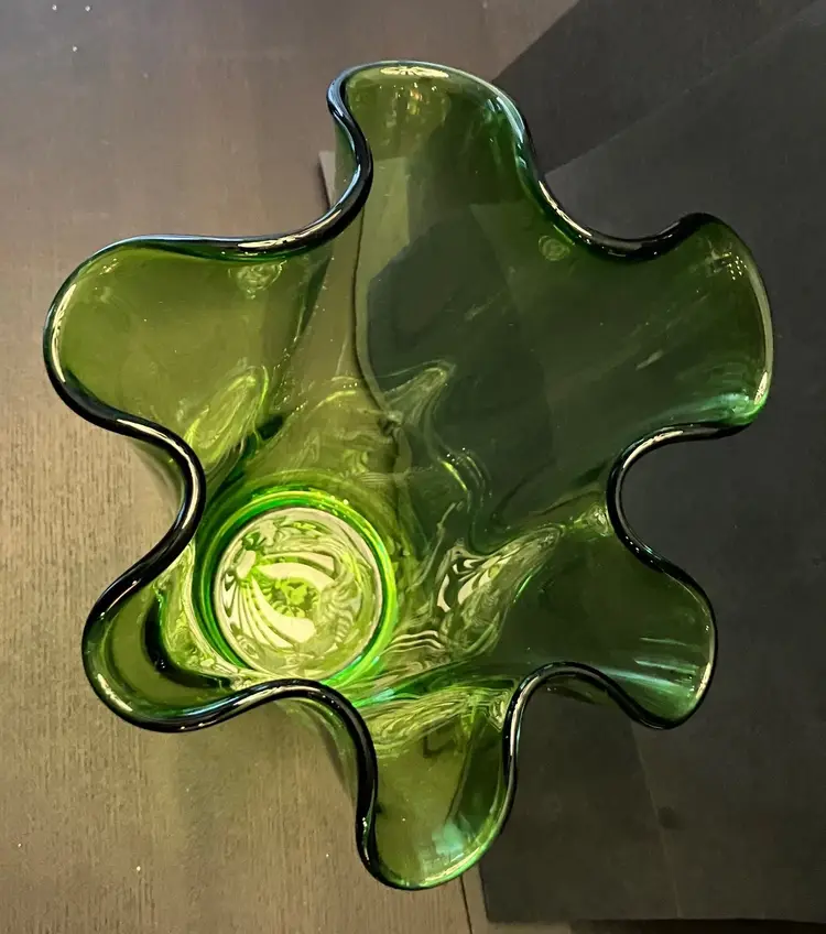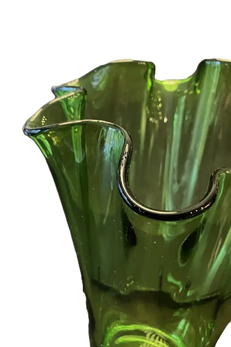 Gorgeous clear vase. It is 10" tall at its shortest to 11" tall at the tallest. 3 3/4" wide at the base and 8 1/2" at the opening. It is 3 1/2 lbs before packaging. There are scratches and a chip on the bottom. It is not marked and I don't know who made this.