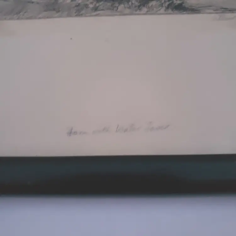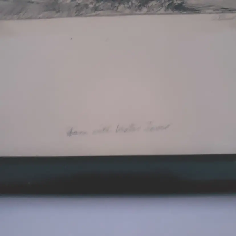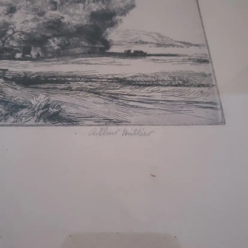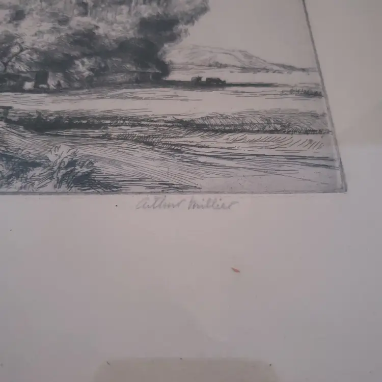 ARTHUR MILLIER Farm with Water Tower - Hand Signed Framed (12.5 x 9.75") Etching. Used condition with wavy look to paper, bit dirty on glass frame and print, frame has scratches, nicks, dents, etc. Please view all photos as they are part of the description and please ask questions prior to purchase if possible.