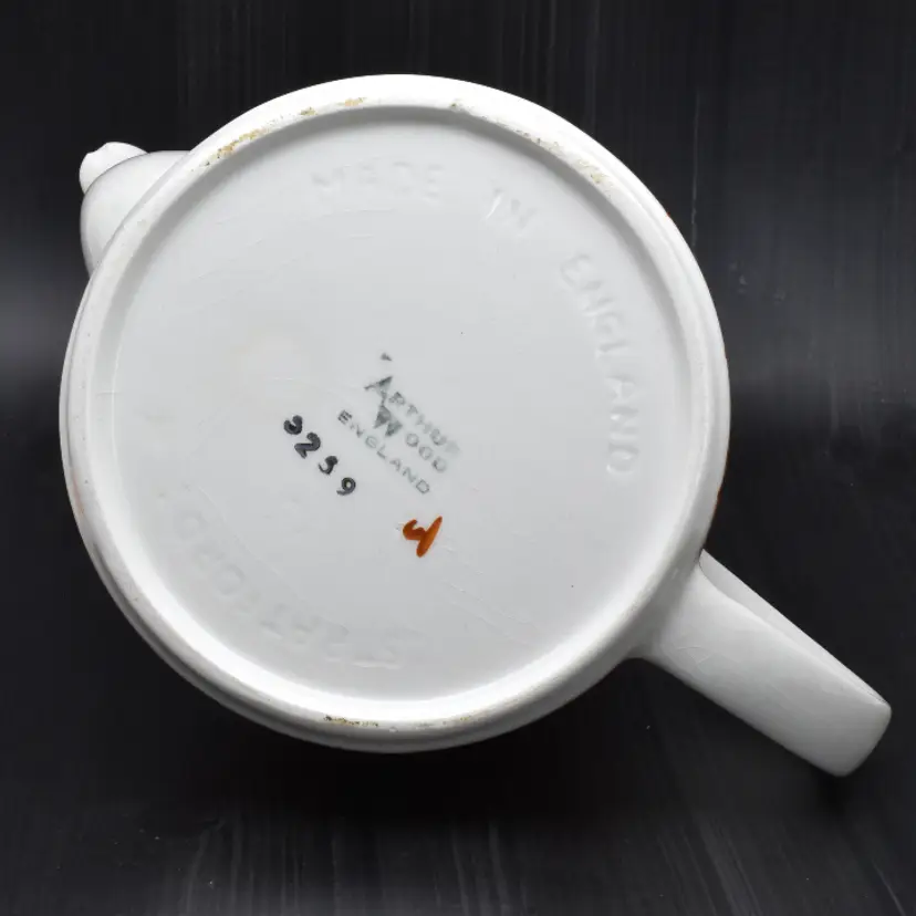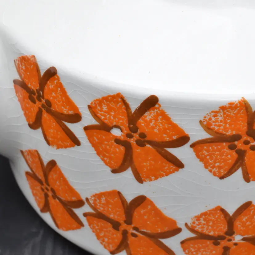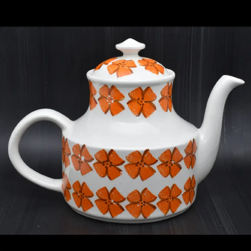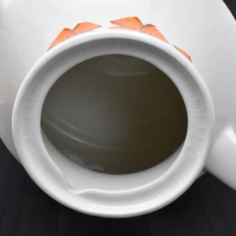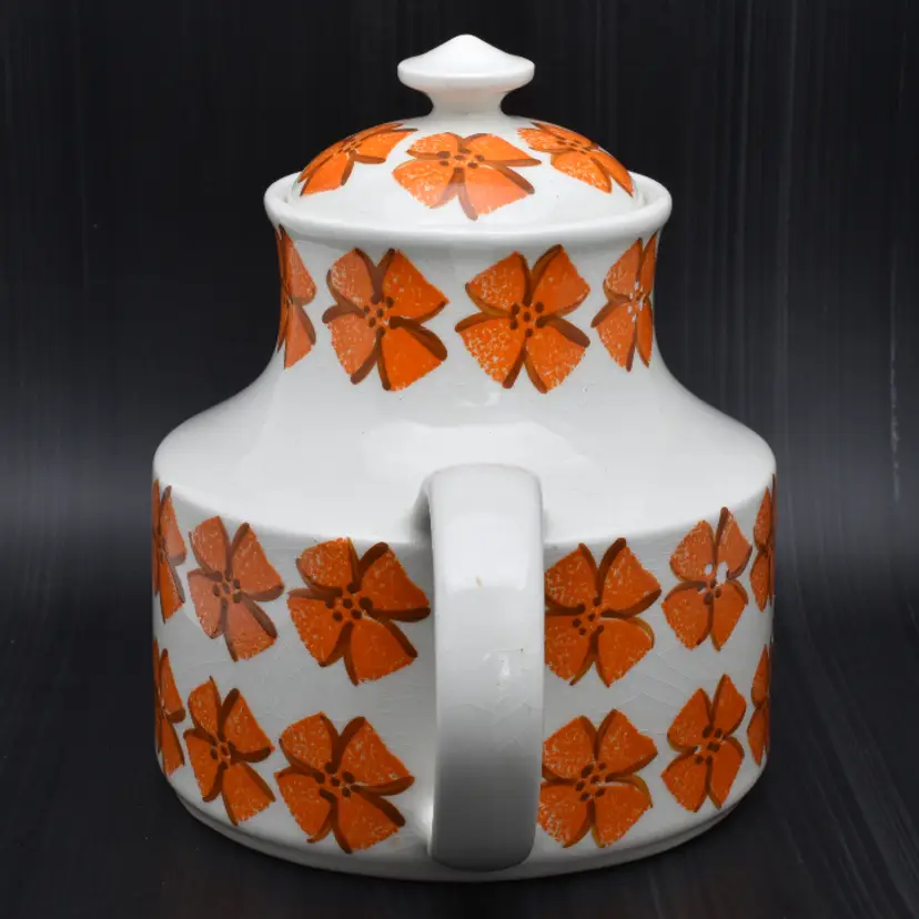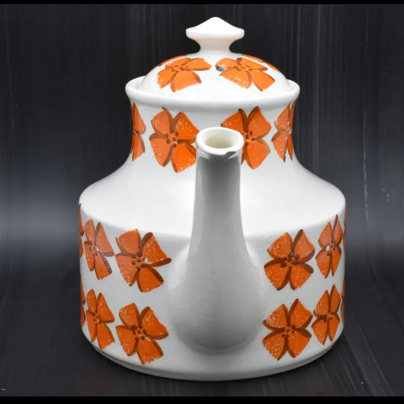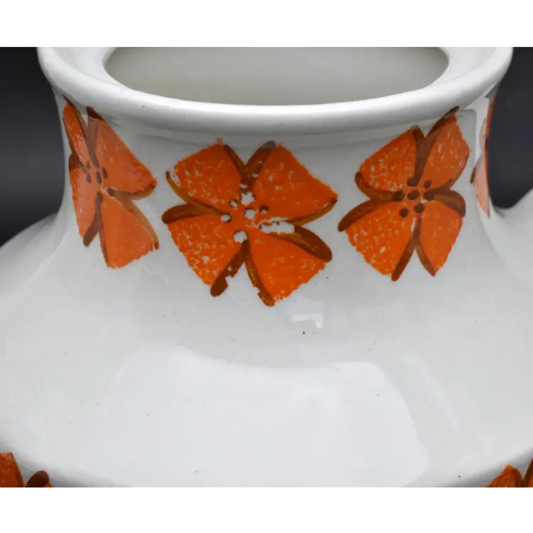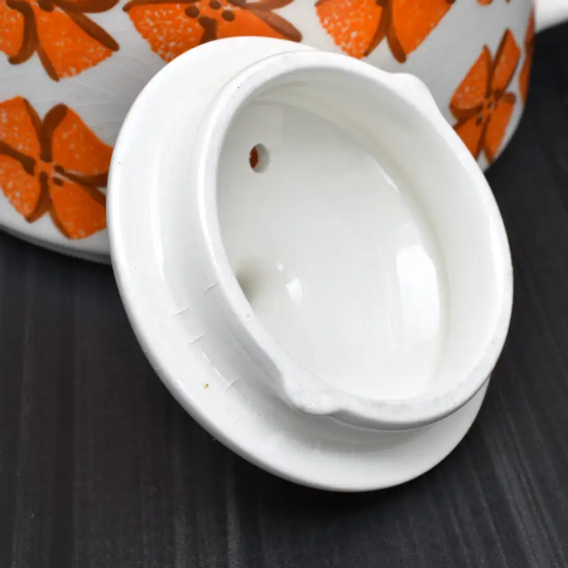 Please see the photos for its characteristics. There are no cracks, but there is crazing throughout. There is a chip in the spout and the some of the hand painted details are worn away. Despite these minor details, I thought that this beauty should be saved as it would be a great accent to any mid-century modern home decor.