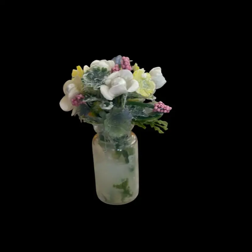 Artisan made plastic floral bouquet with glass vase. In nice condition. 2”