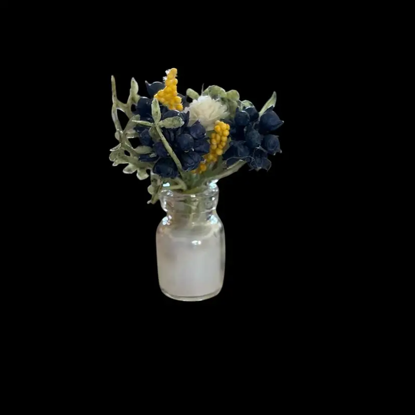 Artisan made plastic floral bouquet with glass vase. In nice condition. 2”