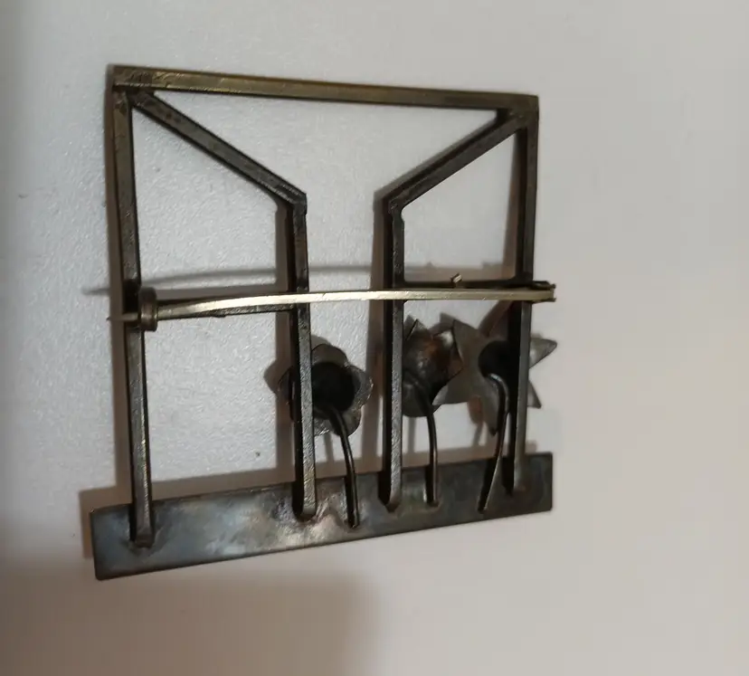 Brass and Copper Metals Make This Artisan Made Pin Depicting Spring Flowers in The Window! Your Choice of Background Changes With Whatever It is Pinned On! Skillfully Made and Sturdy! 2.25" x 2.25" Could also be a great addition to an assemblage piece!