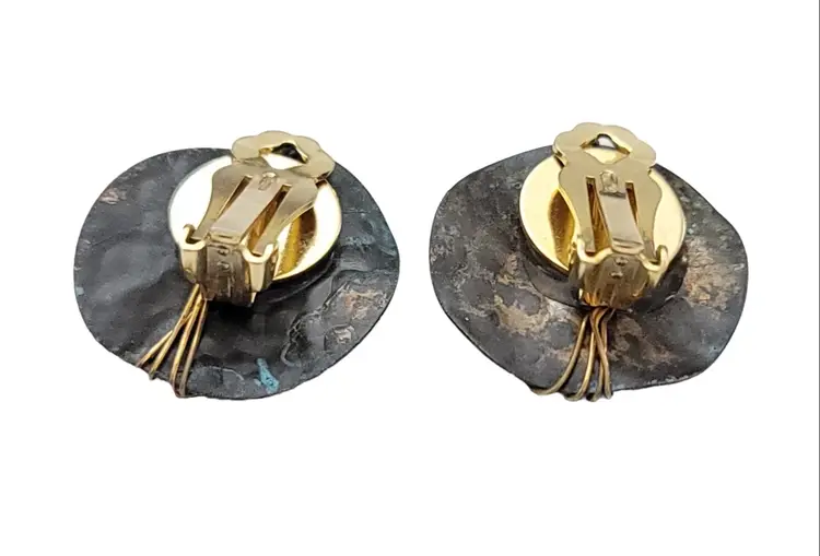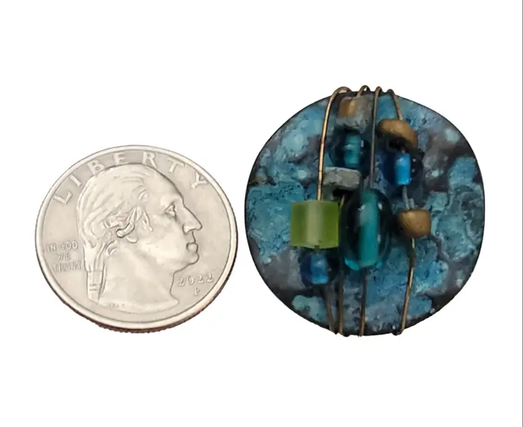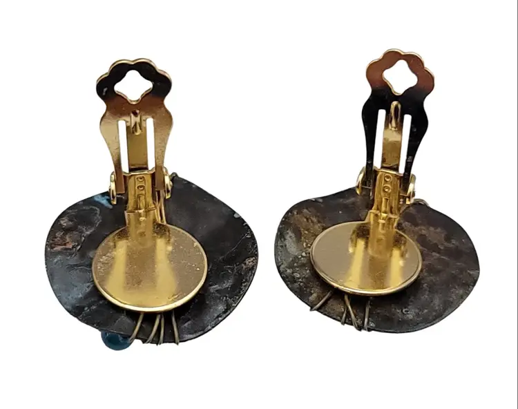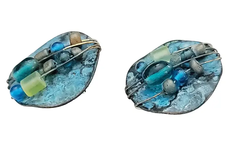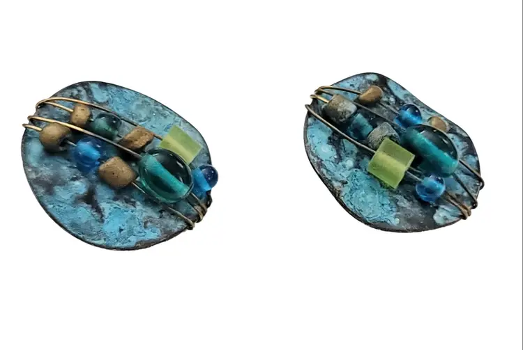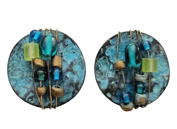 These earrings have plenty of earth color in an Artisan style, the perfect accessory to wear while relaxing with your favorite cold beverage at a party by the lake, a sidewalk cafe, or your own backyard. Features a circular base metal blue enameled, brass tone wire across the middle part with threaded multicolor beads in varying shapes. Each earring measures approximately 1.1 inches in diameter. Finished with clip-on fittings at the back, that are easy to put in and take off. Suitable for both pierced and unpierced ears.