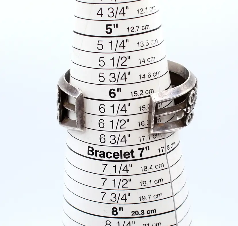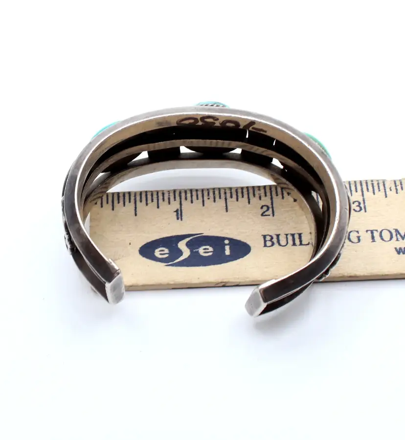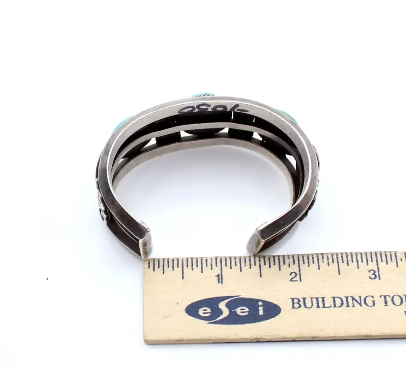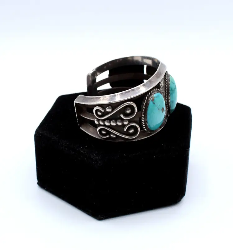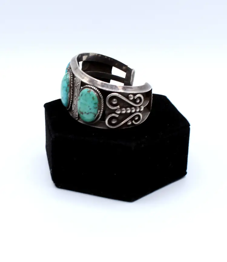 Amazing unsigned turquoise cuff. This cuff is quite unique with three blue green matrix stones set in a smooth bezel and surrounded with twisted wire design. The stones are separated on a heavy gauge two rail cuff with hand stamp decorated panels, flowing down the cuff sides is a twisted design with dots resembling a butterfly on overlay. Assumed Native or Artisan. Inner diameter 5.5", gap 1.25", 1 3/8" wide. Buy with confidence, all items are tested with XRF and Presidium analyzers.
