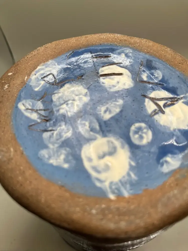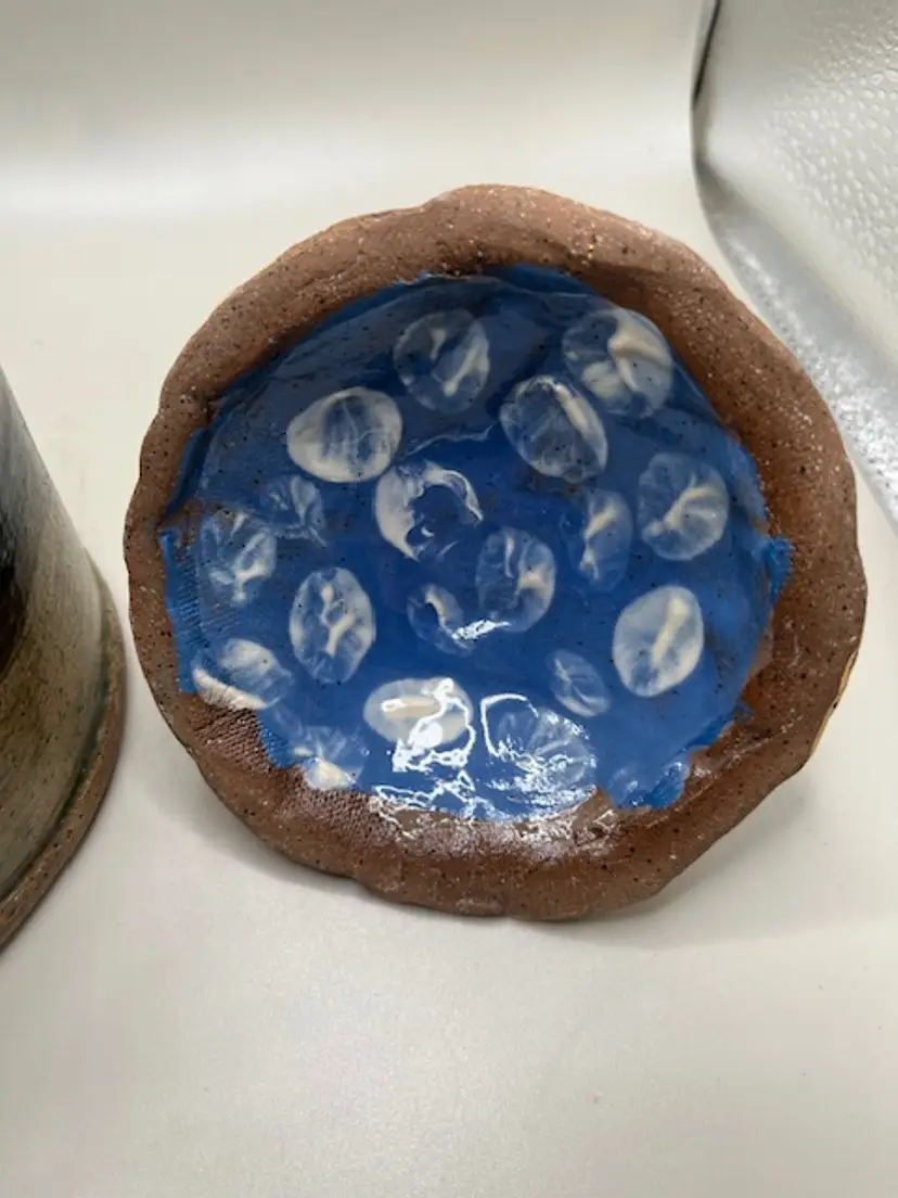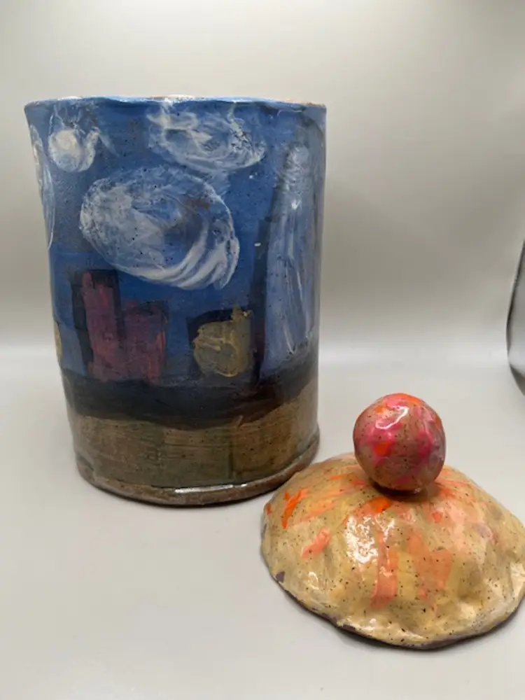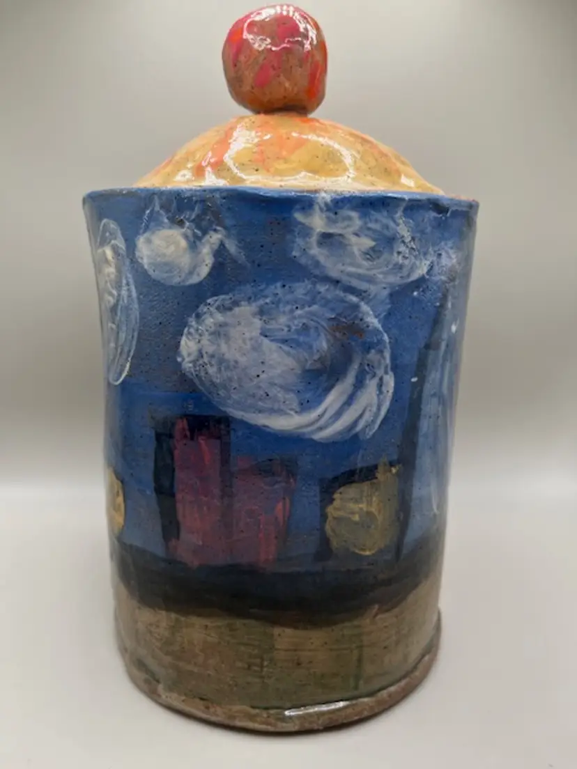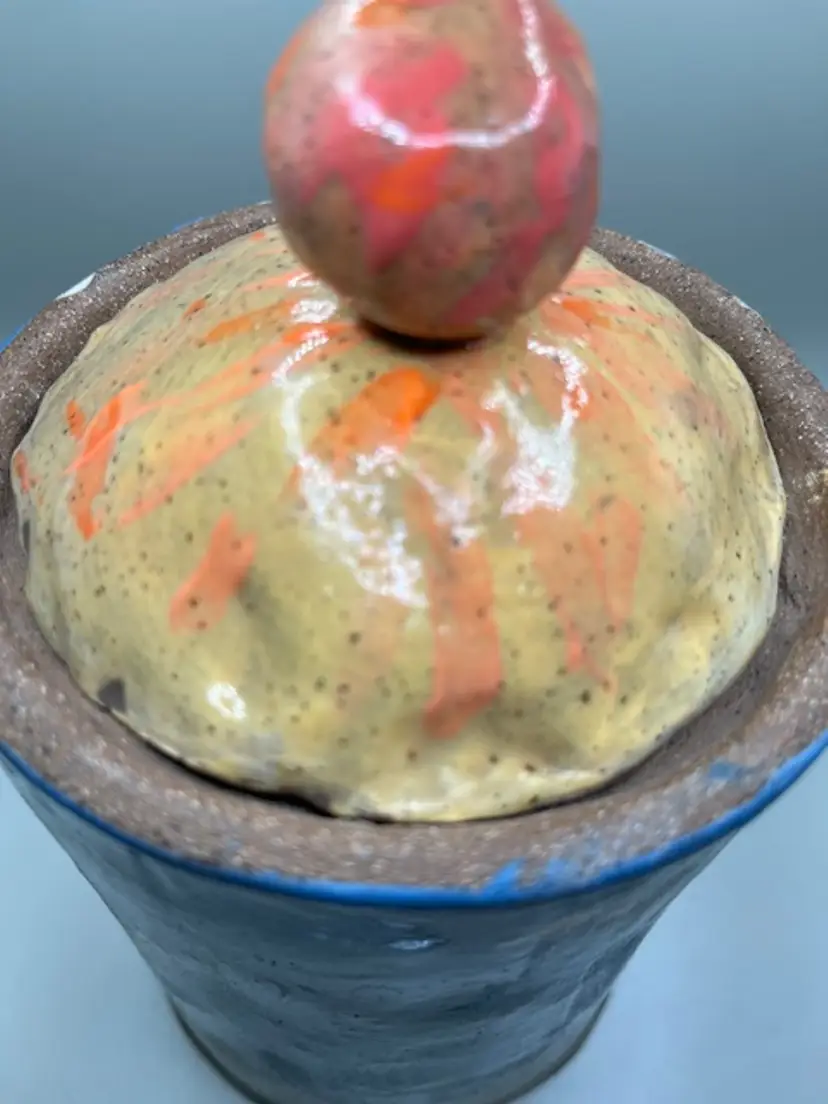 This piece is similar to the tsubo style jars, with a lid topped by a decorative finial. Decorated with abstract blue, white, red, yellow and salmon glazes, giving it a unique, artistic appearance. A charming hobbyist piece! Measures 9.5 inches tall with lid.