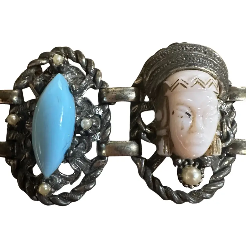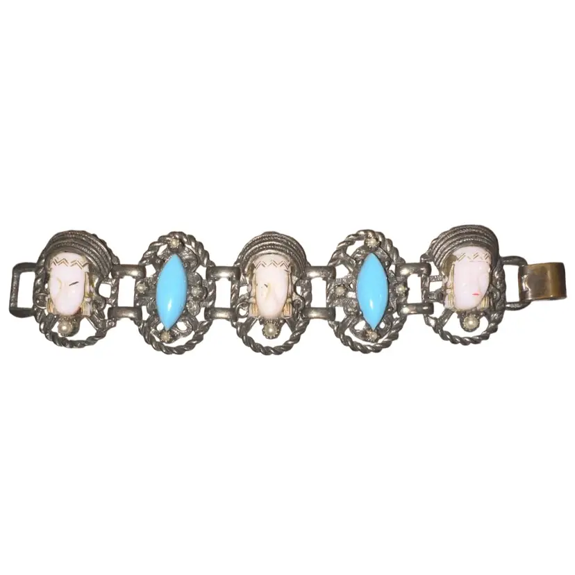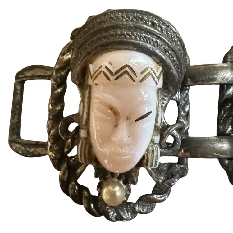 AS IS Vintage SELRO SELINI Panel Bracelet with Whitish/Pink Asian Princess Faces Paint wear on faces (if you are talented you could repaint) Or just wash off the paint altogether for a nice clean look. 7” in length x 1.5” height
