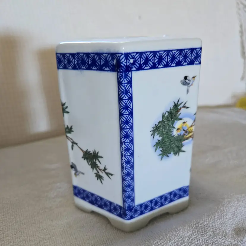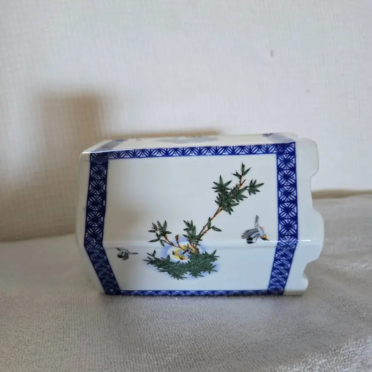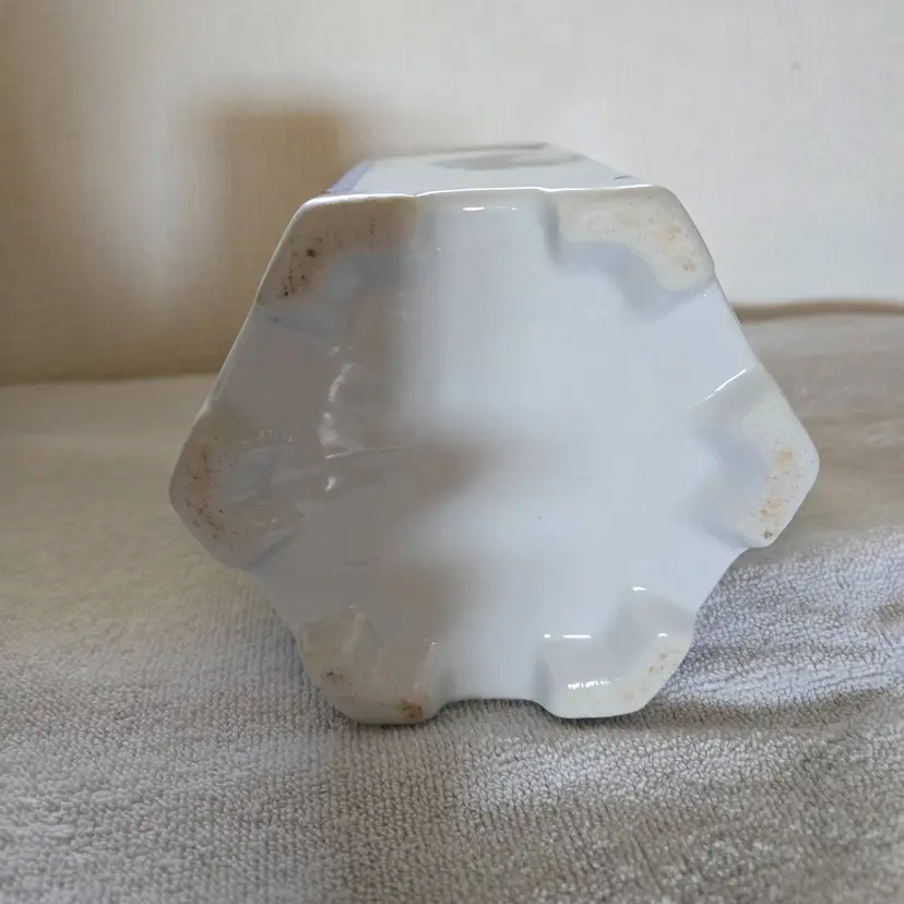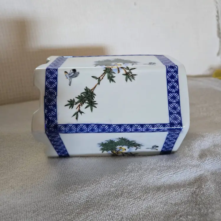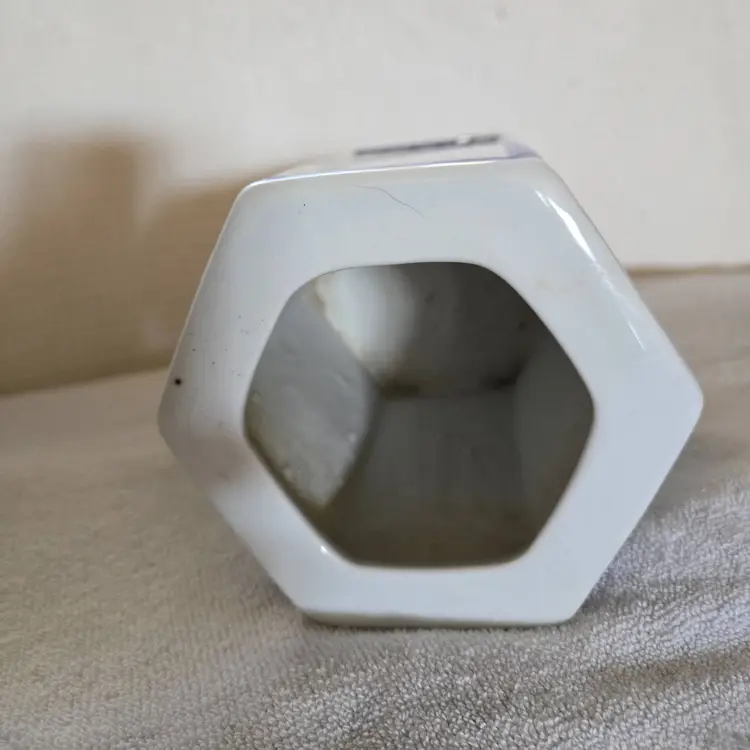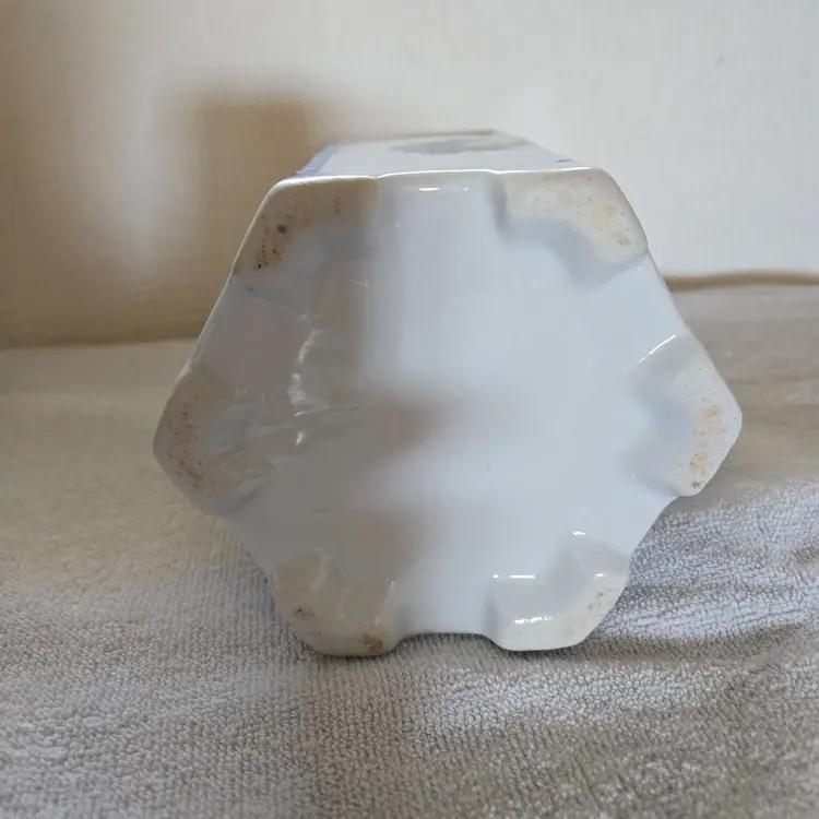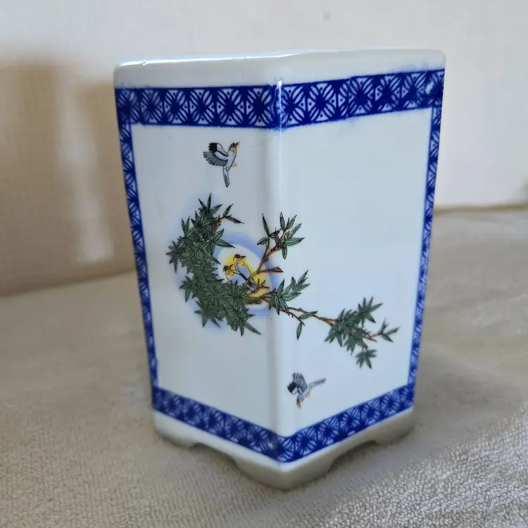 White with blue trim all around. Features tree branches and birds and is hexagon shaped. No markings or signature. Probably was used as a planter. There is some dirt residue in the bottom and some discoloration on the bottom. No chips , cracks or repairs. Stands 5 1/2" high and is 4 1/2" wide.