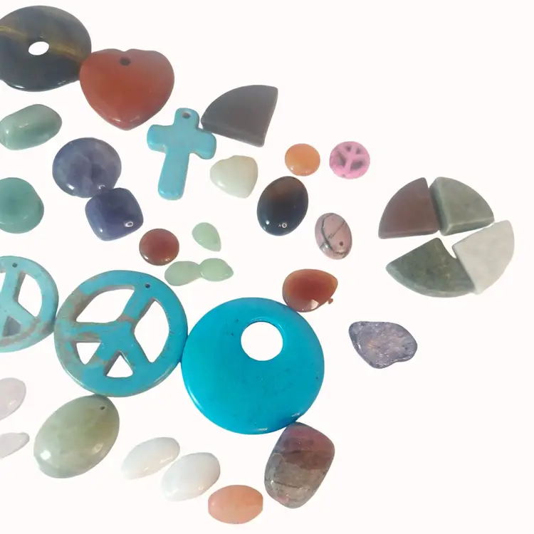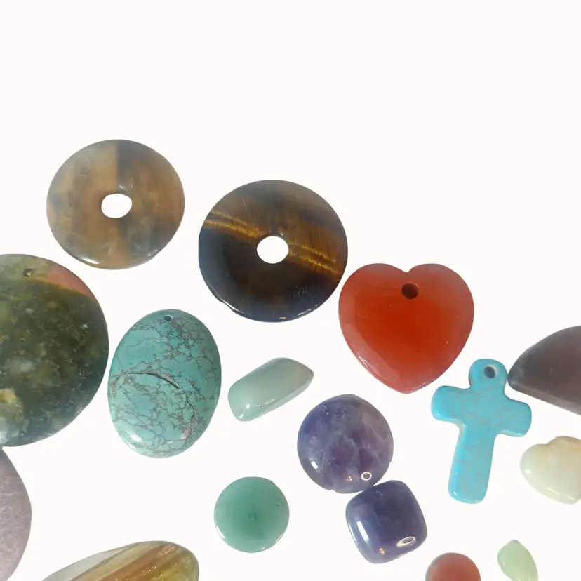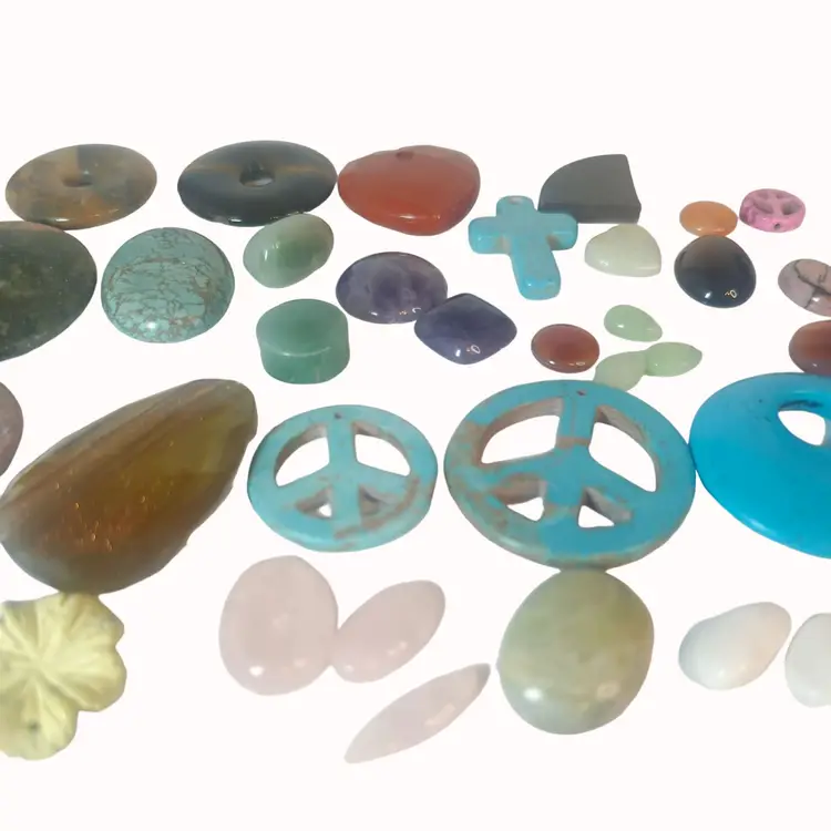 • Assorted shapes: hearts, crosses, peace signs, rounds • Various gemstone types included • Drilled and undrilled • Ideal for jewelry making • Unique and colorful designs • Ready for crafting
