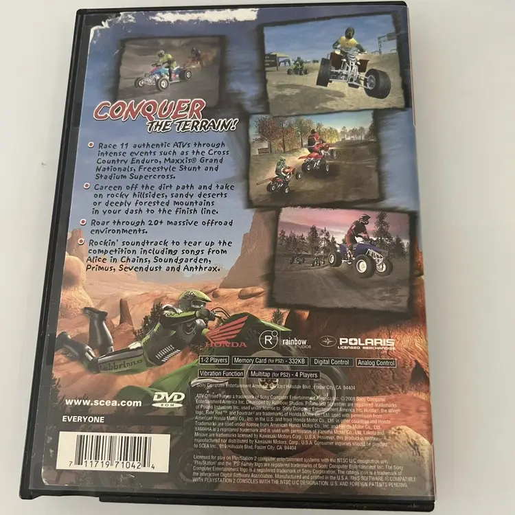 Region Code: NTSC-U/C (US/Canada) Unit Type: Unit Release Year: 2001 Features: Complete Edition, Manual Included, Multiplayer MPN: 689535762579 Unit Quantity: 1 Publisher: Sony Computer Entertainment Rating: E-Everyone Genre: Racing Video Game Series: Atv Offroad Fury Series Platform: Sony PlayStation 2 Game Name: ATV Offroad Fury