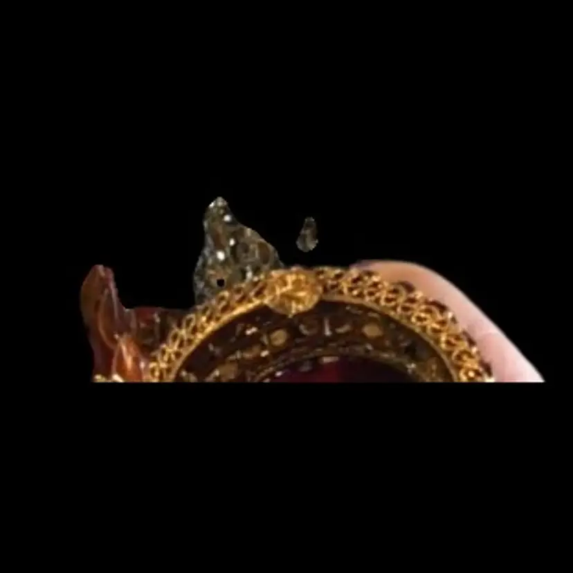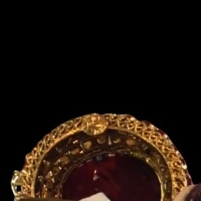 Austrian Marked in Cartouche "Made in Austria" LARGE Red Crystal Brooch. The large crystal in a tiered domed goldtone setting, is surrounded by a ring of smaller red crystals, prong set and accented with a filigree ruffle (resembles ribbon candy ruffle)