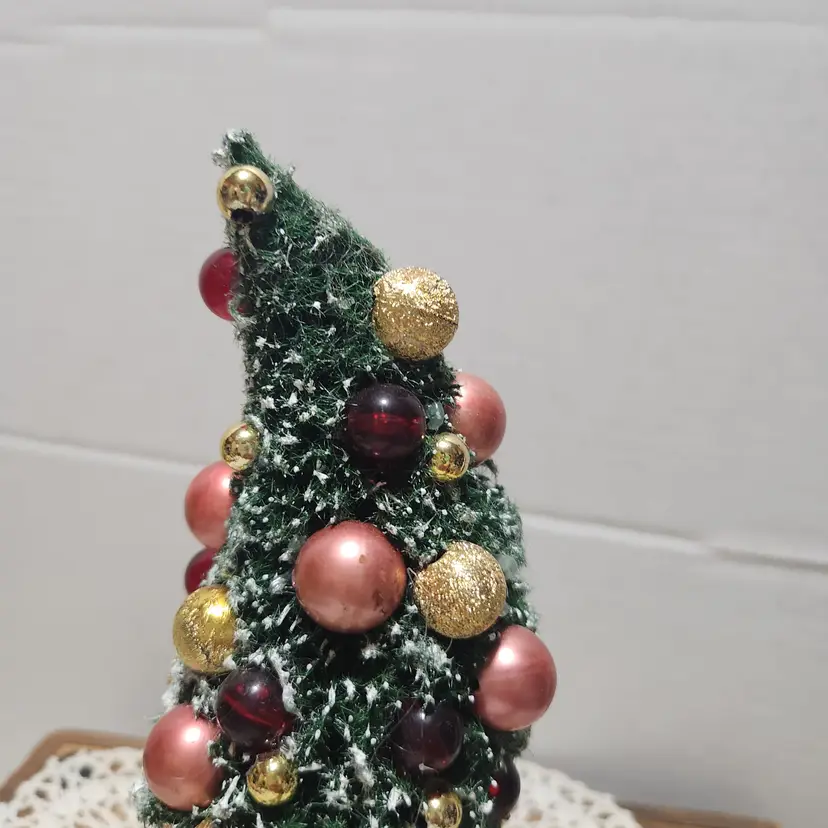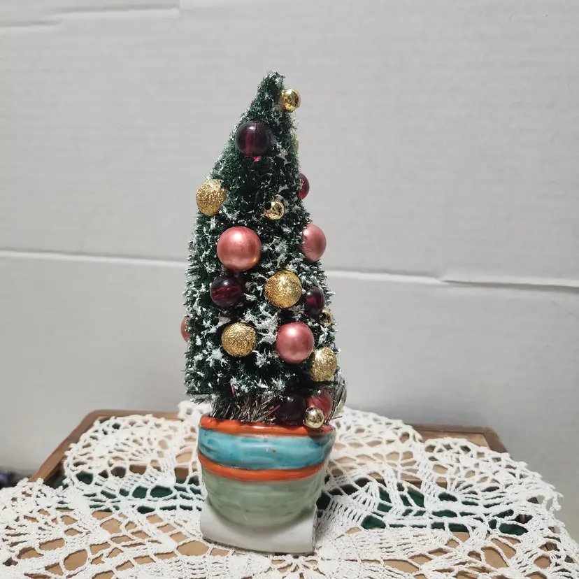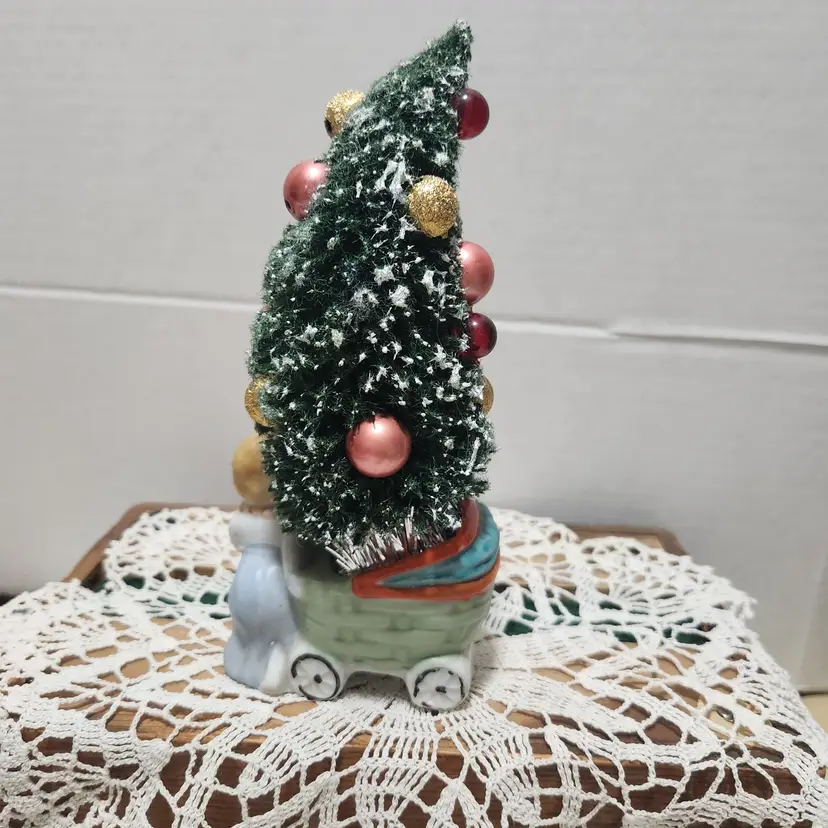 A sweet little lady pushing a carriage. Except her load is a bit heavier than a baby! A bottle brush tree with beads from a vintage necklace are scattered to resemble ornaments. A glass vintage ornament is tucked in near the bottom as well. About 6 inches high