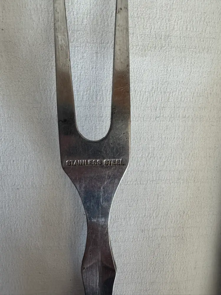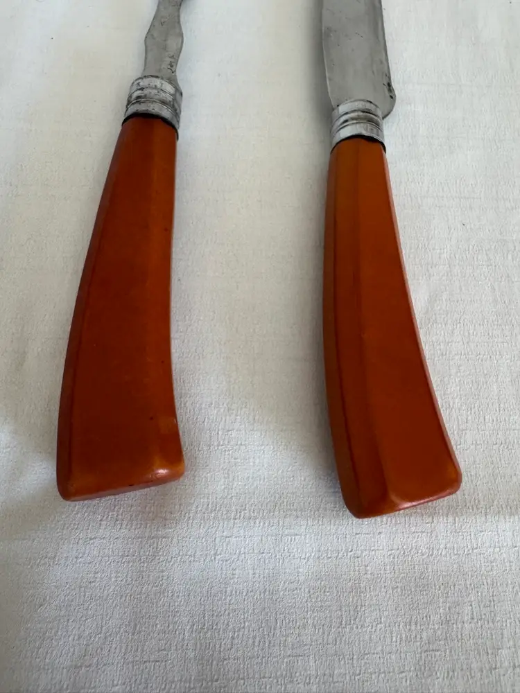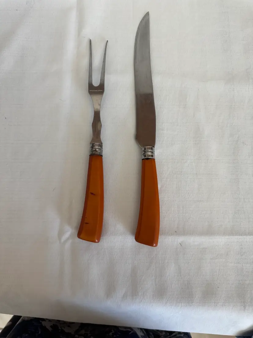 This set is a butterscotch Bakelite handle carving set. Stainless steel blade and fork. Carving tool is just over 12” and for is 11”. Perfect set for the holiday season.