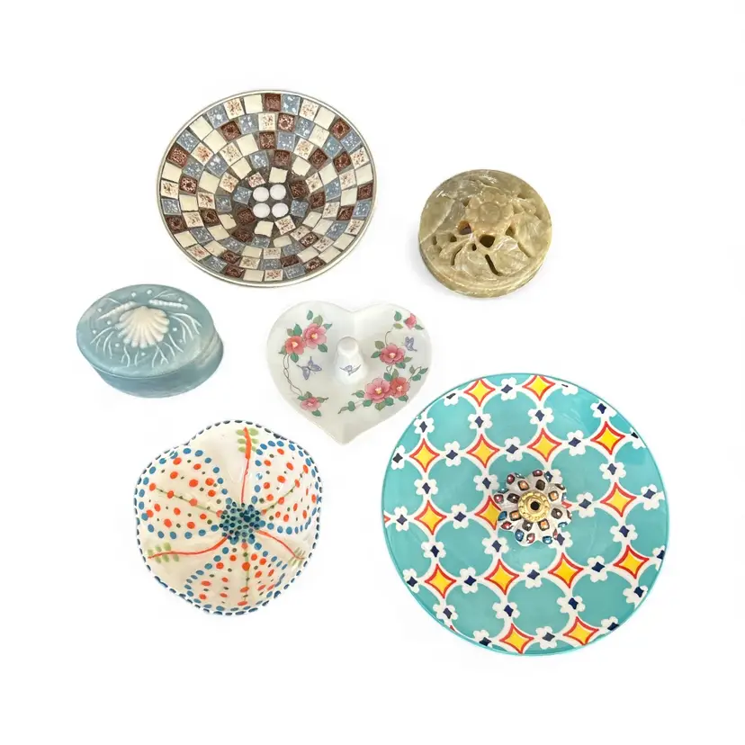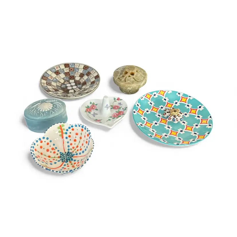 6 items -Jade Stone Box -Teal Dish -White Polka Dot Dish -Mosaic Tile Dish -Shell Box -Ring Holder