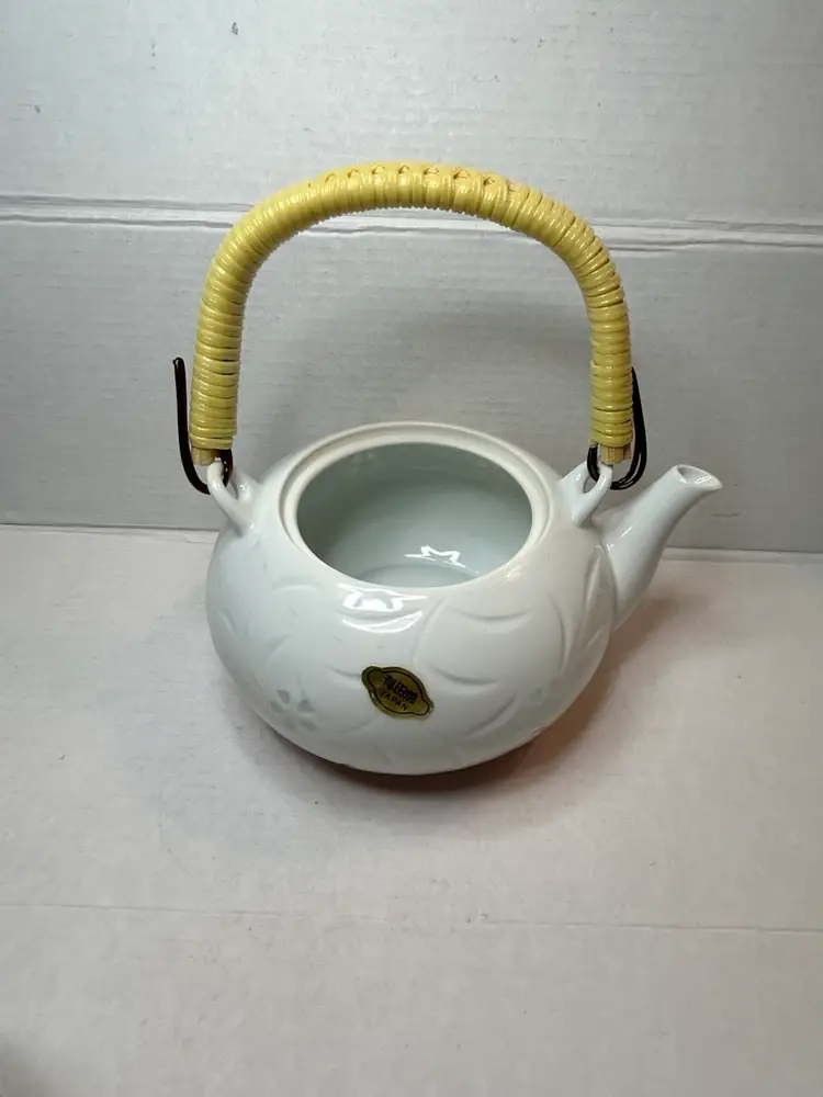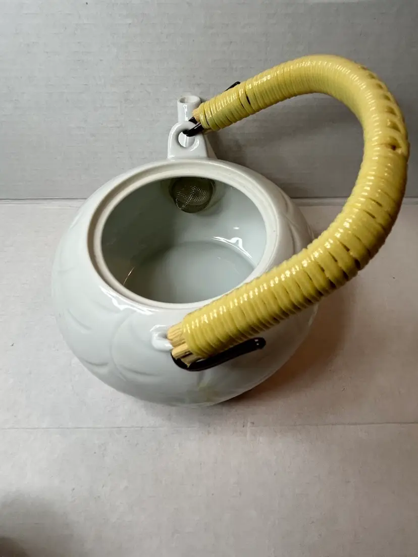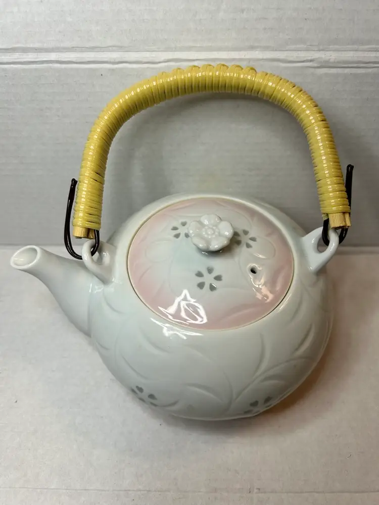 The teapot has a rattan handle and a flower-shaped knob on the lid.