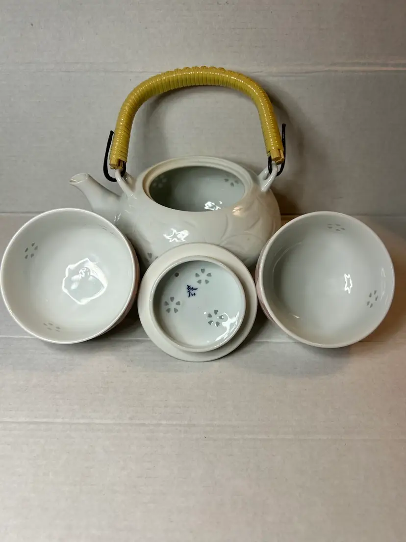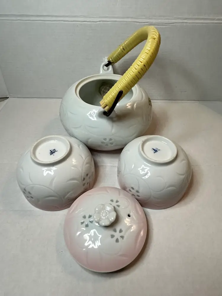 This is a Japanese tea set made of Arita ware porcelain. Arita ware is a type of porcelain from Arita, Japan, with a history spanning over 400 years. It is known for its durable, light, and thin quality.