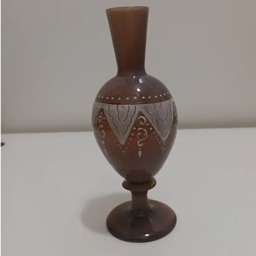 Beautiful Little Bohemian Opalescent Clam Broth Vase With White Enamel Highlights! The translucent colors vary from beige, pink, and gray depending on the light. Shows very little wear for its age. Nice condition; no chips or cracks. 6" T x 2.5" W