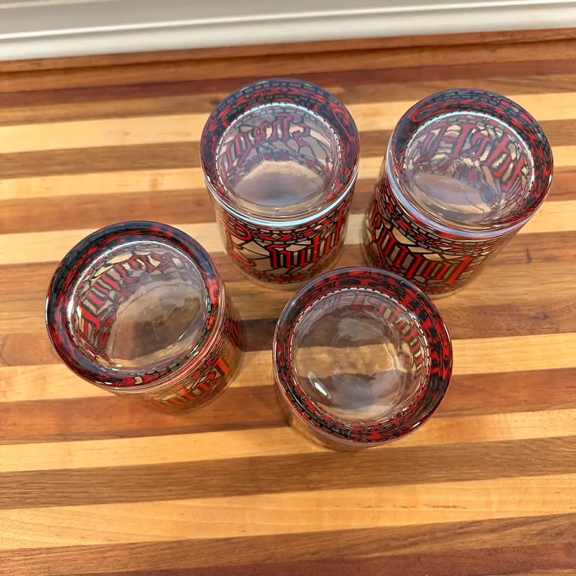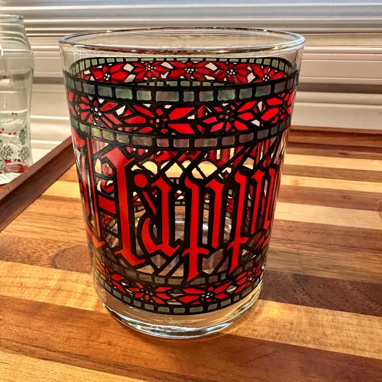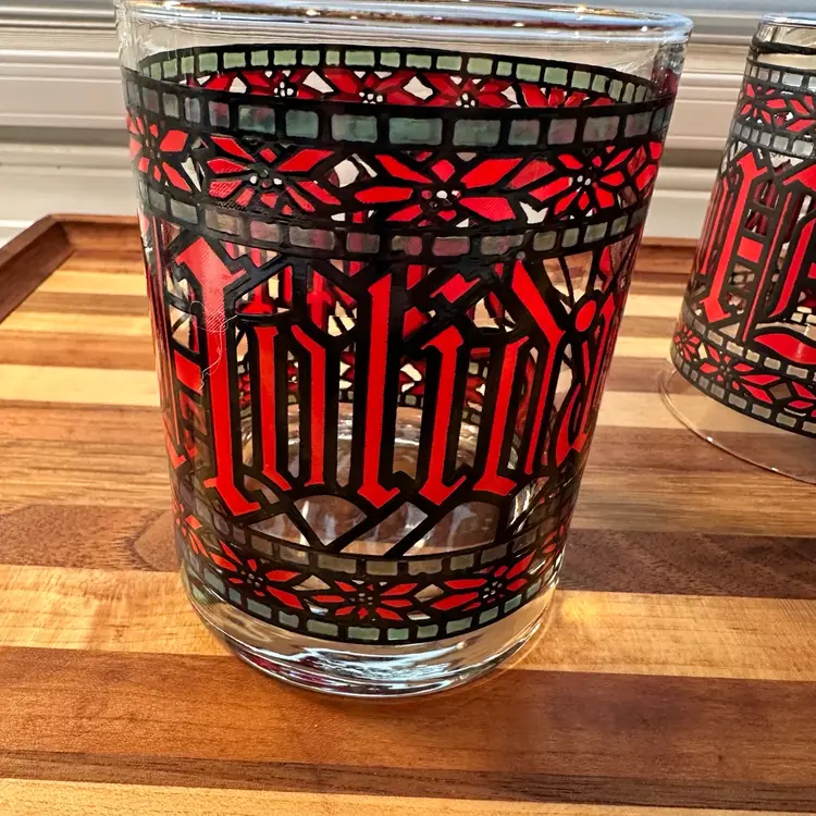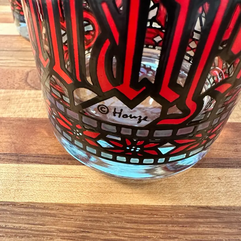 Beautiful Set of 4 vintage "Happy Holidays" glasses by Houze Glass Co. These "Happy Holidays" glasses are a classic example of Houze Glass Co.'s mid-century production. The design mimics the look of stained glass, with bold red lettering and black outlines. Will be great for Holiday entertaining!