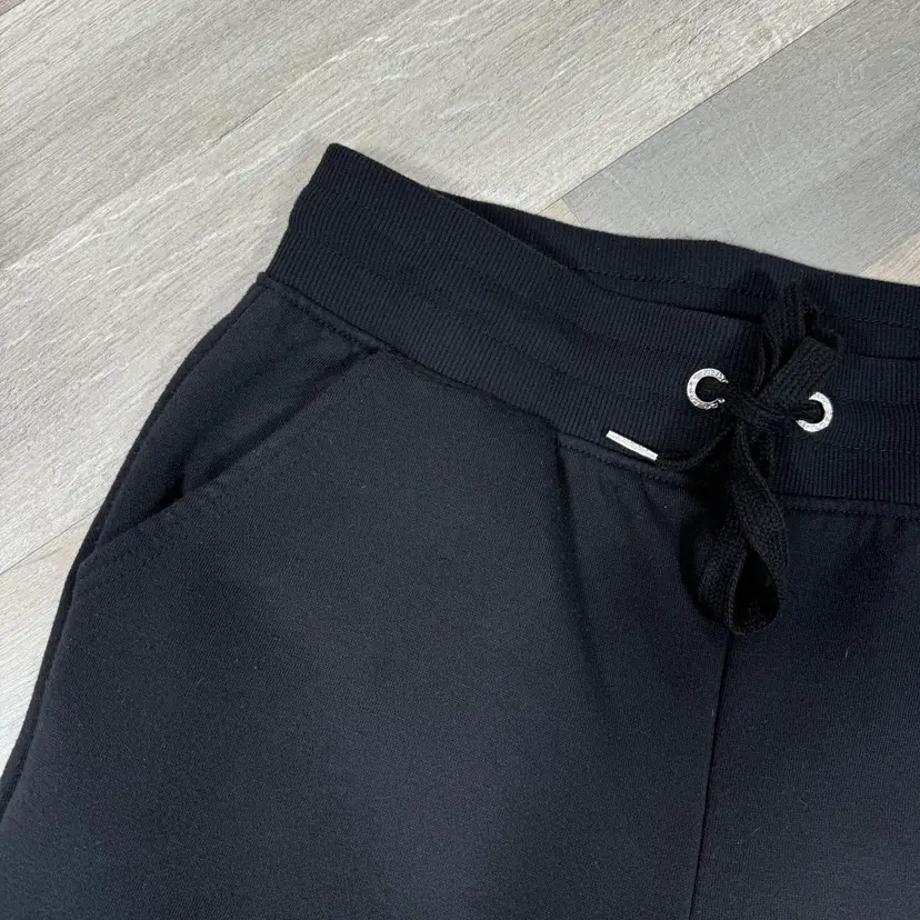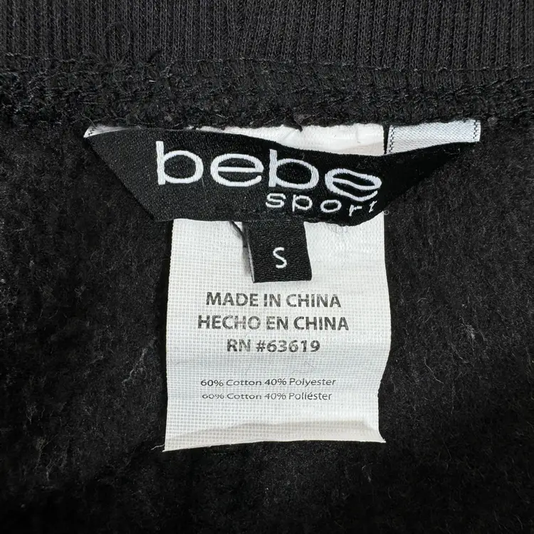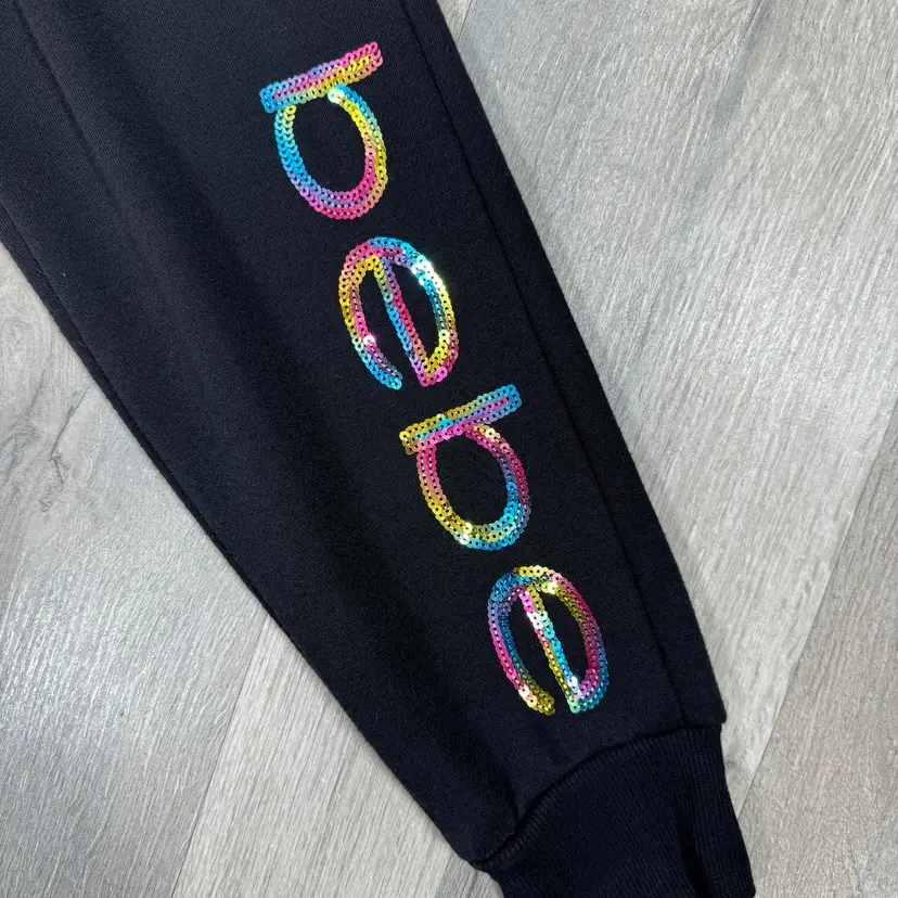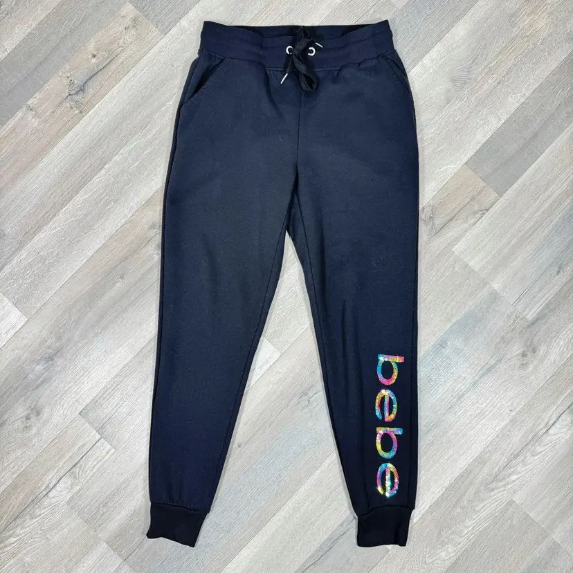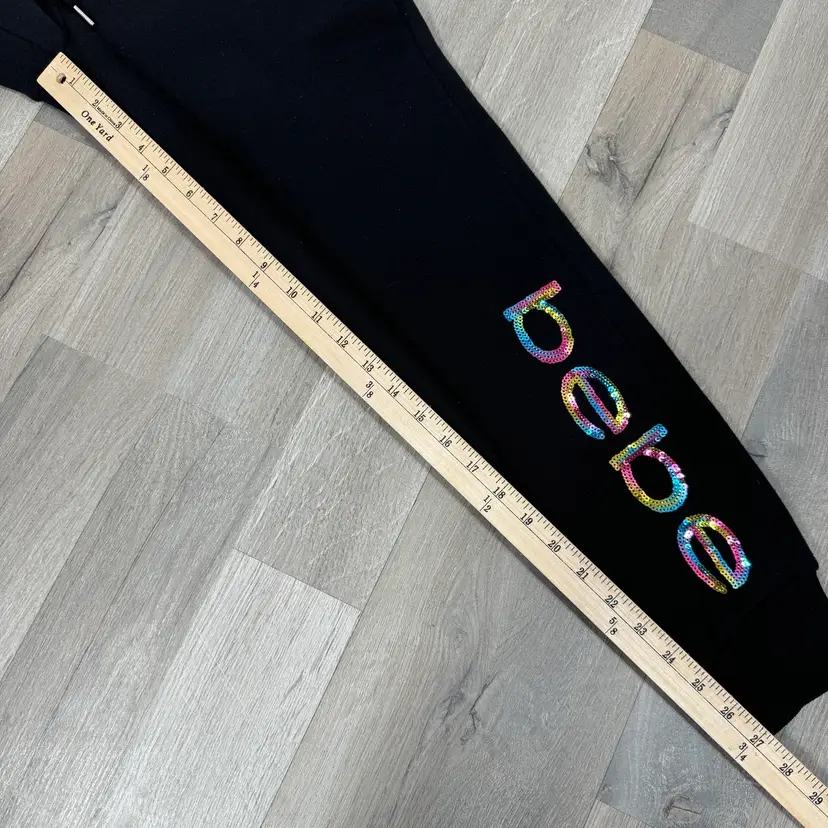 Dark onyx black Rainbow sequin Bebe leg logo Fleece knit Ribbed knit drawstring waistband Ribbed knit cuffs Front slash pockets