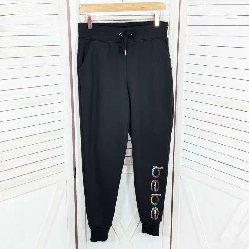 Bebe Sport Rainbow Sequin Logo Fleece Jogger Pants Black