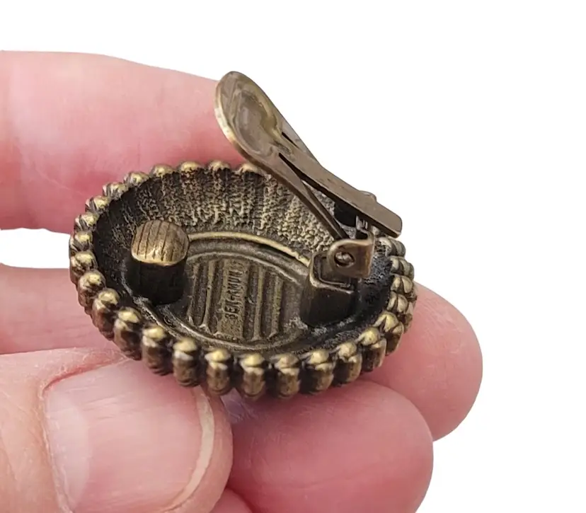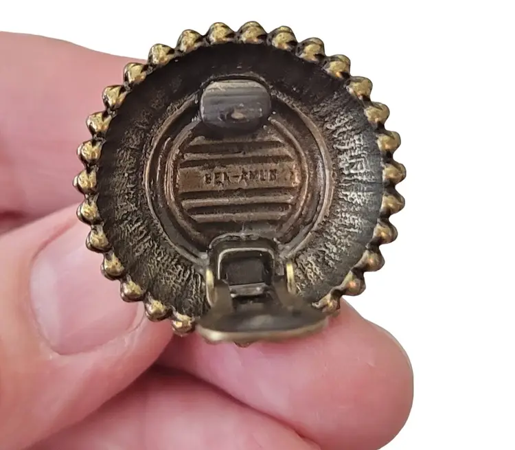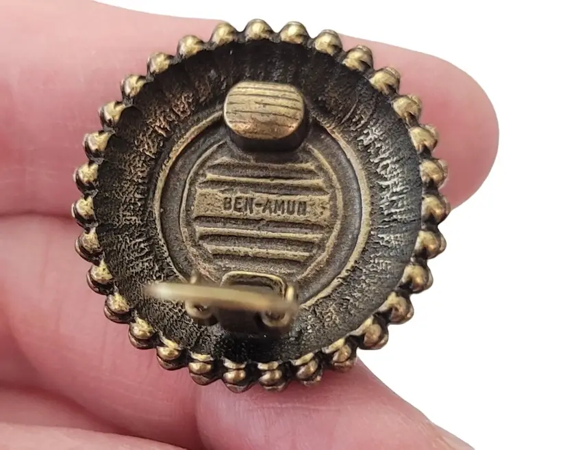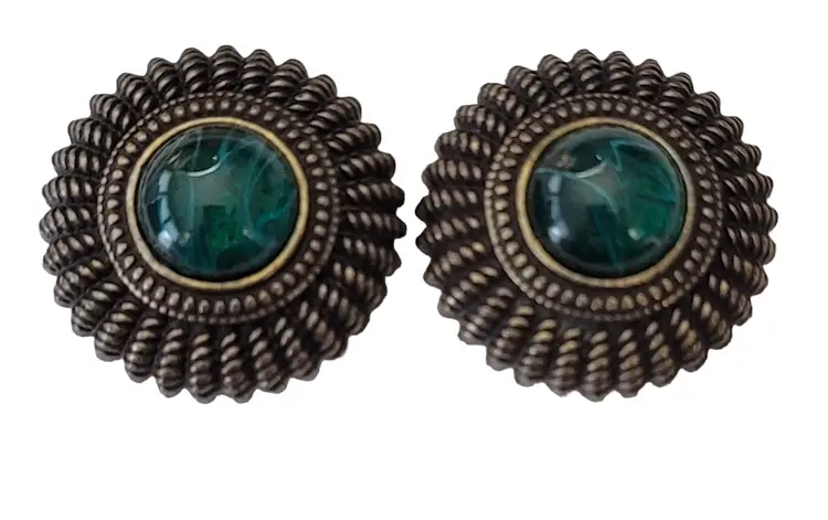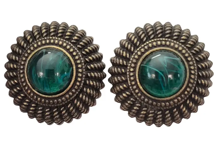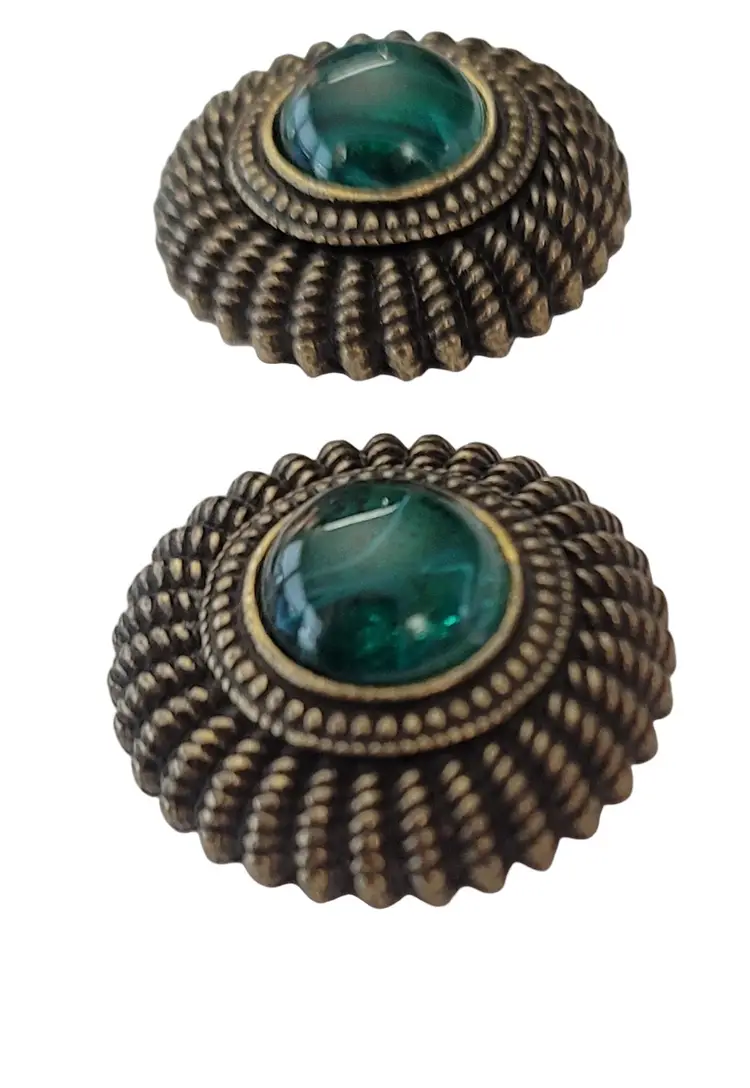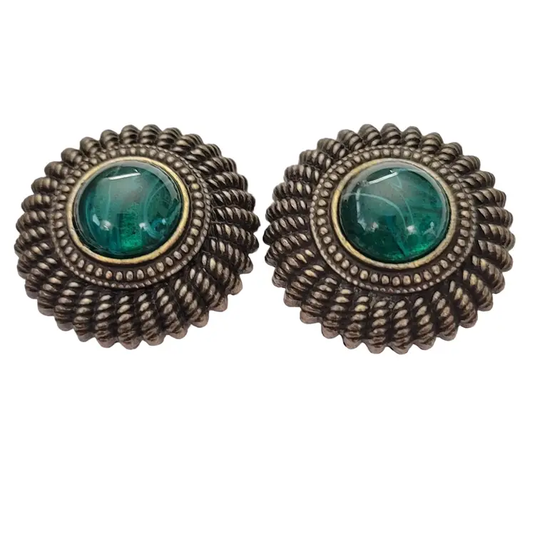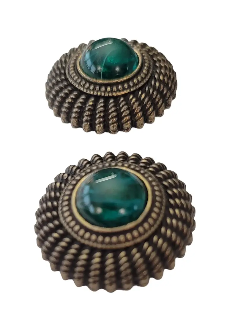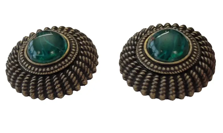 Add a touch of luxury to your ensemble and feel utterly gorgeous with these Ben Amun Clip Earrings. The emerald green glass cab has marred patterns and is set at the center of ornate twisted rope-like borders, crafted from high-quality materials and with great attention to detail. Each earring measures approximately 1.1 inches in diameter. Both earrings are hallmarked BEN-AMUN on the reverse. The clip-on closure is designed to keep these earrings secure on your earlobe, ensuring they stay put while you wear them. These signed statement clip-on earrings are elegant and will make a perfect finishing touch to any outfit, looks great for all occasions.