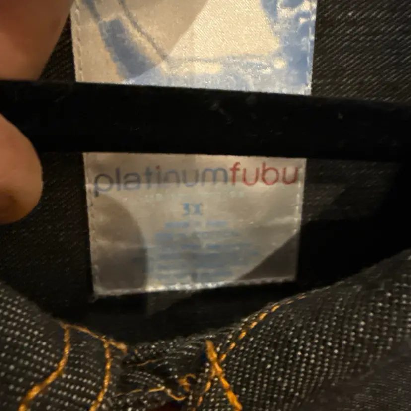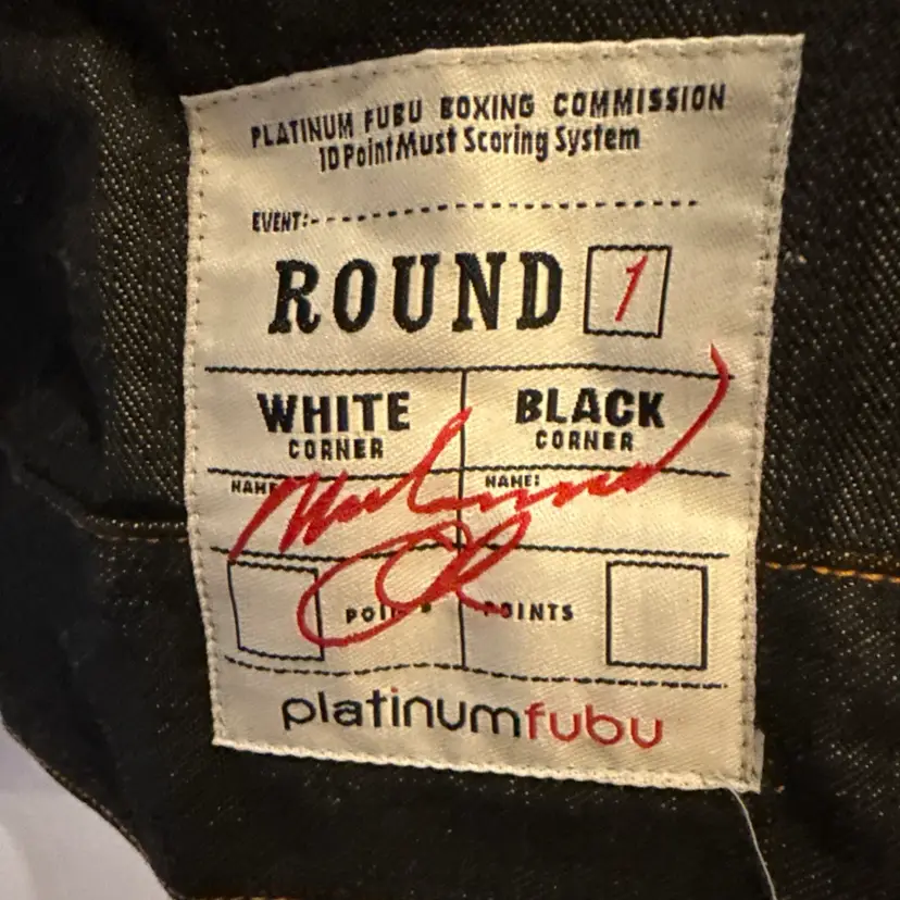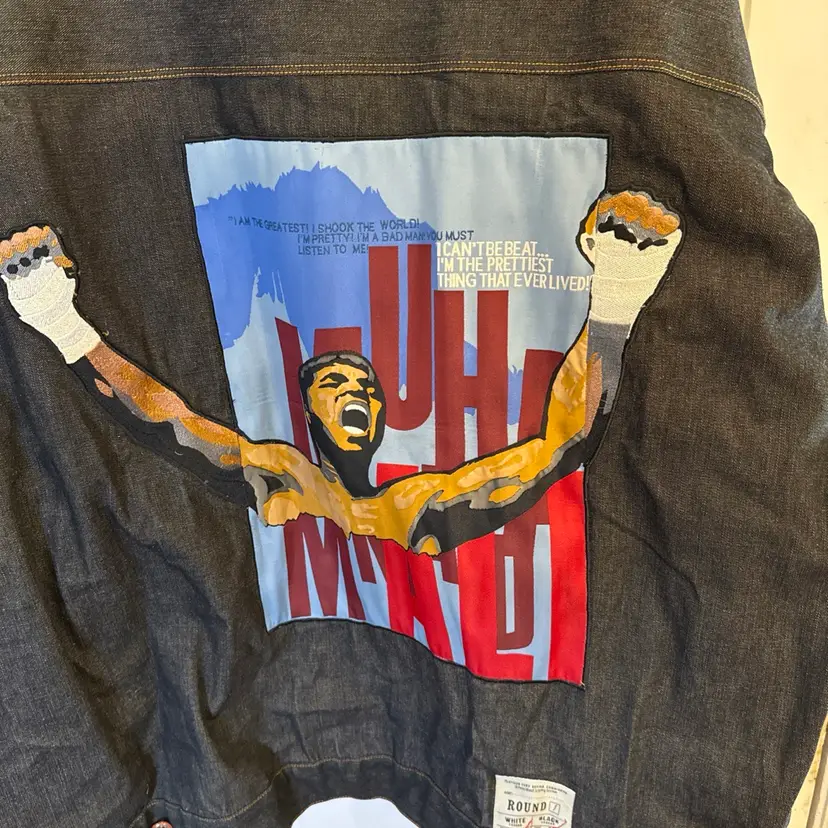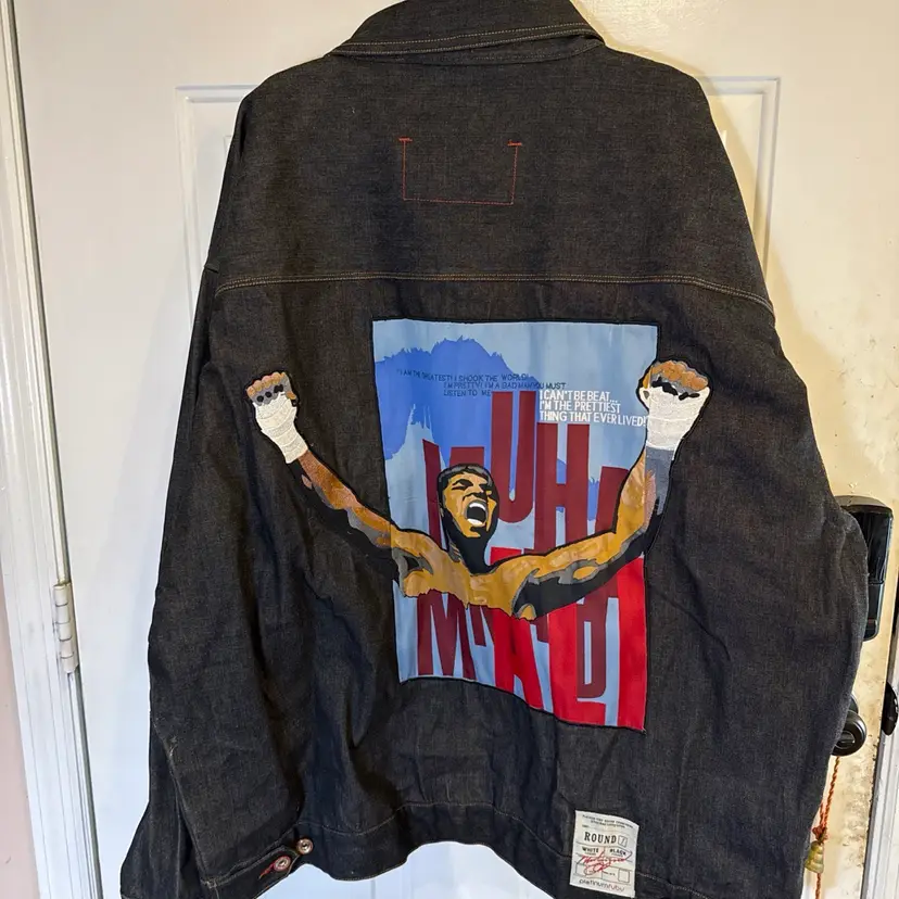This BIG & TALL Platinum FUBU Denim Jean Jacket features an embroidered design of Muhammad Ali, making a statement with its unique and designer theme. The long jacket in a solid blue color has a button-down collar and closure, with a relaxed fit for a comfortable oversized look. Made from denim fabric, this stylish jacket is perfect for men looking for a casual yet eye-catching outerwear option.