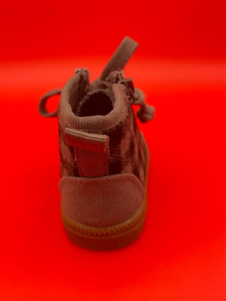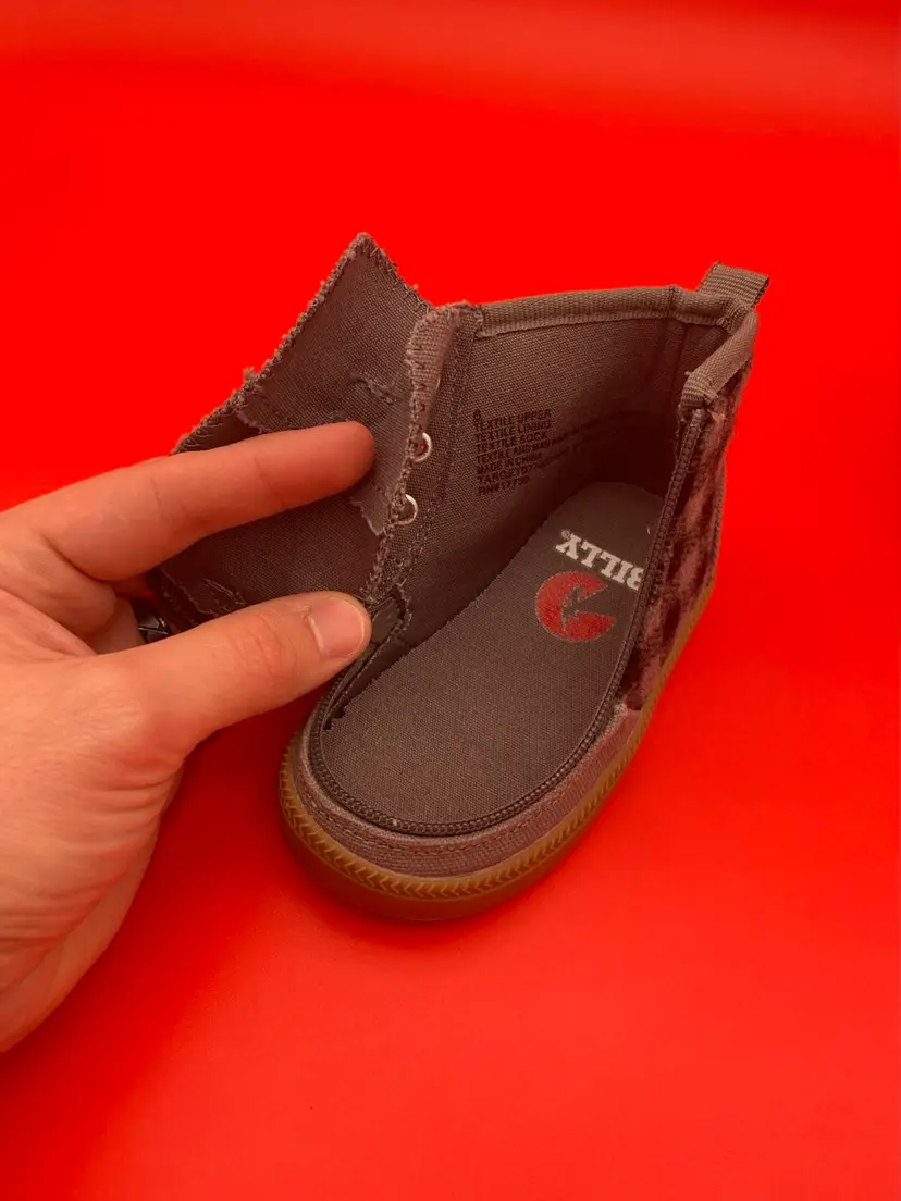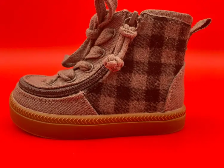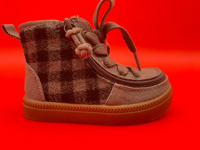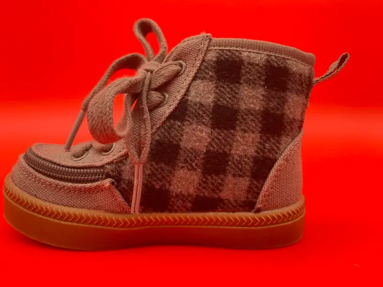 You are purchasing one pair of Toddler's Size 6 Gray Plaid Pattern High-Top Sneaker Shoes by Billy Footwear. The Plaid Pattern is a Flannel like material. These Shoes have Classic Lace-Up as well as a Wrap-Around Zipper, making the perfect for toddler's with AFOs. These Shoes are in overall great condition. No rips, stains or holes on the Material. No scuffing on the Trim. No fraying of the Laces. Insoles are intact without discoloration. Great Tread on the Bottoms (Never walked in). No issues with the Zipper.